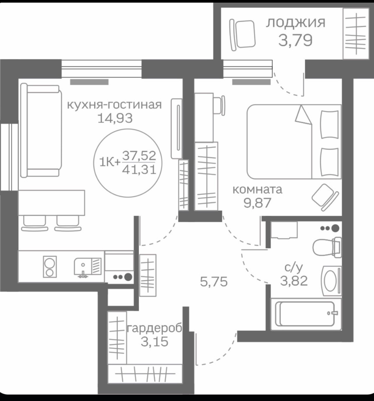 Общая площадь 37.52 м2