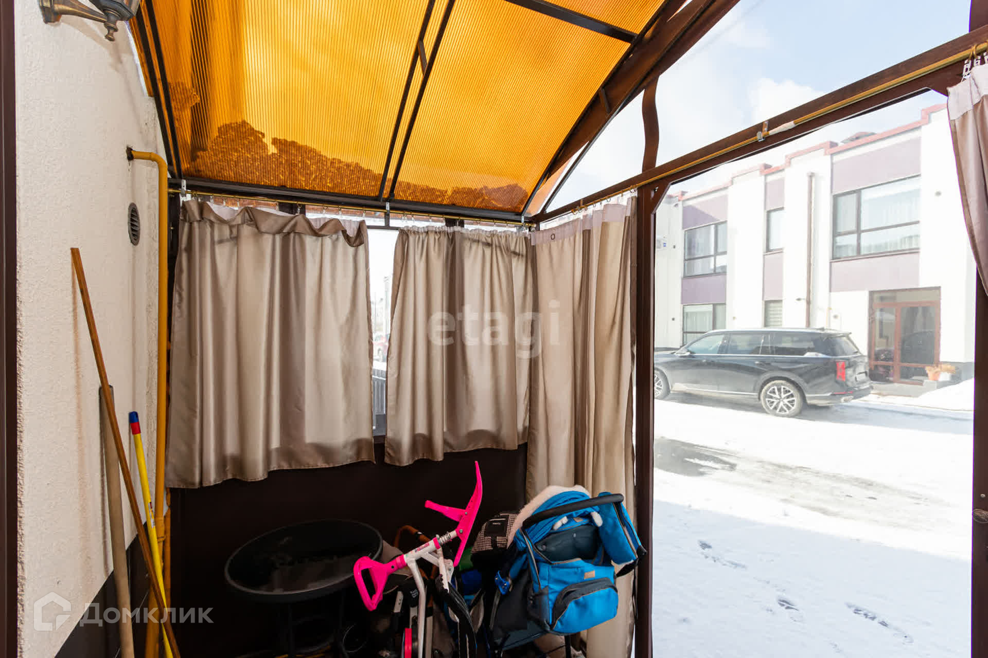 Над входной группой установлен навес из поликарбоната + обшит мягкими окнами - зимой нет необходимости чистить от снега входную группу.