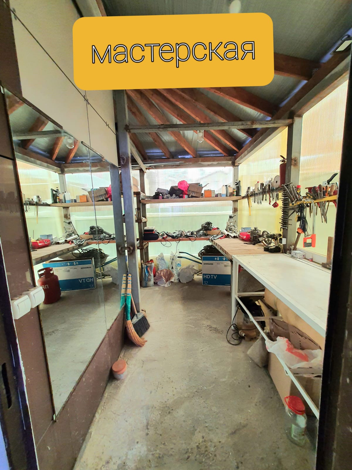 1 этаж: Застекленная веранда с панорамными окнами, мастерская с зоной хранения садового инвентаря и велосипедов, просторная кухня-гостинная и большая прихожая, два санузла: гостевой туалет и ванная комната, бетонная лестница на второй этаж отделанная плиткой.