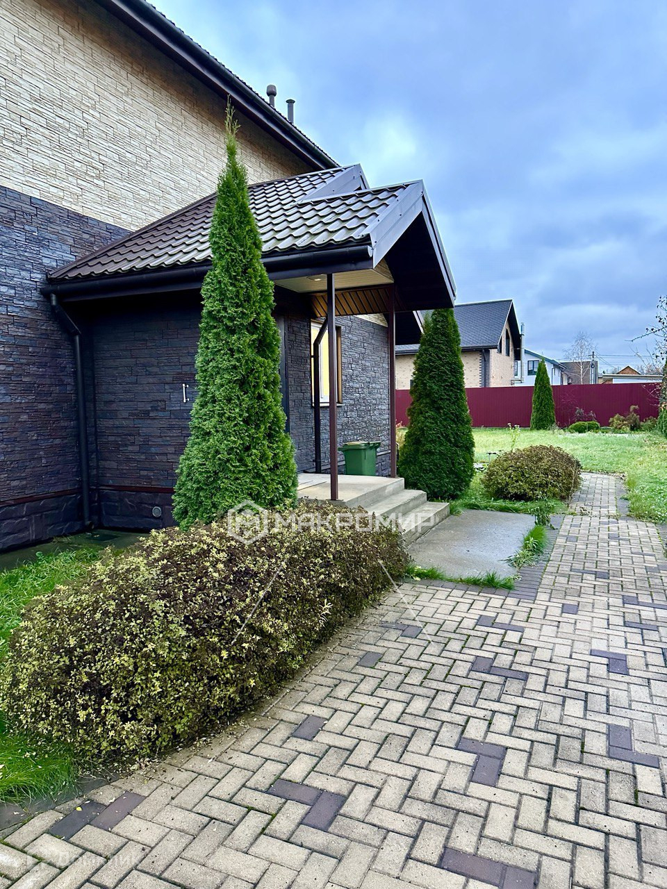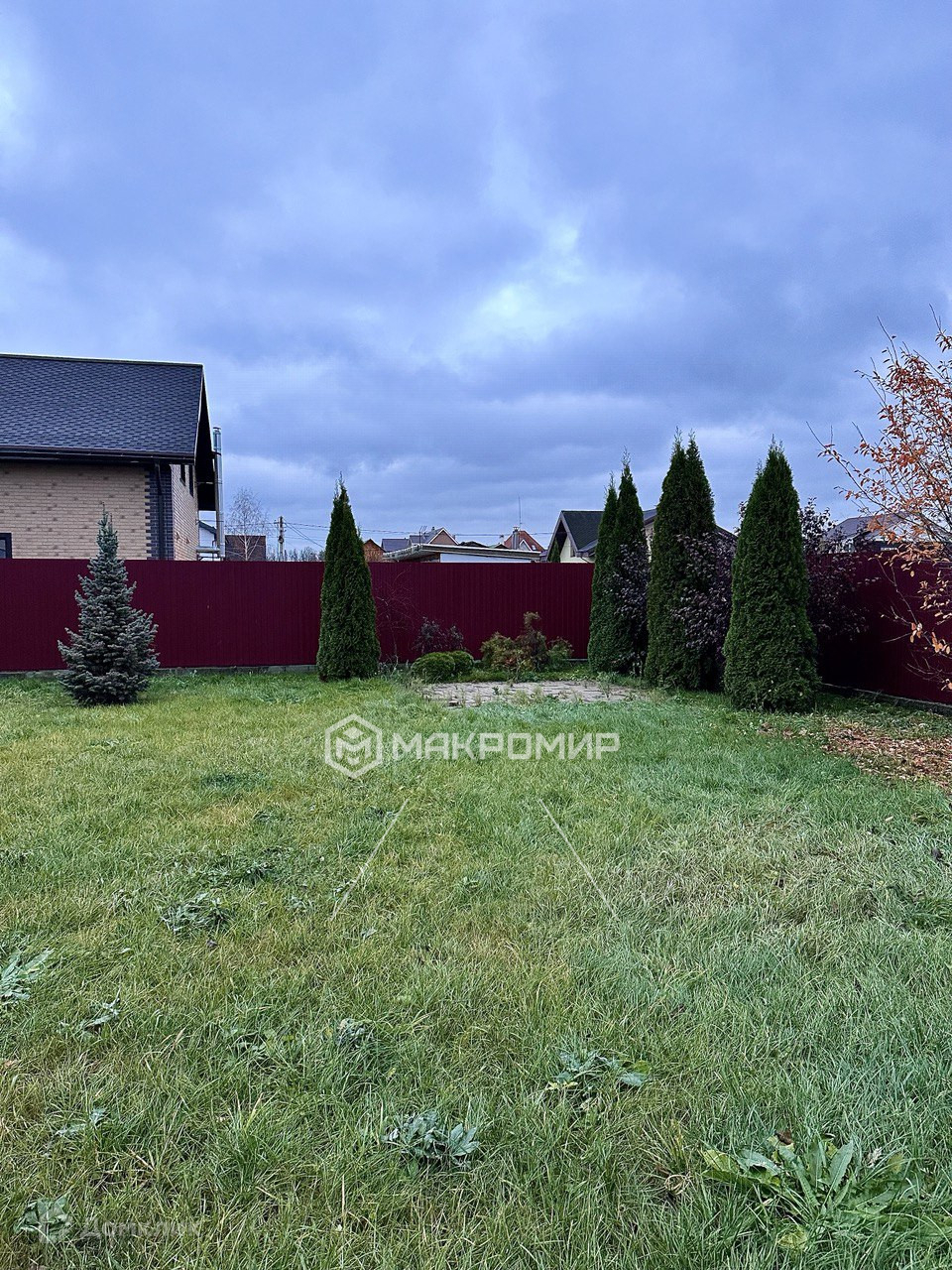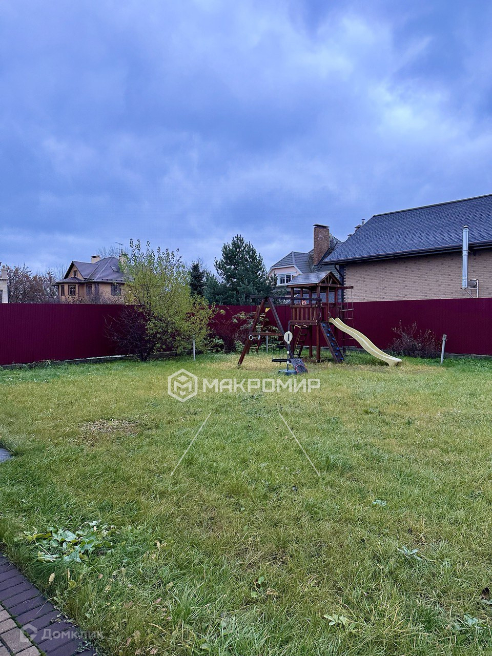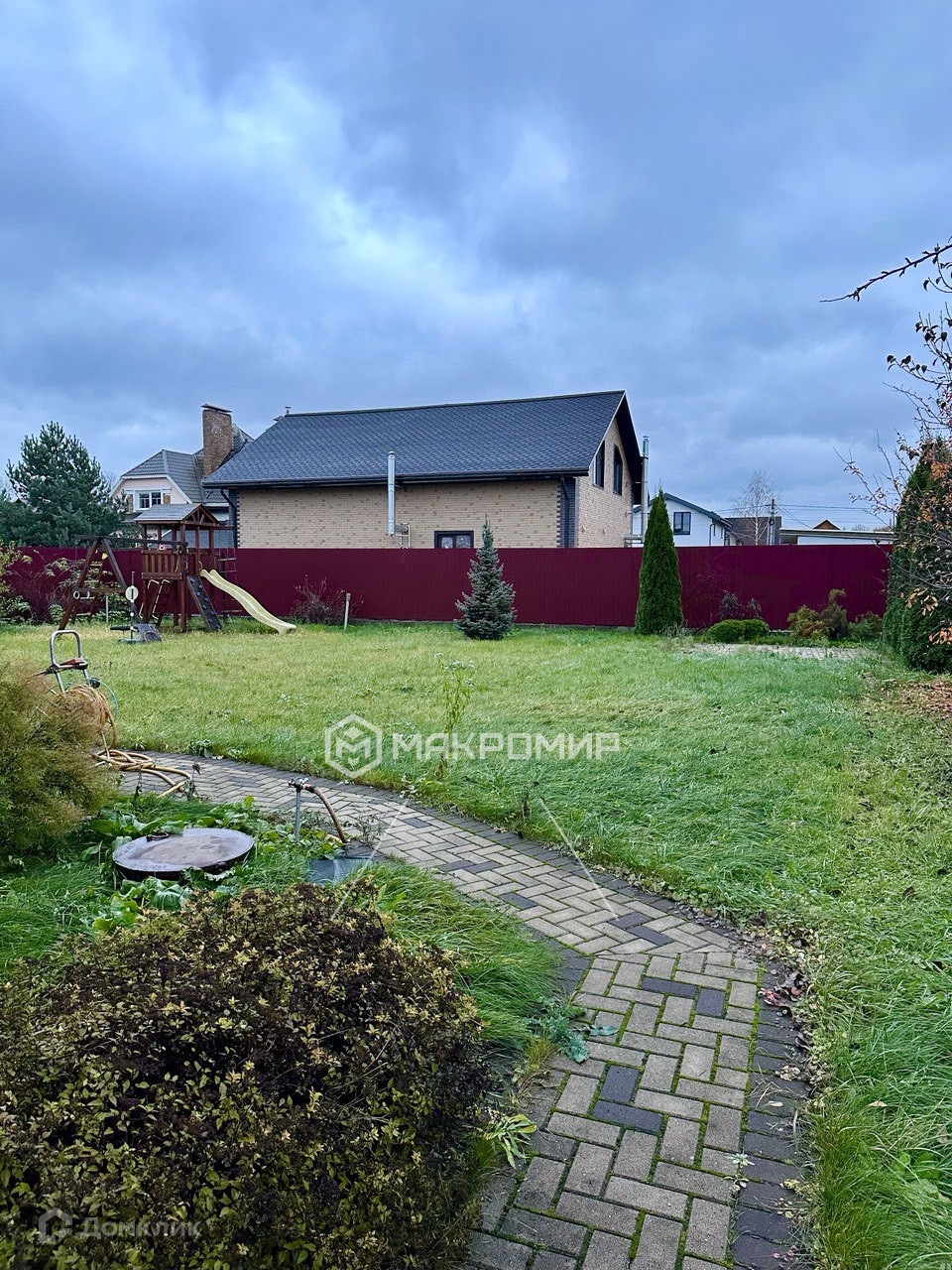 - Участок с детской площадкой, зоной для мангала, фруктовыми деревьями и декоративными кустами.