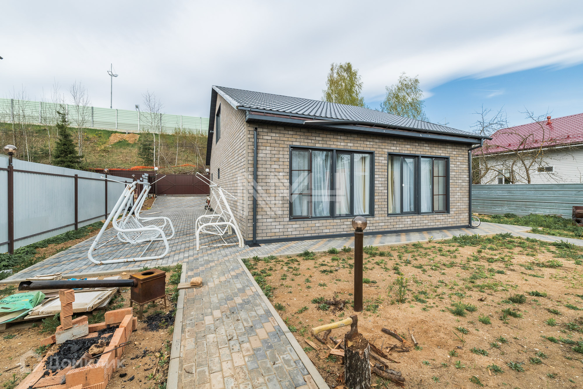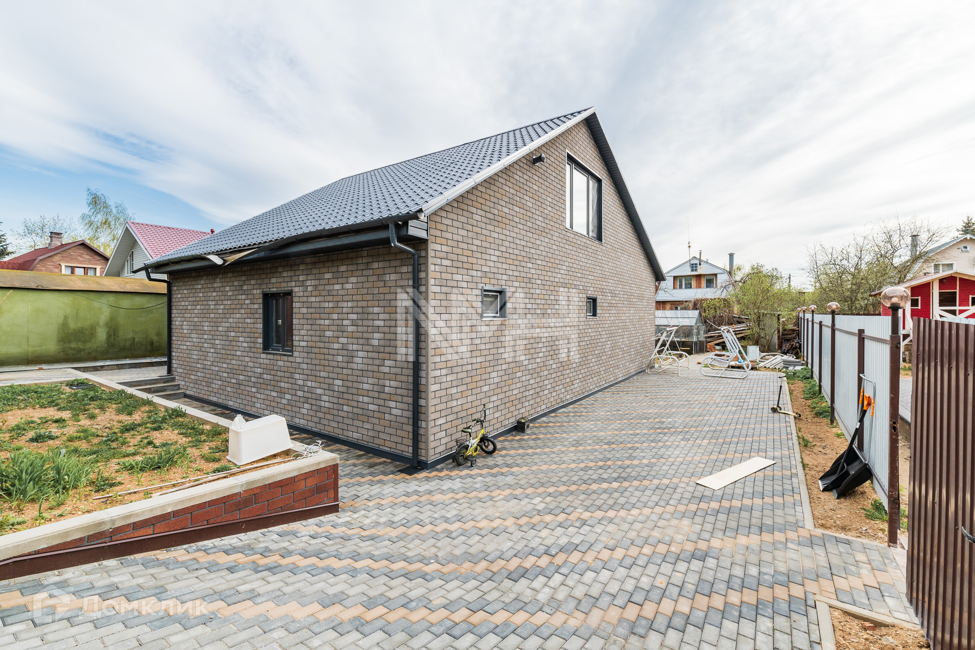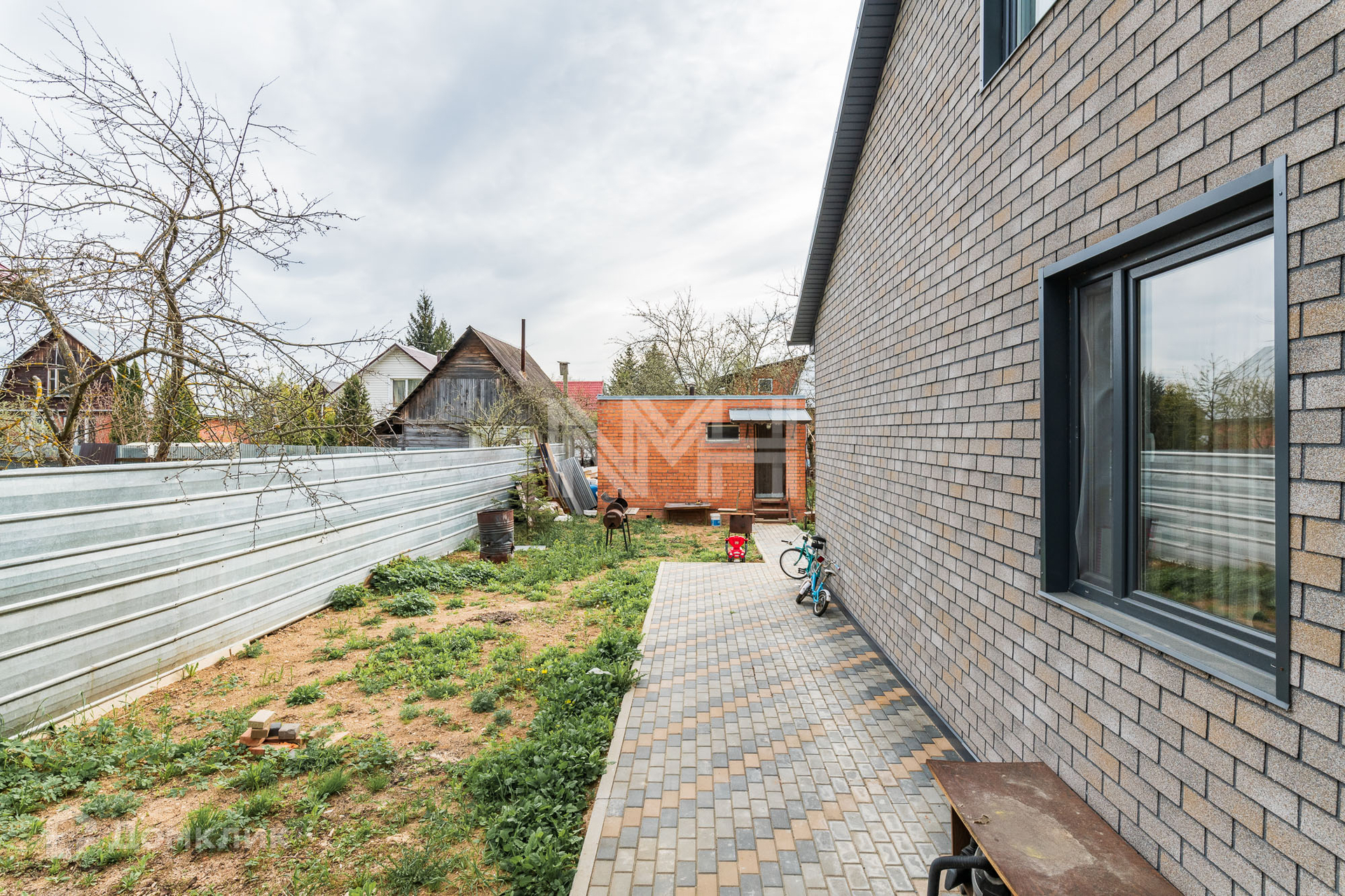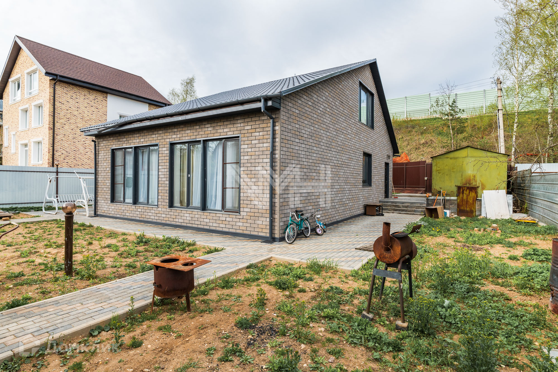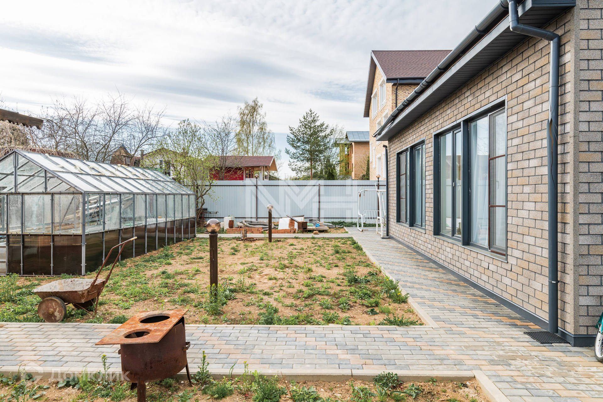 На участке оборудована парковка, проложены дорожки из брусчатки, зона отдыха.