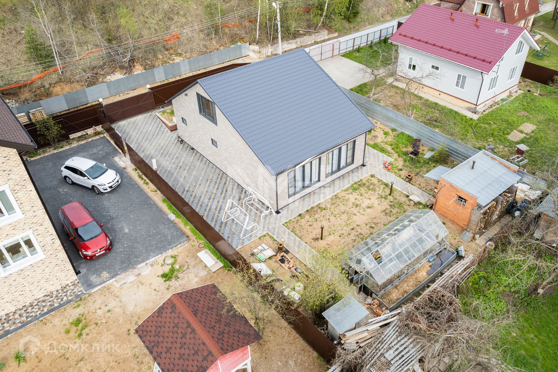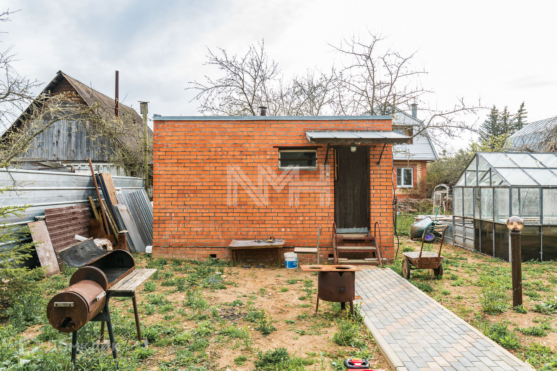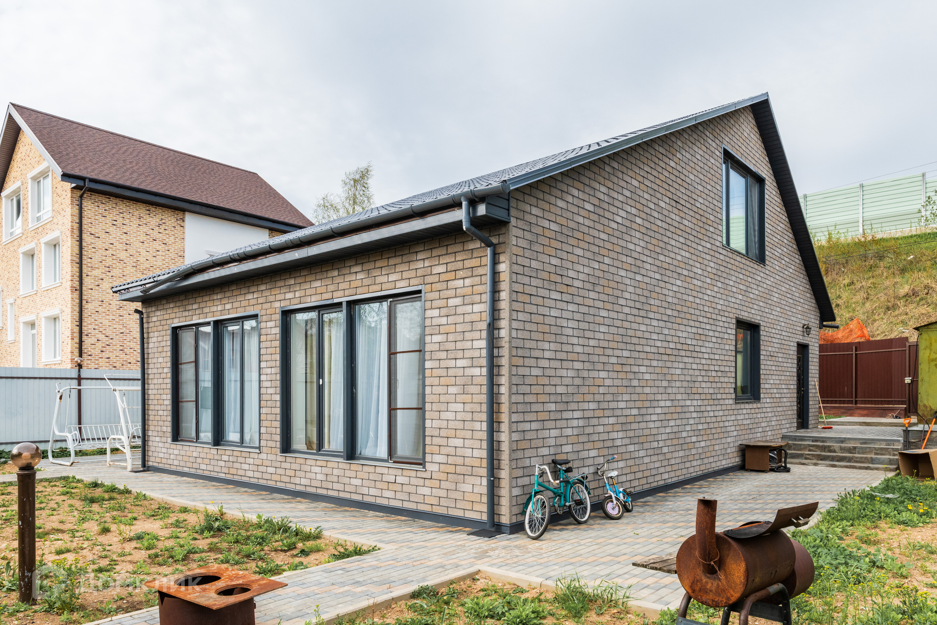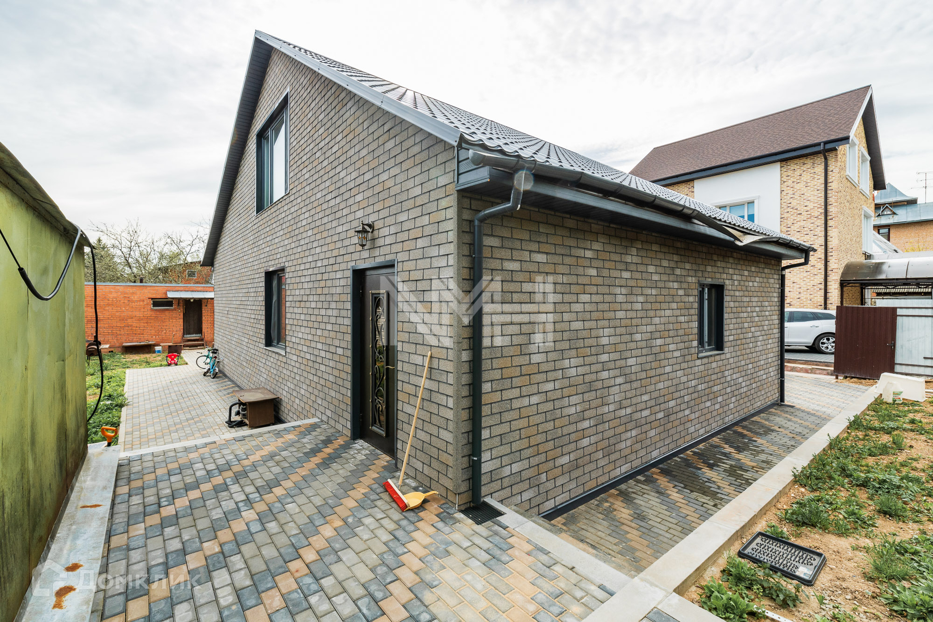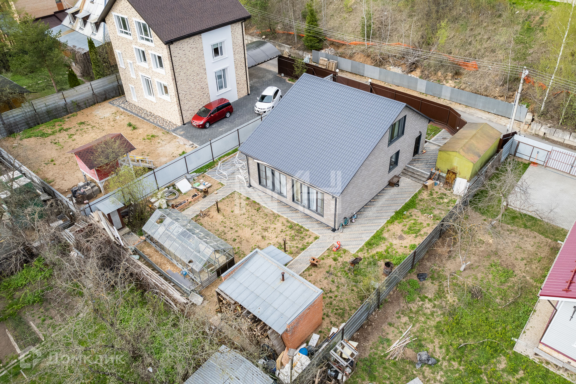 На участке оборудована парковка, проложены дорожки из брусчатки, зона отдыха.