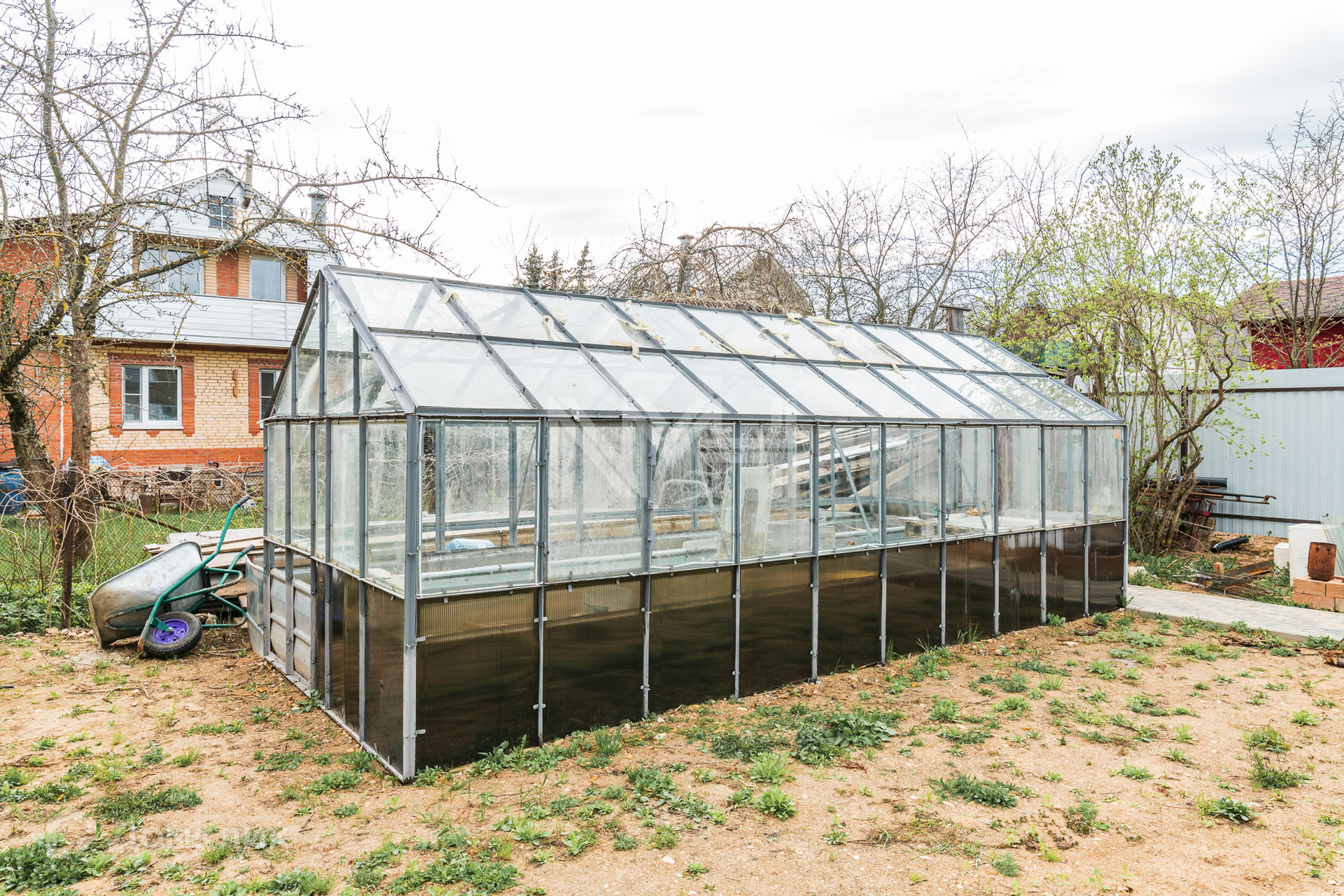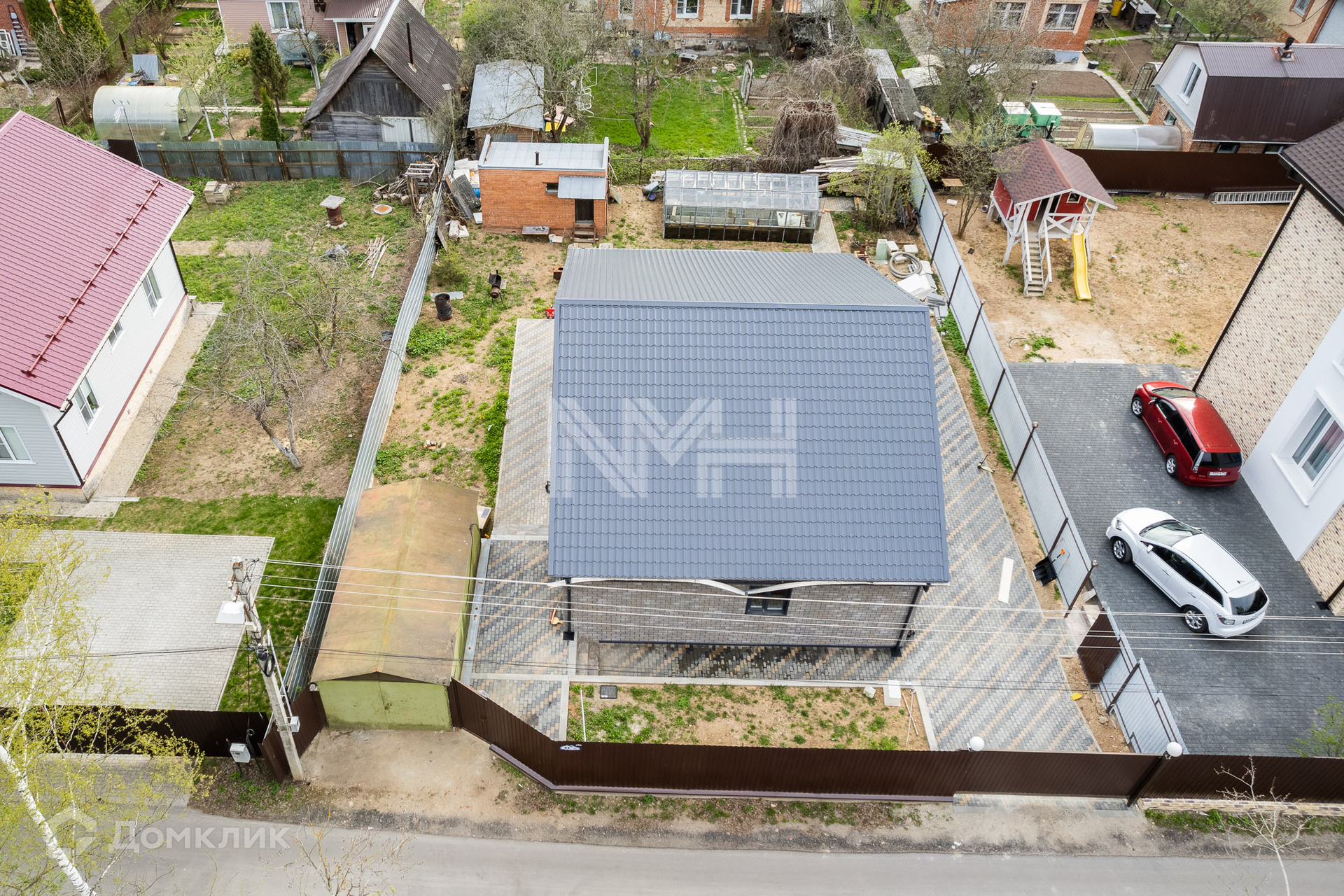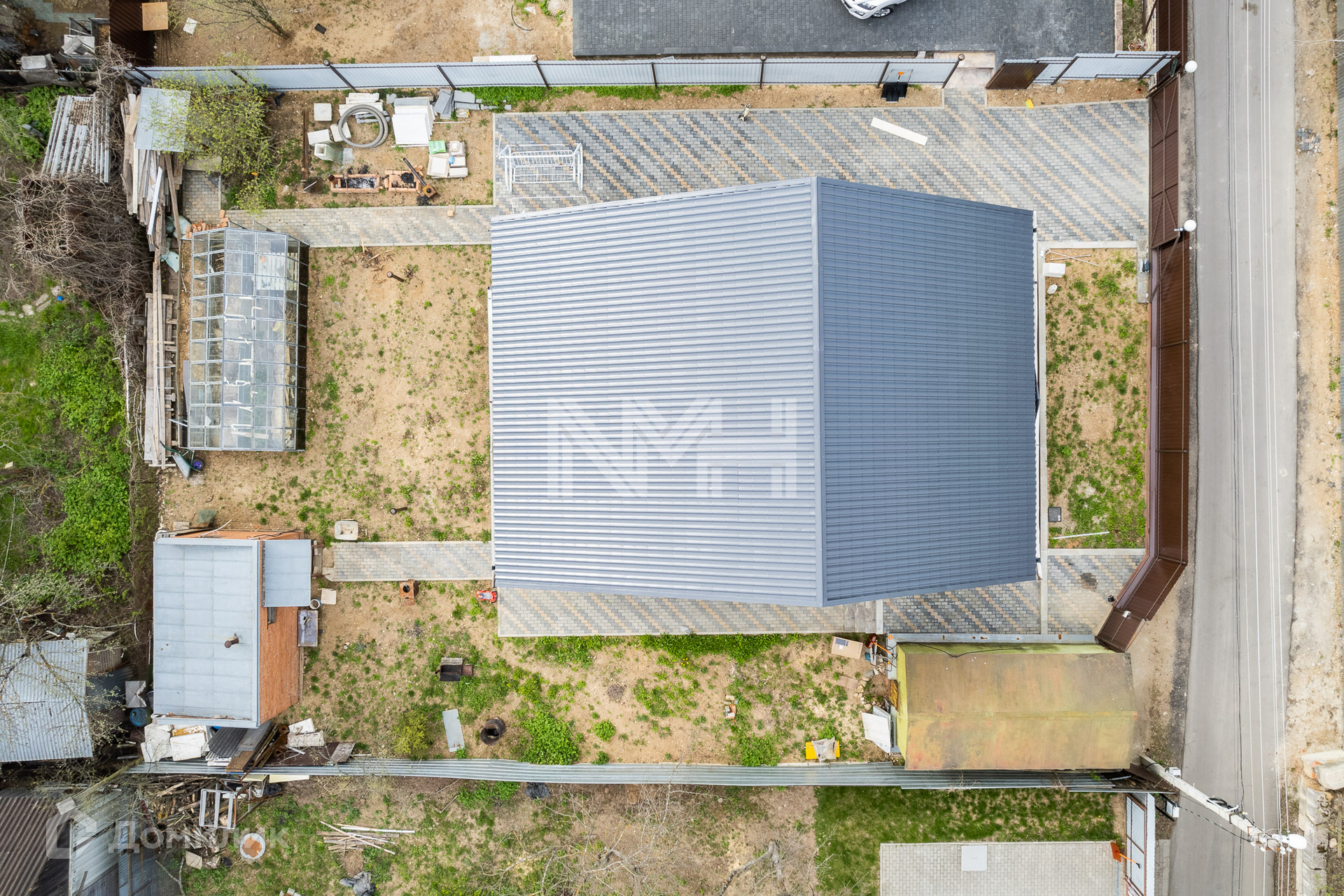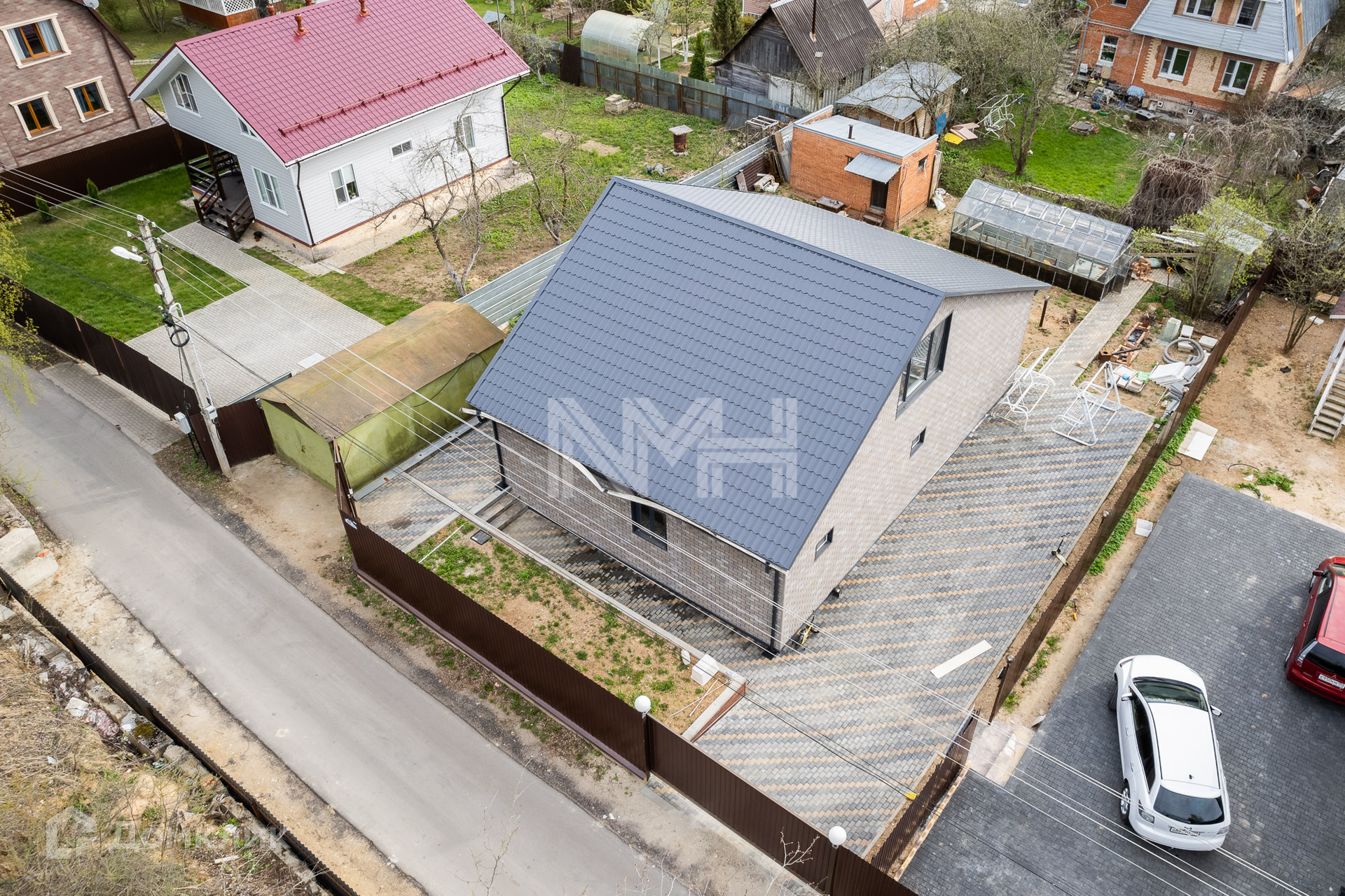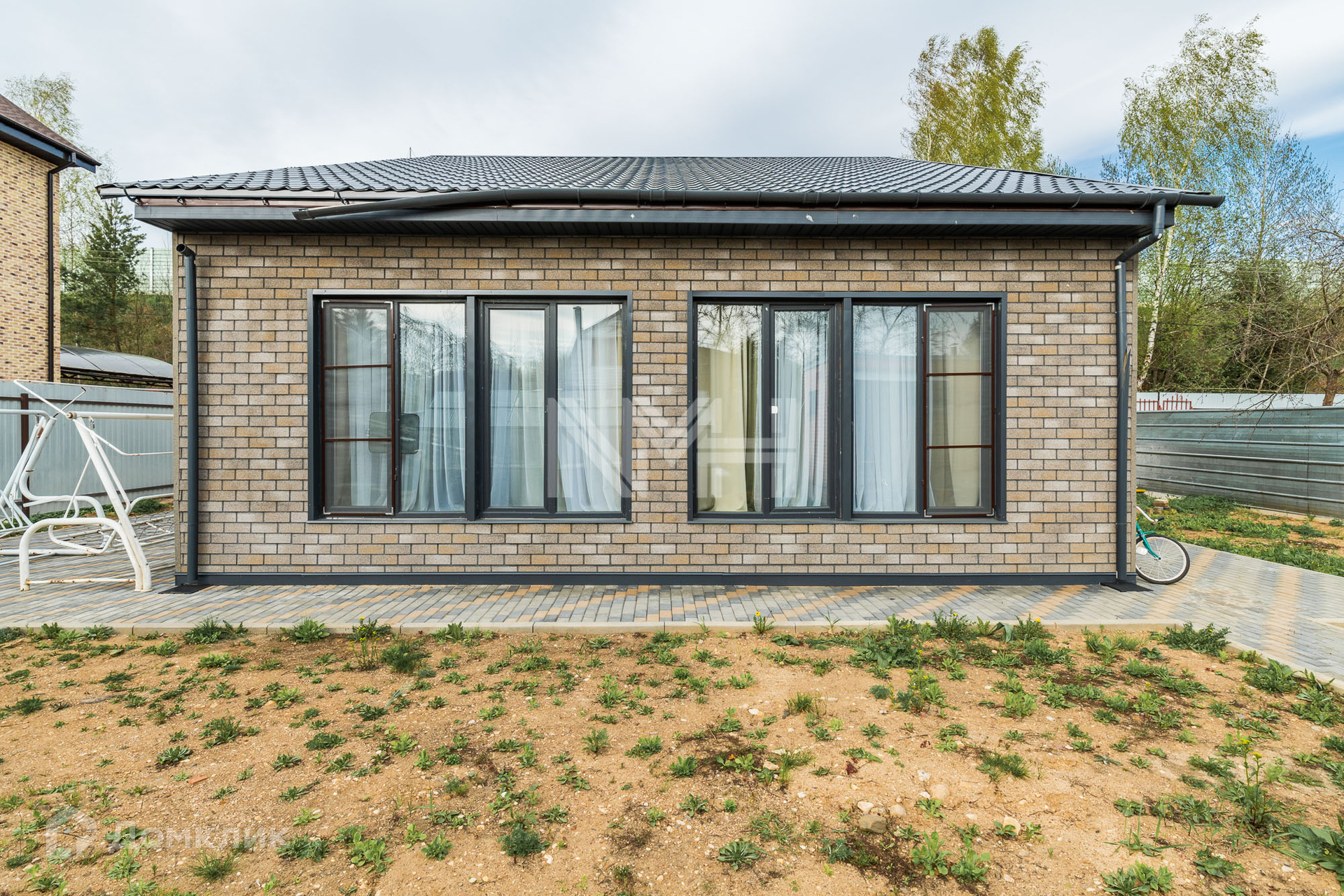 На участке оборудована парковка, проложены дорожки из брусчатки, зона отдыха.