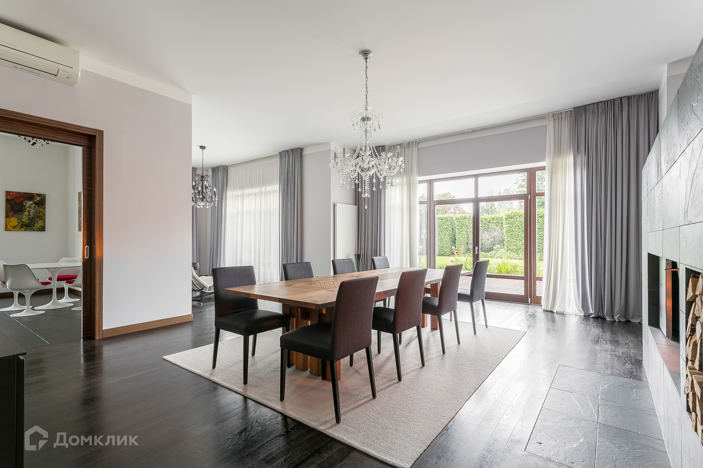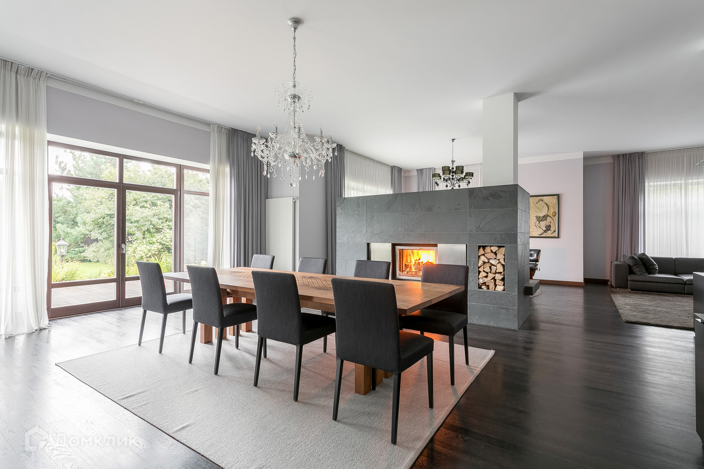 Первый этаж: входная группа с прихожей и гардеробной; кухня Haecker Германия с техникой Miele; столовая с выходом на террасу; гостиная; спальня; с/у; зимний сад. Авторский камин Biofire Австрия, облицовка из натурального сланца из Бразилии.