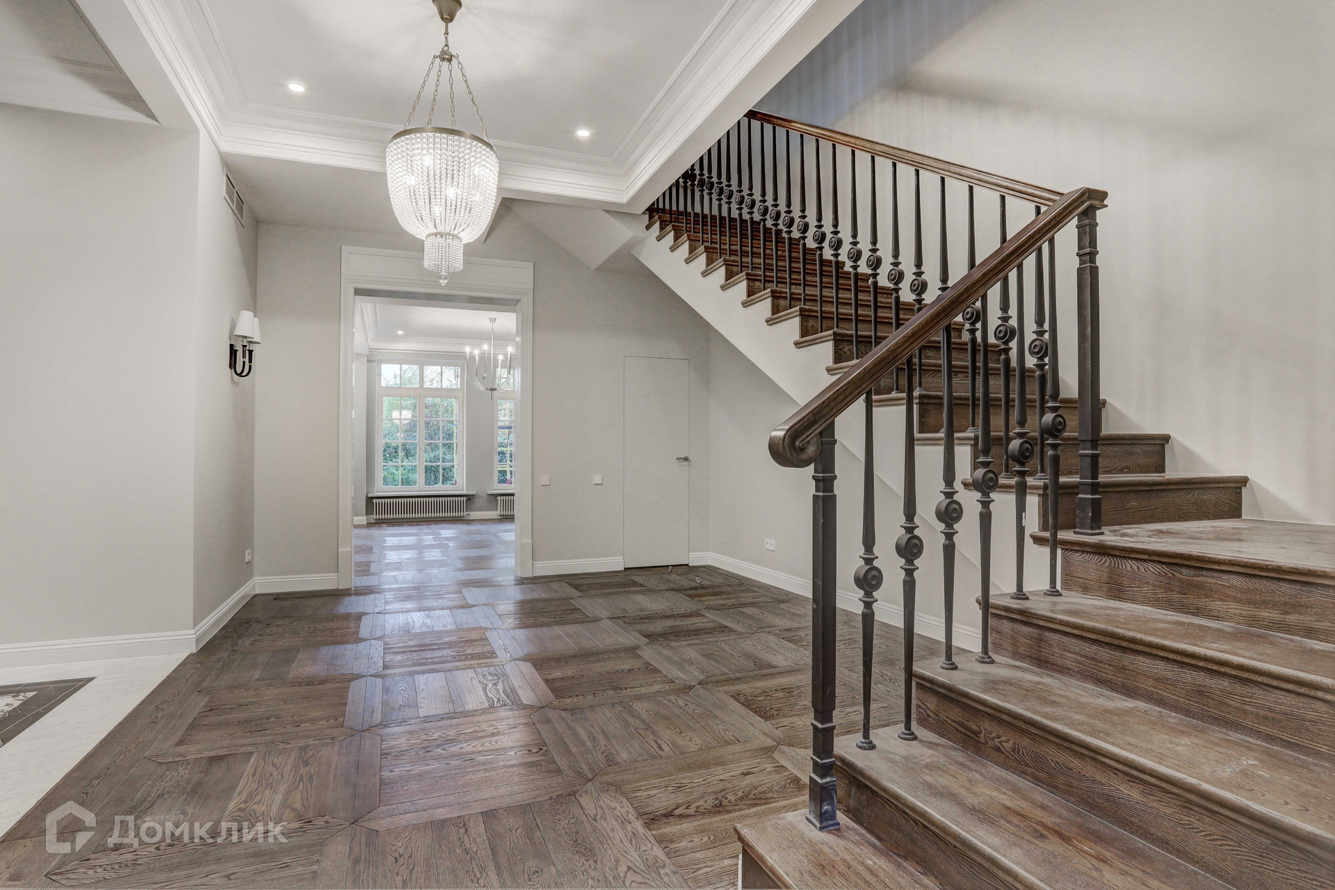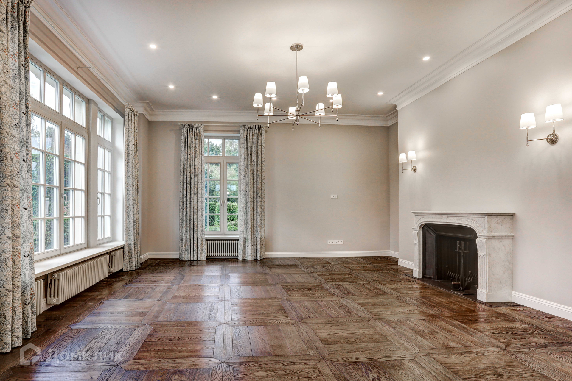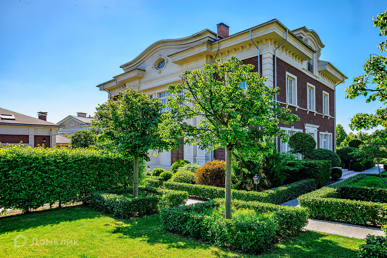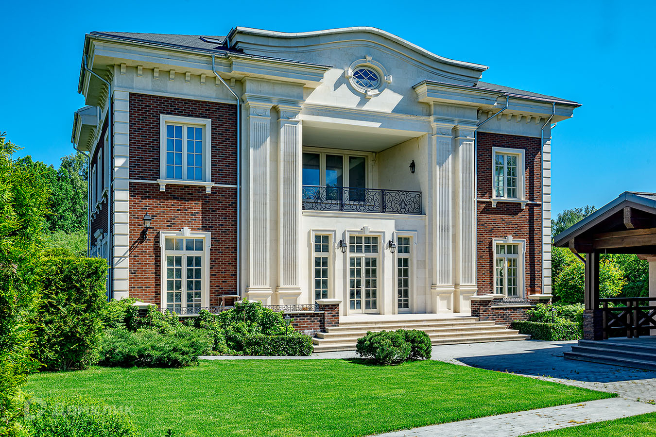 Отделка фасада дома выполнена из натурального камня. В доме 3 этажа, 6 спален, 7 сан узлов. Во внутренней отделке использованы высококачественные материалы лучших европейских/американских брендов, пол входной группы и сан узлов выполнен из итальянского мрамора, дубовый паркет, освещение американской компании Visual Comfort. Спальни второго этажа имеют свои гардеробные комнаты. Из окон открывается вид на английский сад. В доме расположены два камина. В главное гостиной находится антикварный камин из белого мрамора Carrara, на третьем этаже портал из Crema Nuova.Кухня оборудована техникой Miele, холодильники Liebherr. Сантехника Villeroy boch и Grohe.