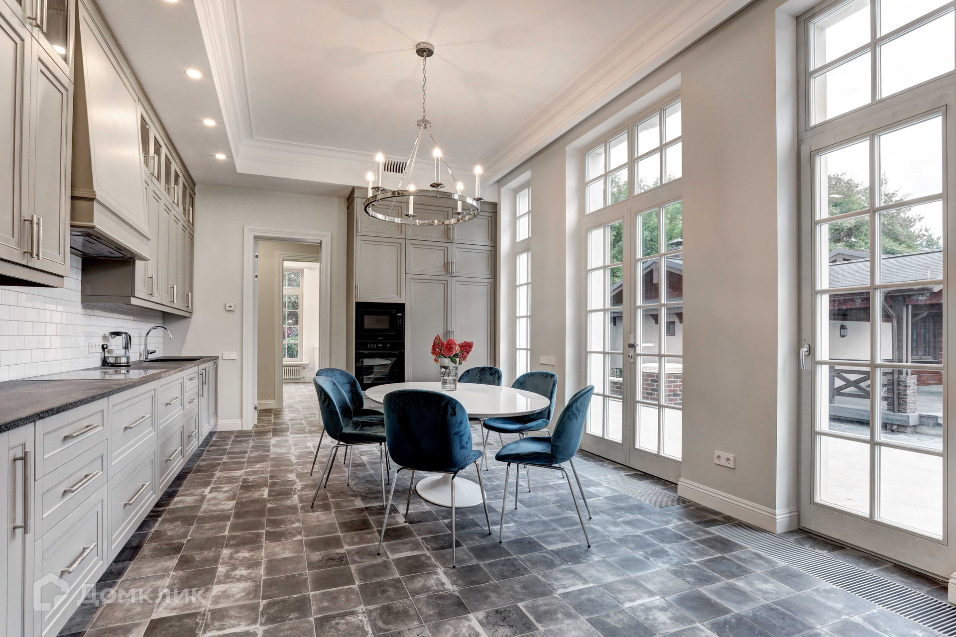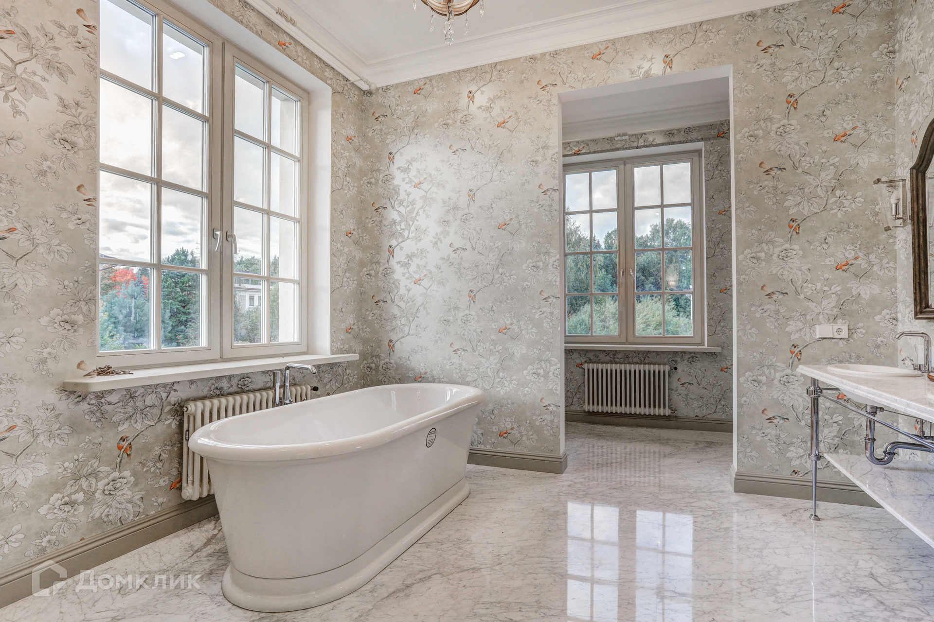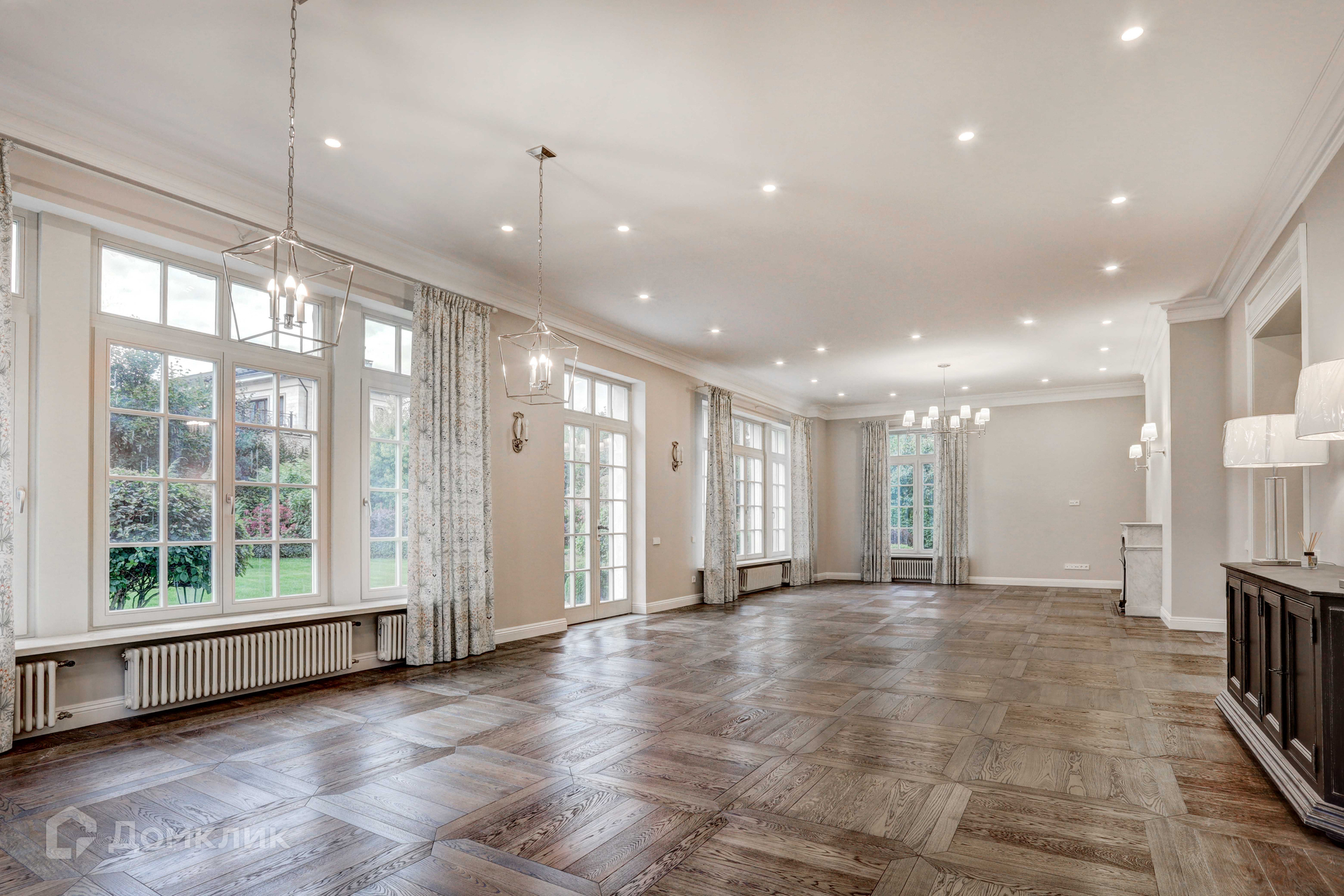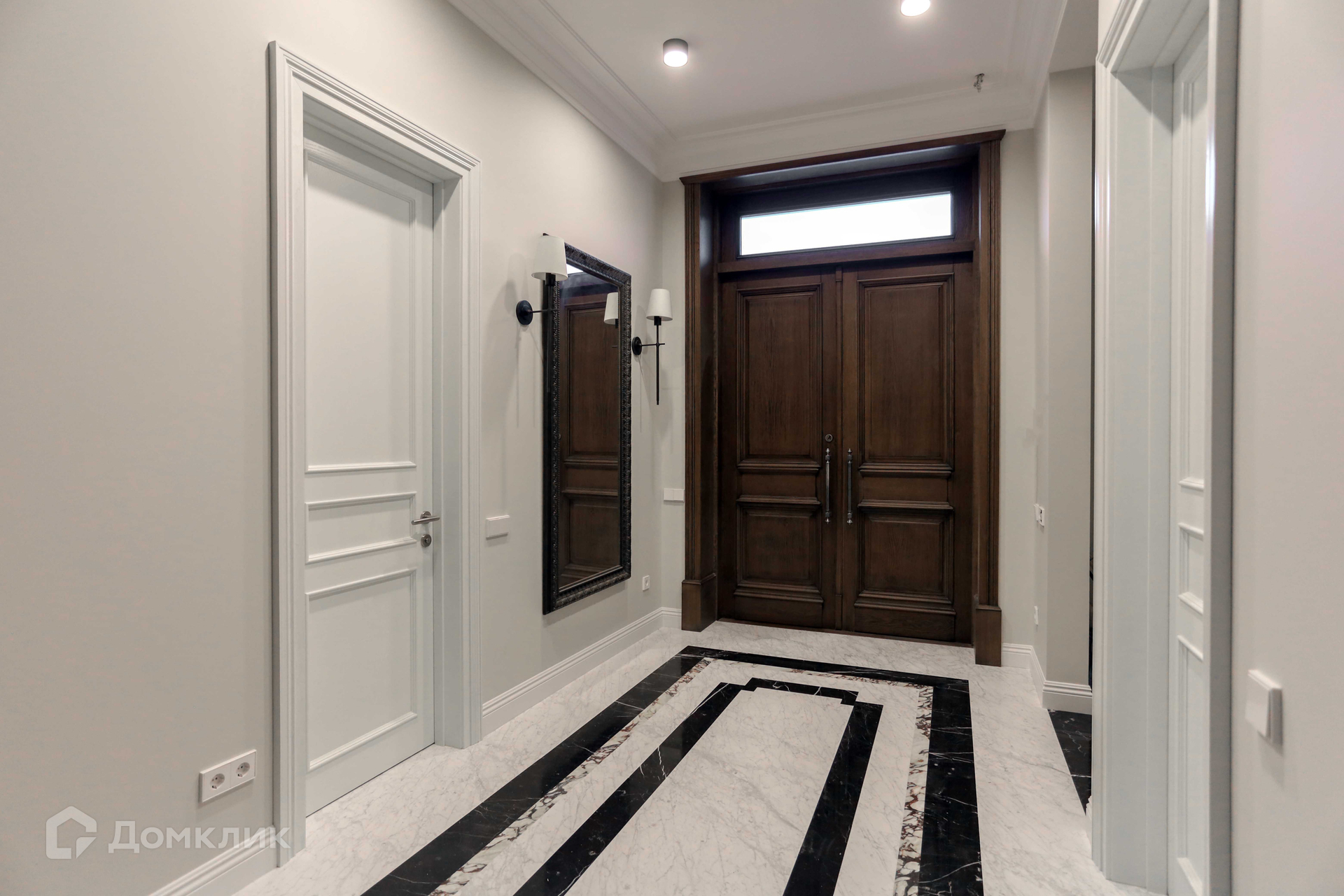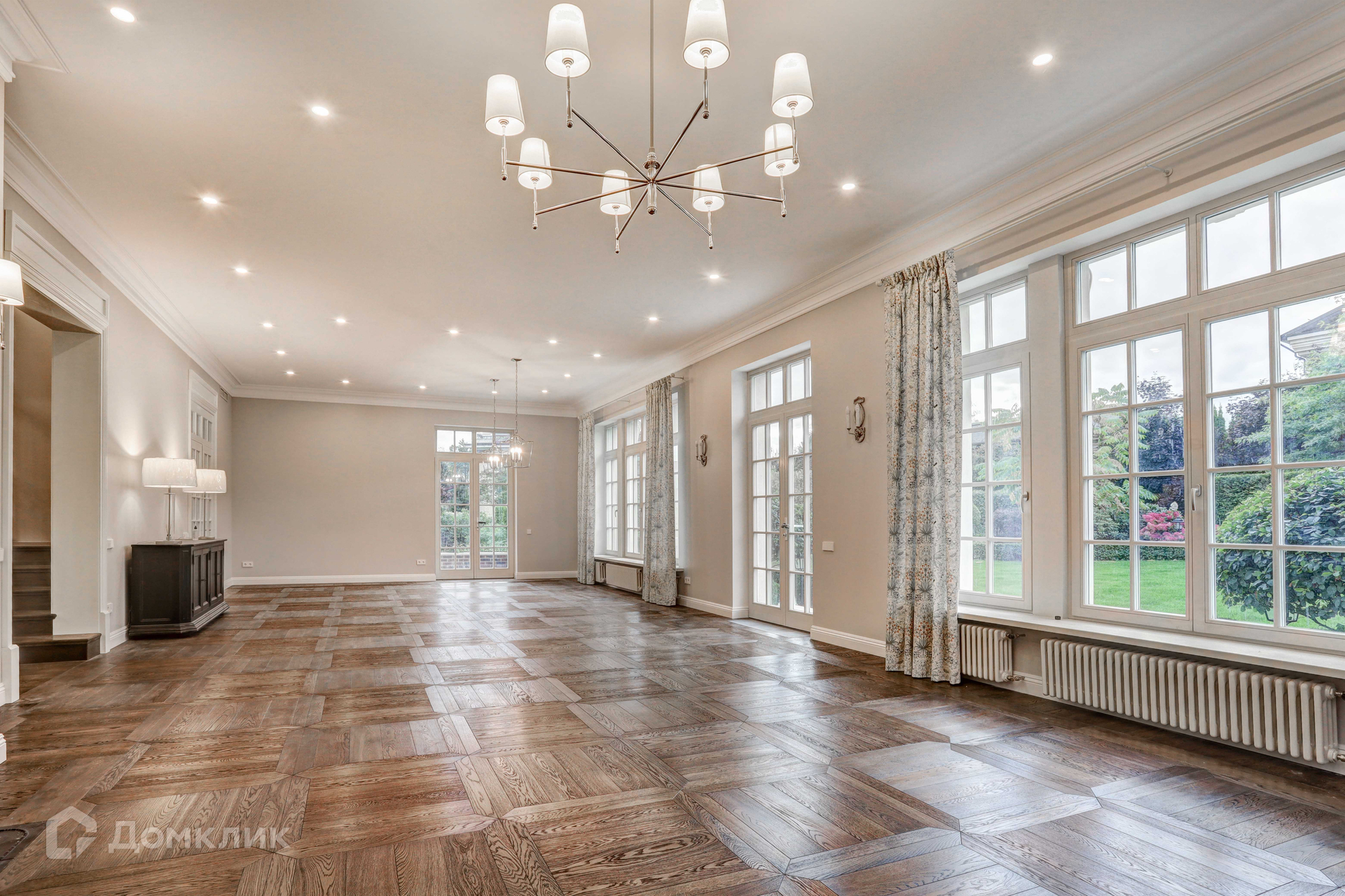 Отделка фасада дома выполнена из натурального камня. В доме 3 этажа, 6 спален, 7 сан узлов. Во внутренней отделке использованы высококачественные материалы лучших европейских/американских брендов, пол входной группы и сан узлов выполнен из итальянского мрамора, дубовый паркет, освещение американской компании Visual Comfort. Спальни второго этажа имеют свои гардеробные комнаты. Из окон открывается вид на английский сад. В доме расположены два камина. В главное гостиной находится антикварный камин из белого мрамора Carrara, на третьем этаже портал из Crema Nuova.Кухня оборудована техникой Miele, холодильники Liebherr. Сантехника Villeroy boch и Grohe.