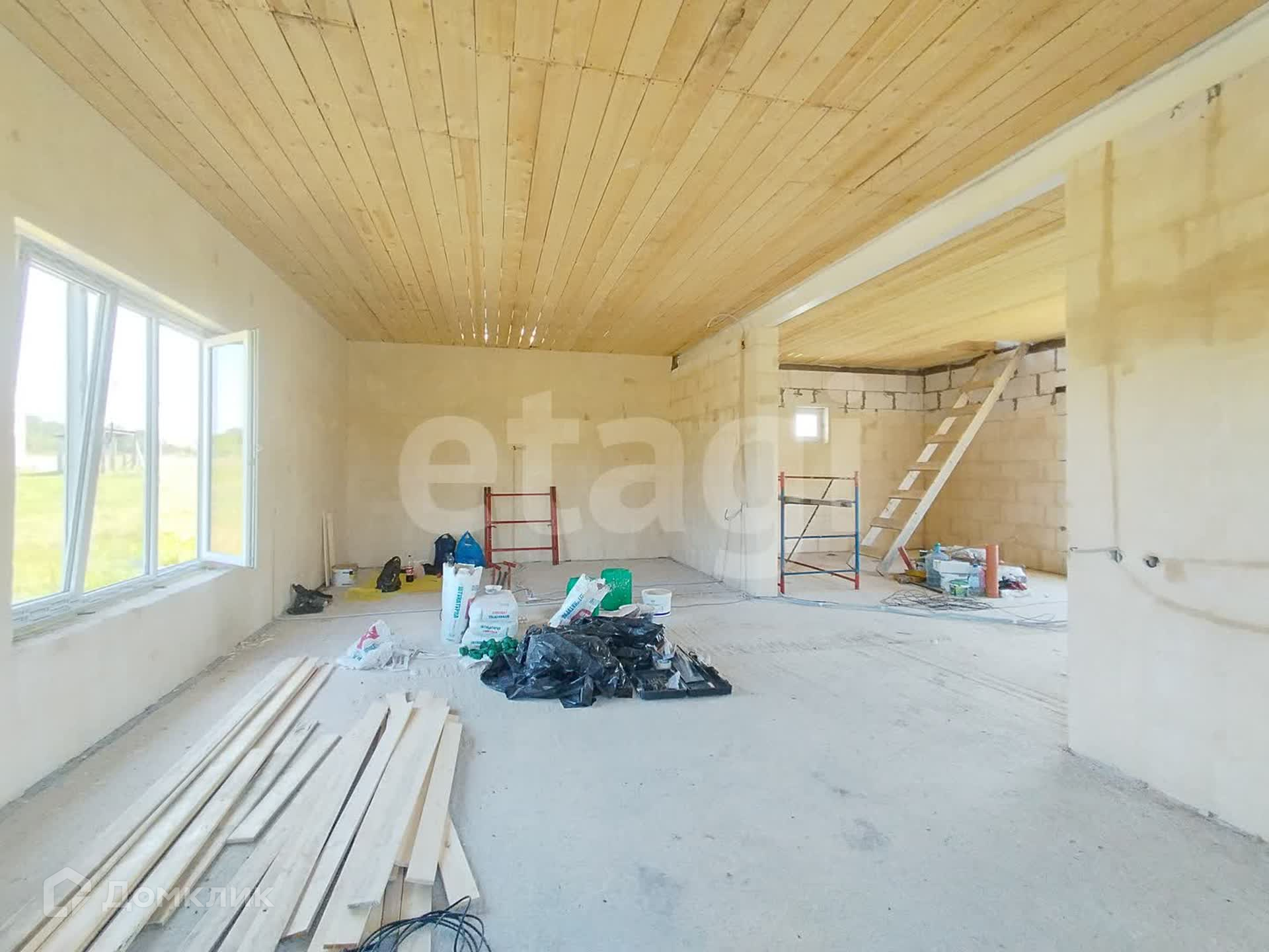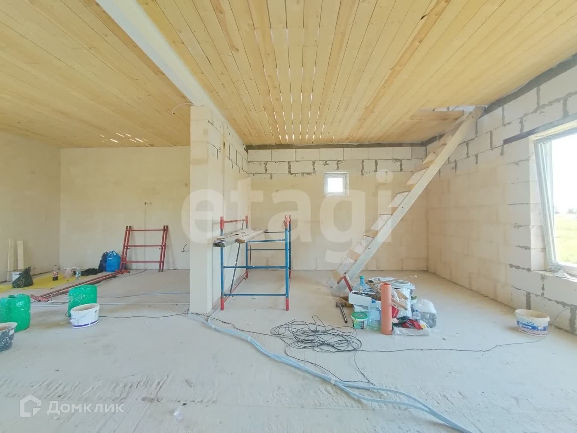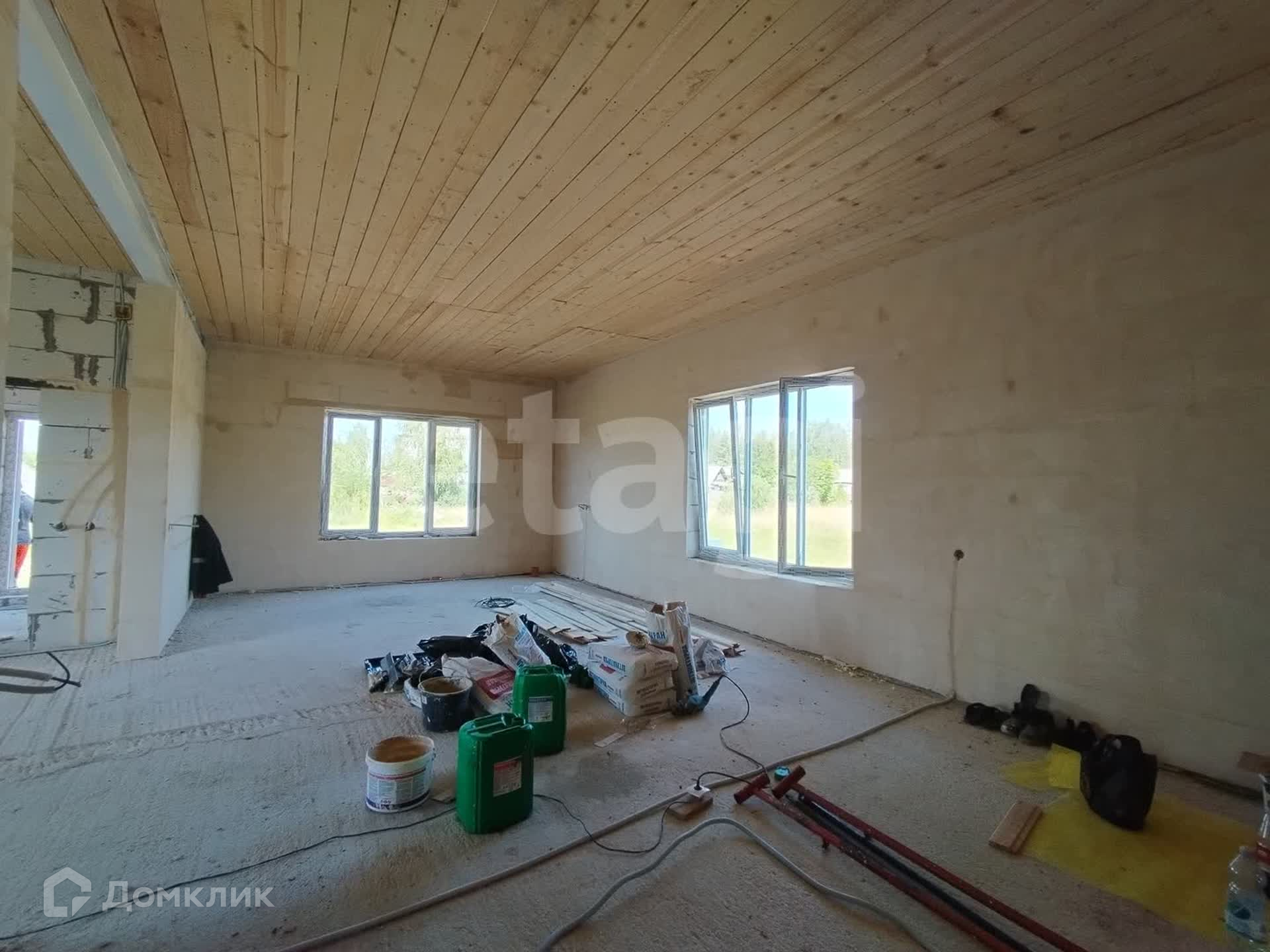 На данный момент дом находится на стадии внутренней отделки. Стены оштукатурены. Проведена проводка. Залита стяжка под теплый пол. К моменту продажи полы будут сделаны полностью. Стены будут подготовлены под покраску или обои. Это уже по вашему желанию. Второй этаж будет утеплен. Останется только обшить.