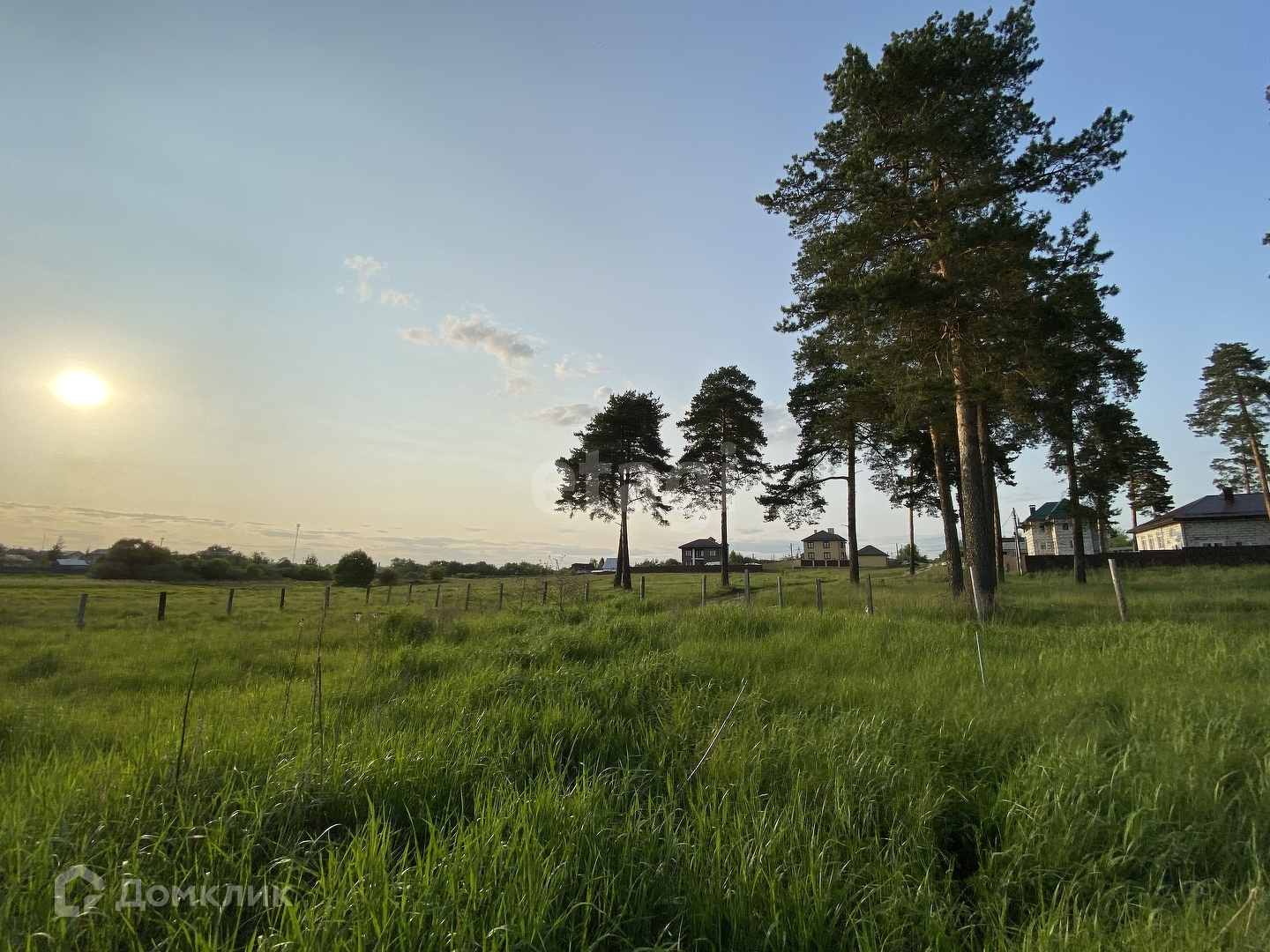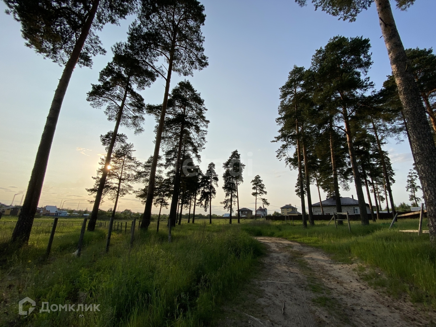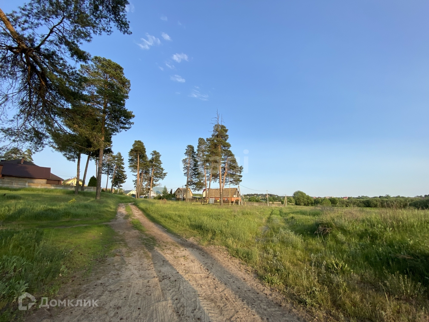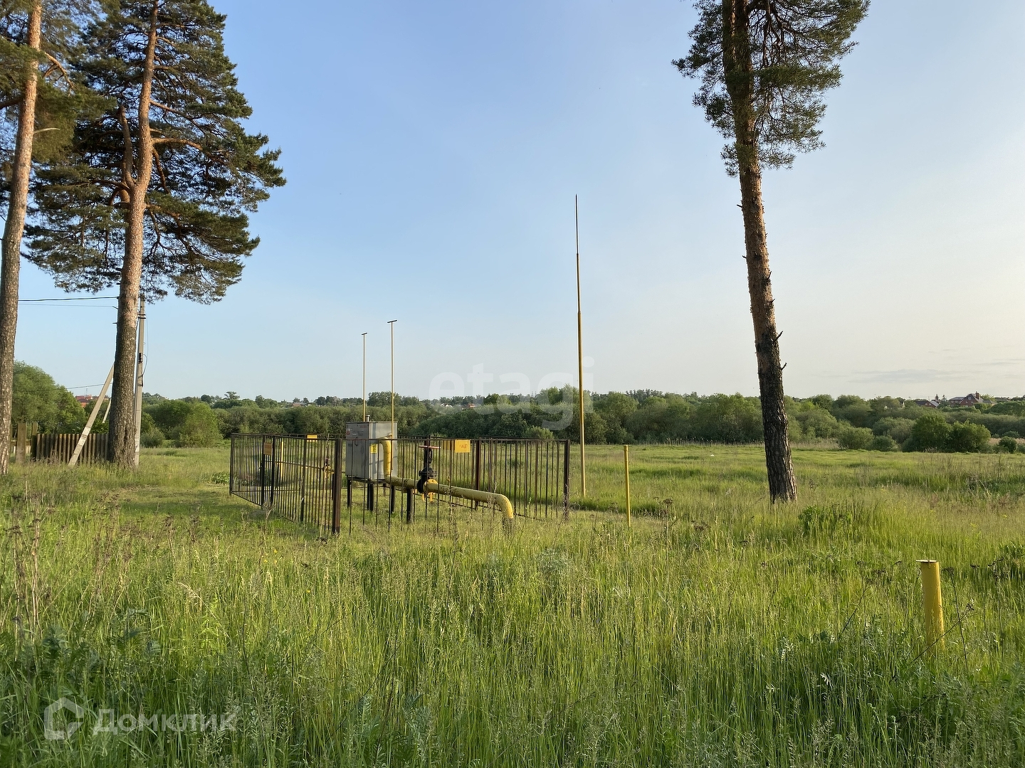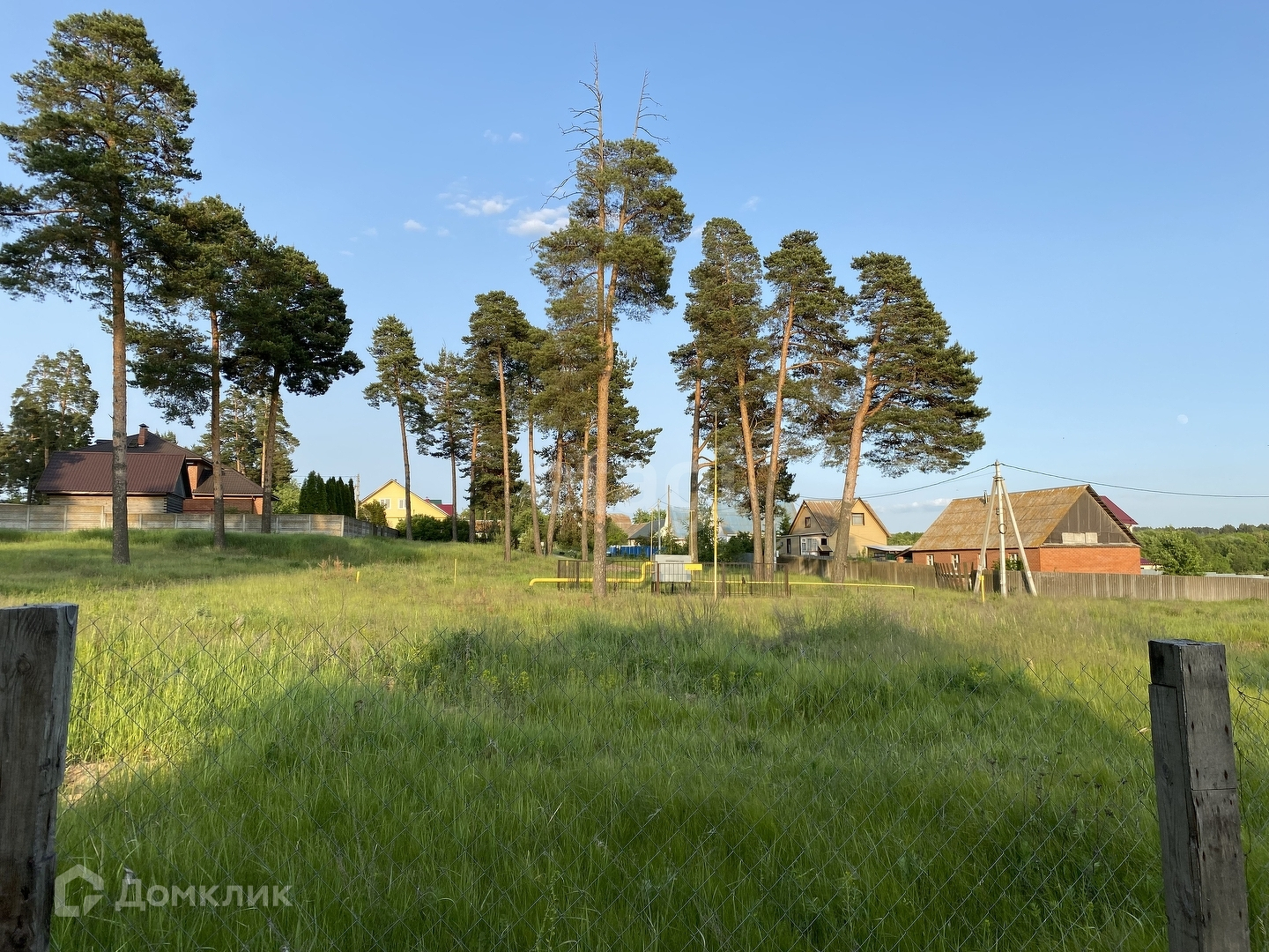 Участок ровный, широкий, огорожен сеткой рабицей. Межевание выполнено, границы по участку обозначены. Рядом находится озеро, по периметру растут шикарные сосны, участок расположен как бы в уединении, рядом нет соседей. Газ в 50 метрах от участка. Электричество рядом на столбе. Вода в деревне централизованная. Магазин, в пешей доступности.