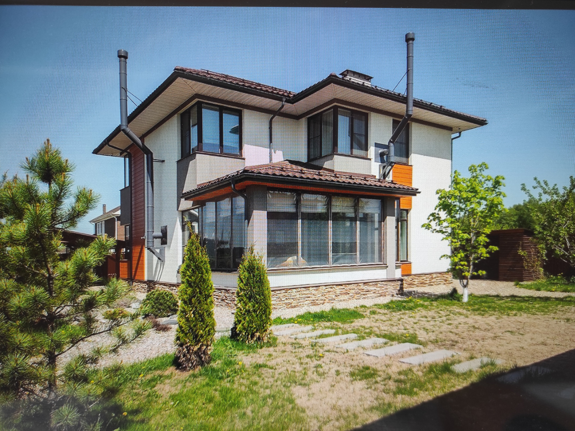Продаю дом с участком в коттеджном посёлке "Зелёные холмы", 28 км от МКАД, Киевское шоссе. Современный дом с уникальным остеклением, дизайнерским ремонтом, зонами отдыха в любое время года. Участок 9,5 соток с ландшафтным дизайном, фруктовыми деревьями, мангальной зоной и зоной отдыха. В доме два этажа, на первом этаже: кухня-гостинная, зал, спальня, санузел, гардеробная при входной группе, постирочная комната, бойлерная. Окно во всю высоту лестничного проема. На втором этаже: 1 спальня со встроенной гардеробной, 2-мя санузлами, 2 спальни. При ремонте в доме использовались только современные и качественные материалы. Полы- дерево, два камина, видеонаблюдение, освещение участка, электричество 15кВт, водопровод центральный. Всё коммуникации в доме. Круглогодичный подъезд, асфальт до участка, солидные соседи живут круглый год. Фотографии всех комнат высылаю по запросу. Дом мебелирован и оборудован техникой, готов к проживанию. Пропускной режим и охрана посёлка.