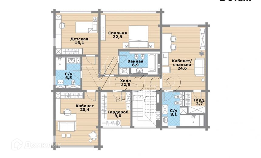 2-й этаж: мастер-спальня (23) с собственной ванной комнатой (7), две детские (16 и 20) с собственным с/у (6,5), спальня или кабинет (25) с гардеробной (4) и с/у (8,1), холл (12,5), гардеробная (9).