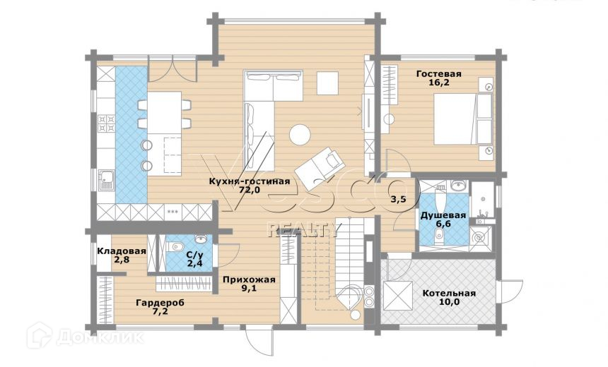 1-й этаж: прихожая (9) с гардеробной комнатой (7+3), кухня-столовая и гостиная (72), гостевой с/у (2,4), гостевая спальня (16), ванная или постирочная (6,6), котельная (10).