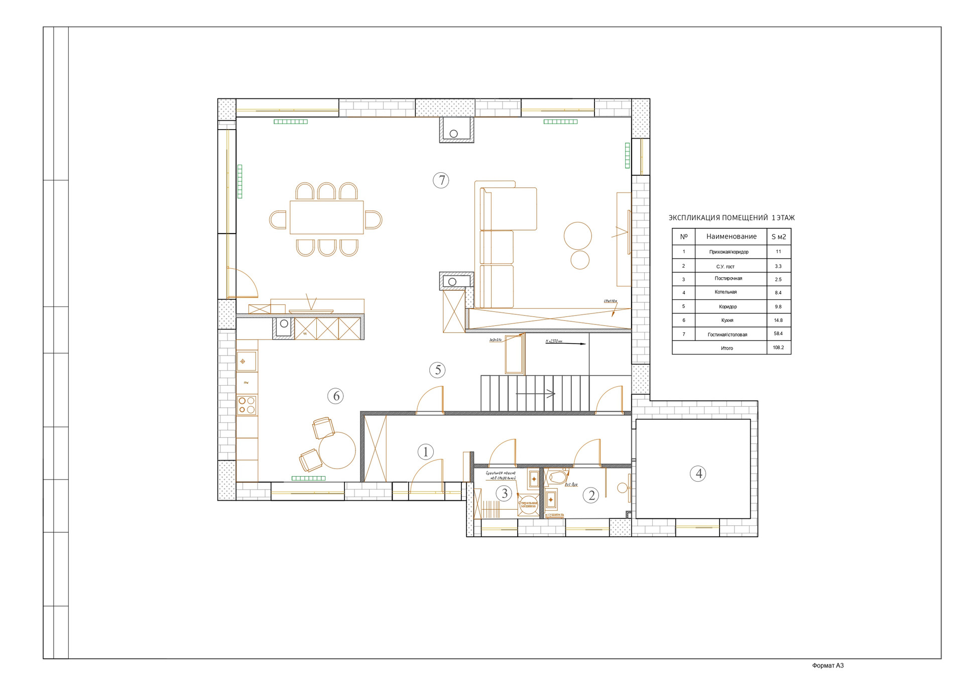 1 этаж: холл, су с душевой, постирочная, кухня с зоной для завтрака, гостиная, столовая с выходом на террасу,  котельная, кладовая гараж на 2 мм,;