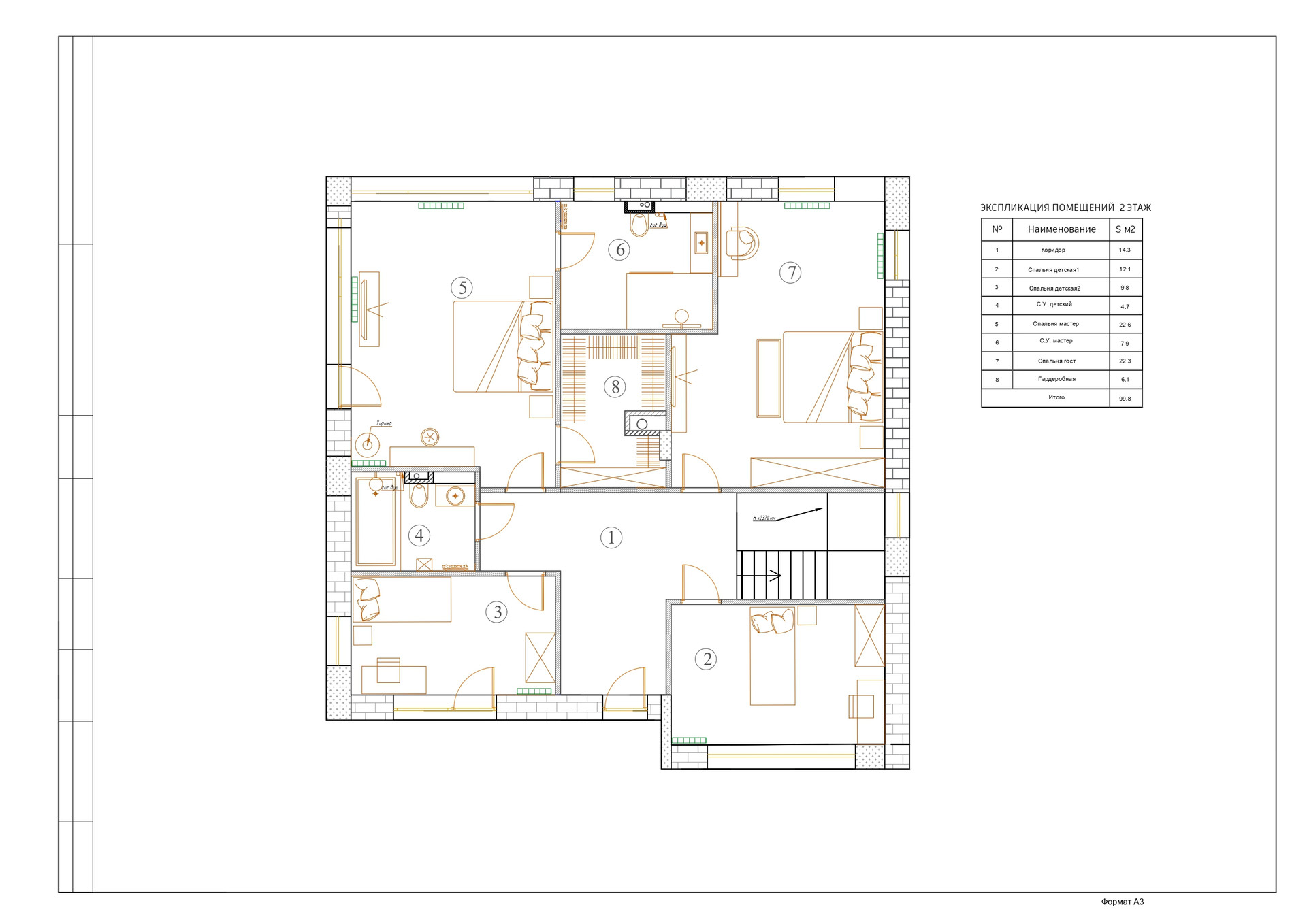 2 этаж: холл, выход на террасу 2-го этажа, мастер спальня с гардеробной и су, 3 спальни, су, гардеробная.