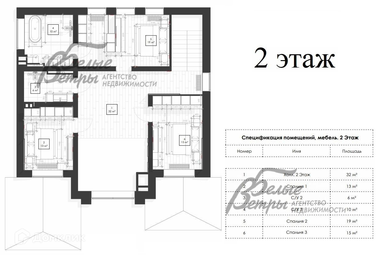 2-ой этаж: холл 32 кв.м, спальня 13 кв.м, санузел 6 кв.м, санузел 10 кв.м, спальня 19 кв.м, спальня 15 кв.м.