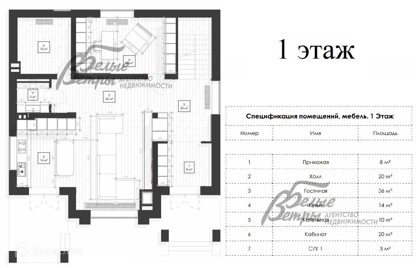 1-ый этаж: терраса с крыльцом 26 кв.м, прихожая 8 кв.м, холл 20 кв.м, гостиная 36 кв.м, кухня 14 кв.м, кабинет 20 кв.м, санузел 3 кв.м, котельная 10 кв.м.