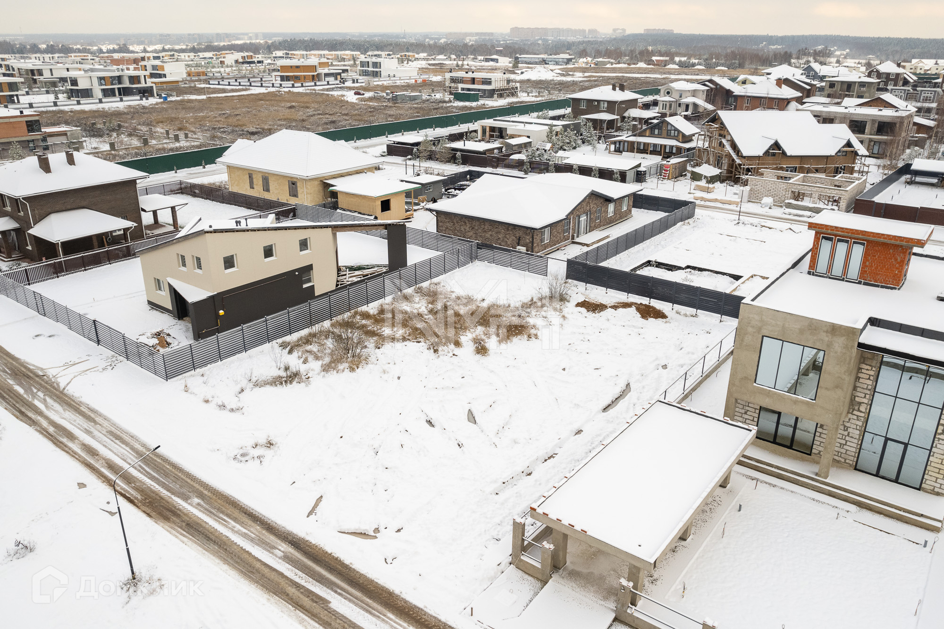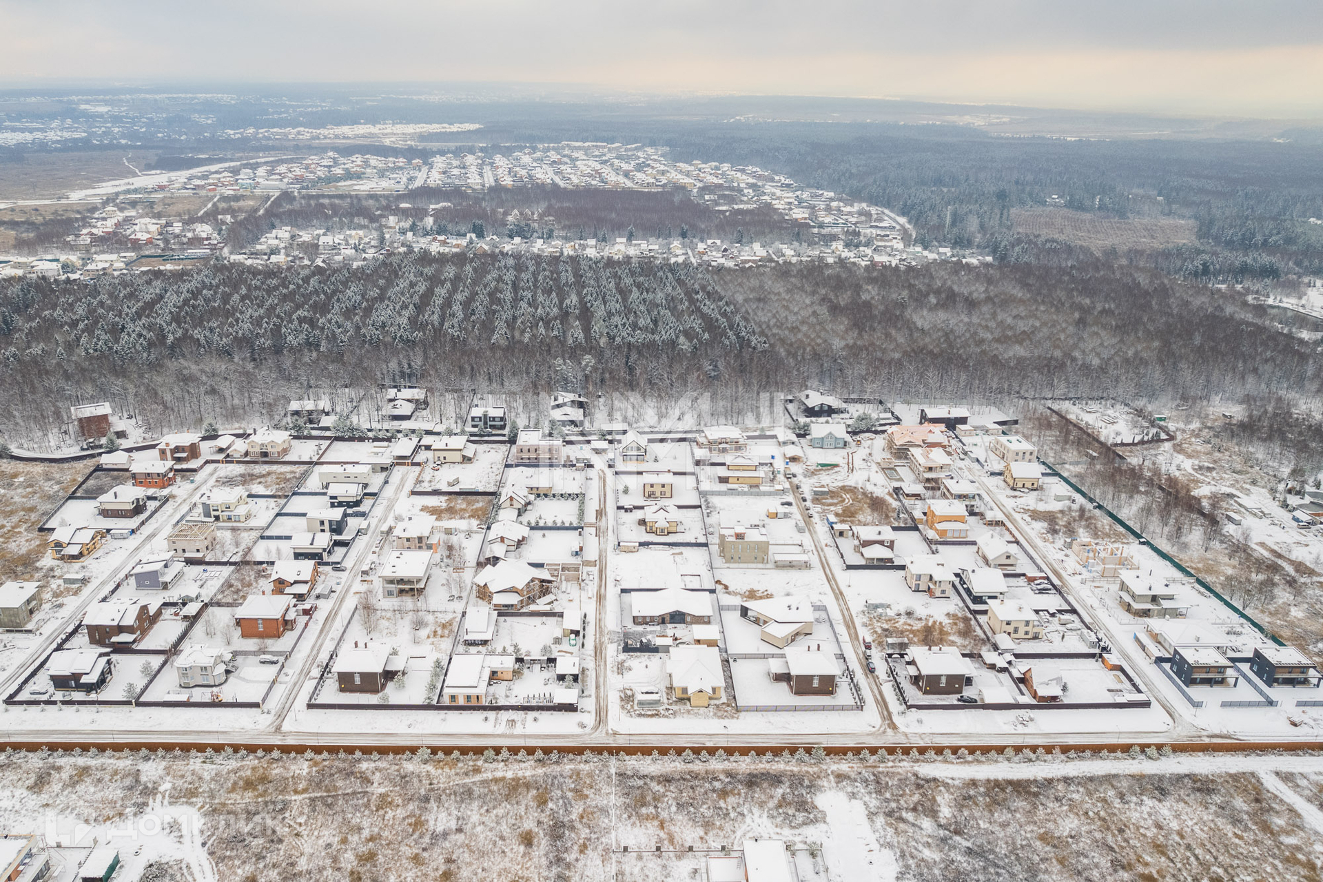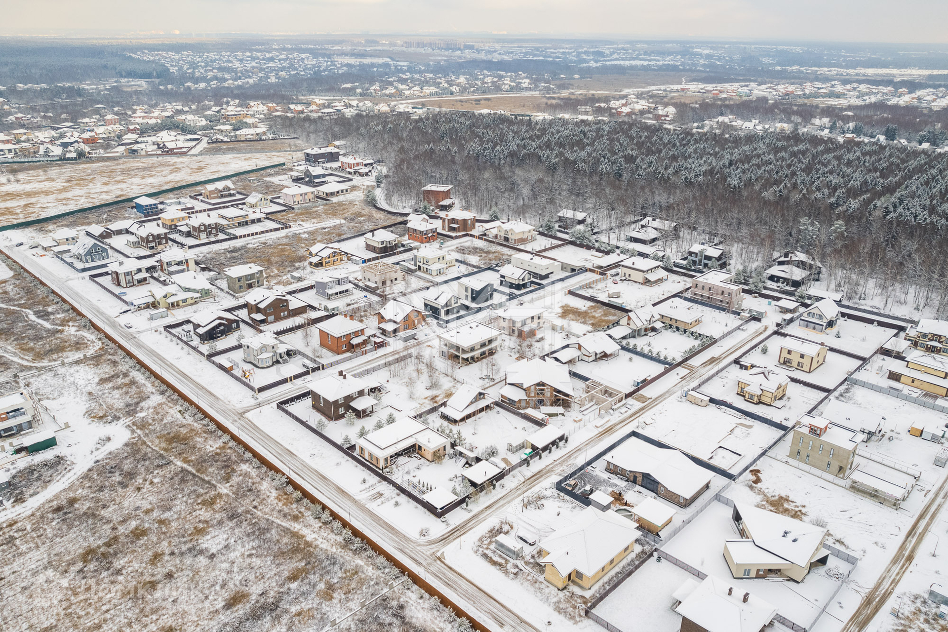 В поселке – асфальтированные дороги, уличное освещение, есть спортивная и детские площадки. В пешей доступности – лесной массив. Въезд через КПП.