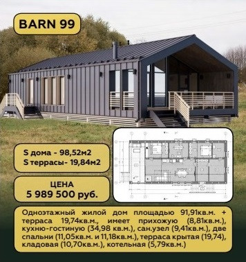 Площадь дома - 98,52м2, террасы - 19,84м2.