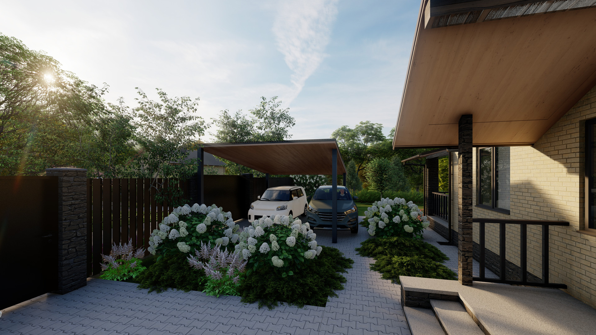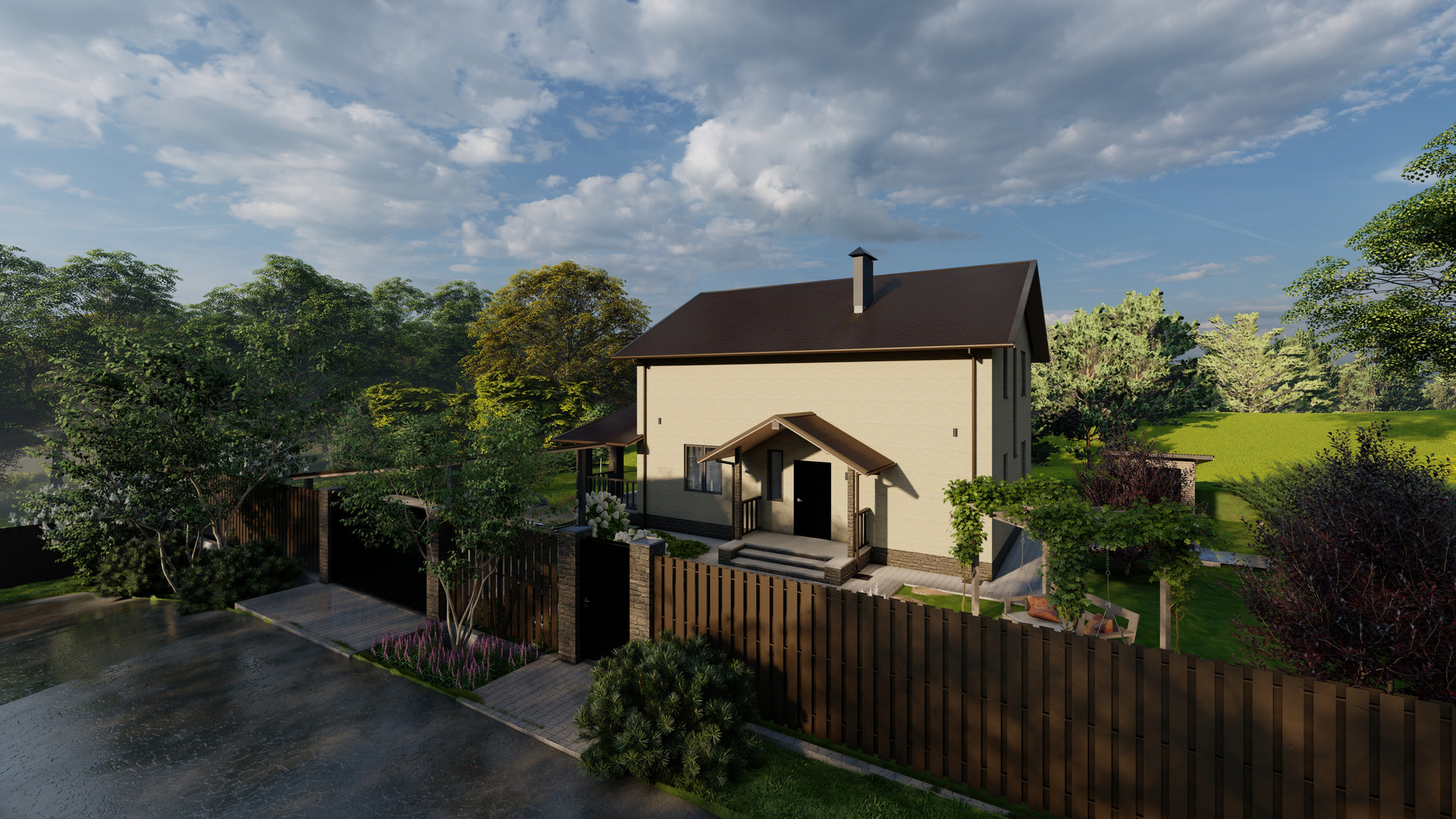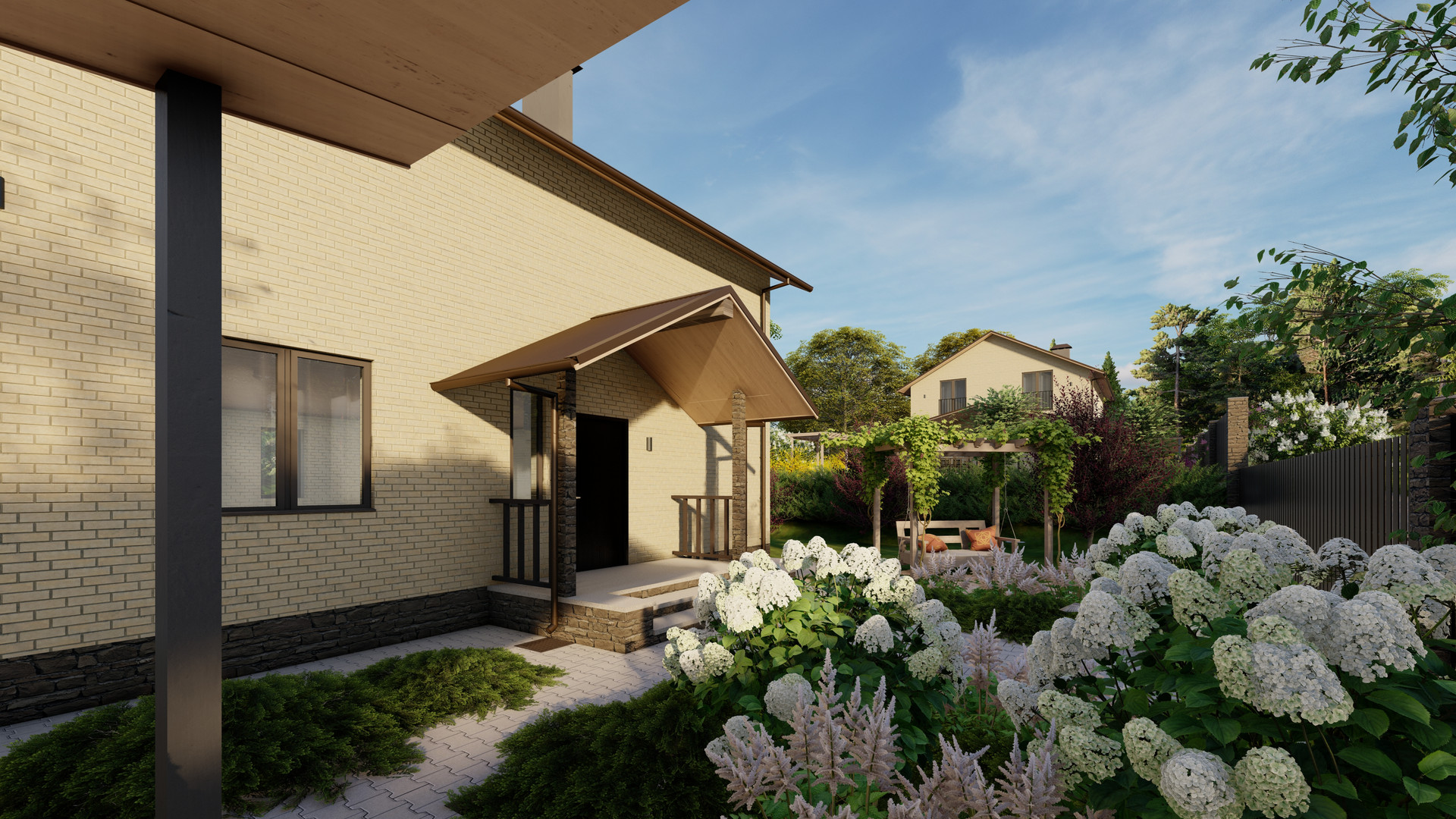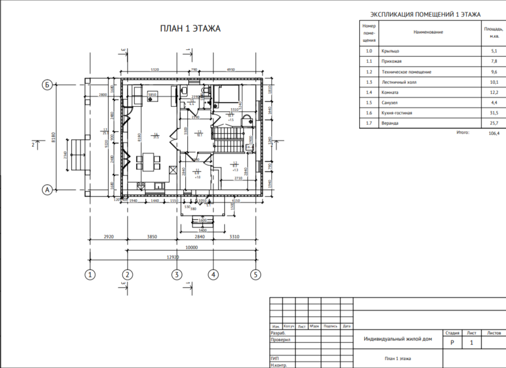 1 этаж: Просторная прихожая, кухня-гостиная с выходом на террасу, где создана зона барбекю, техническое помещение, кладовая под лестницей, гостевая спальня, санузел