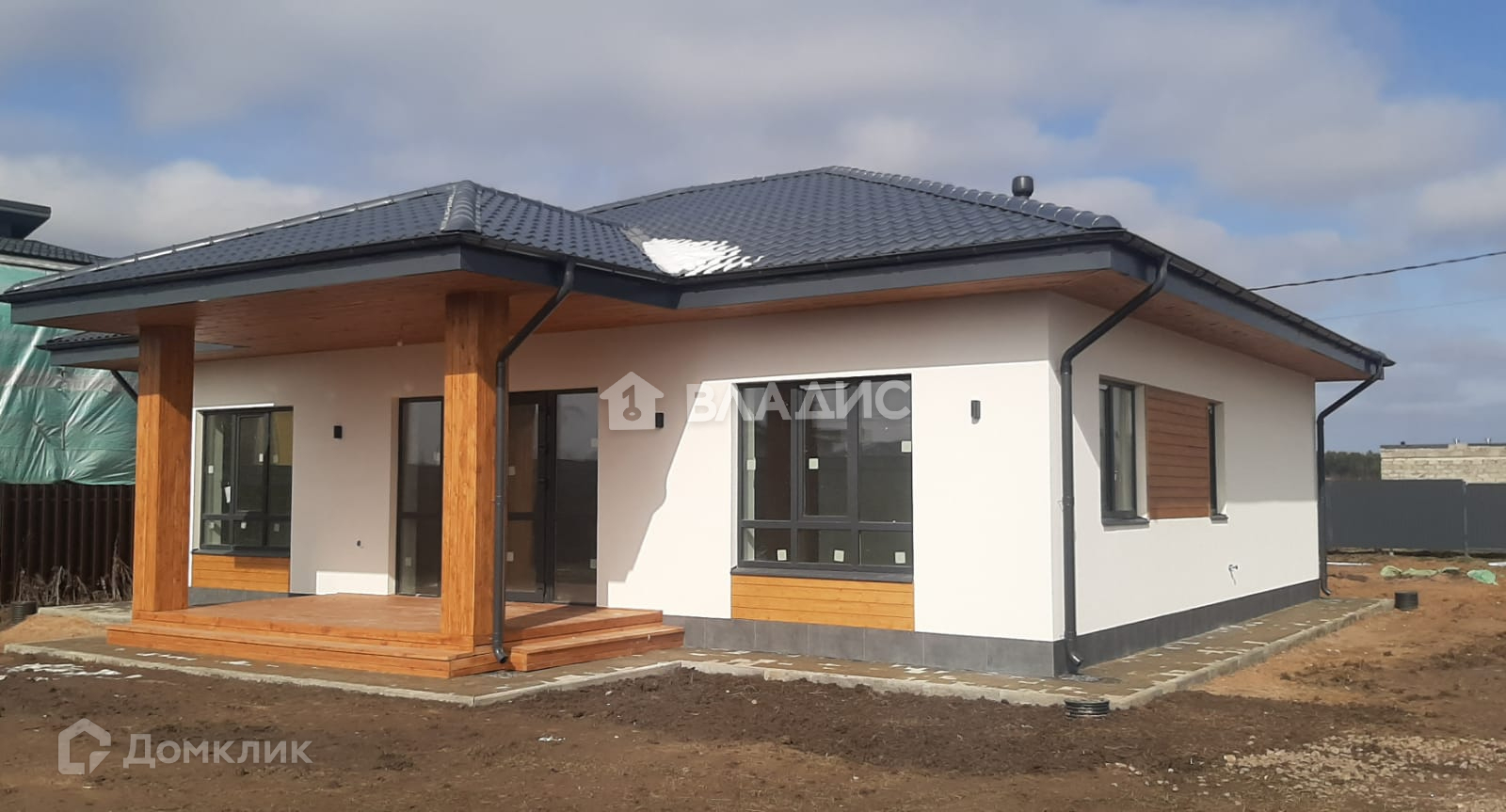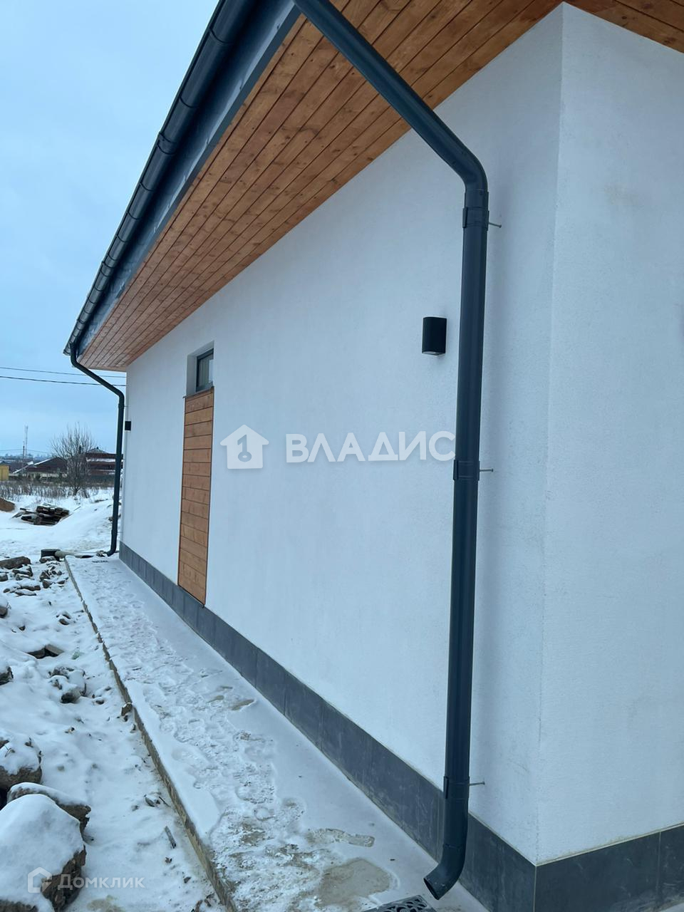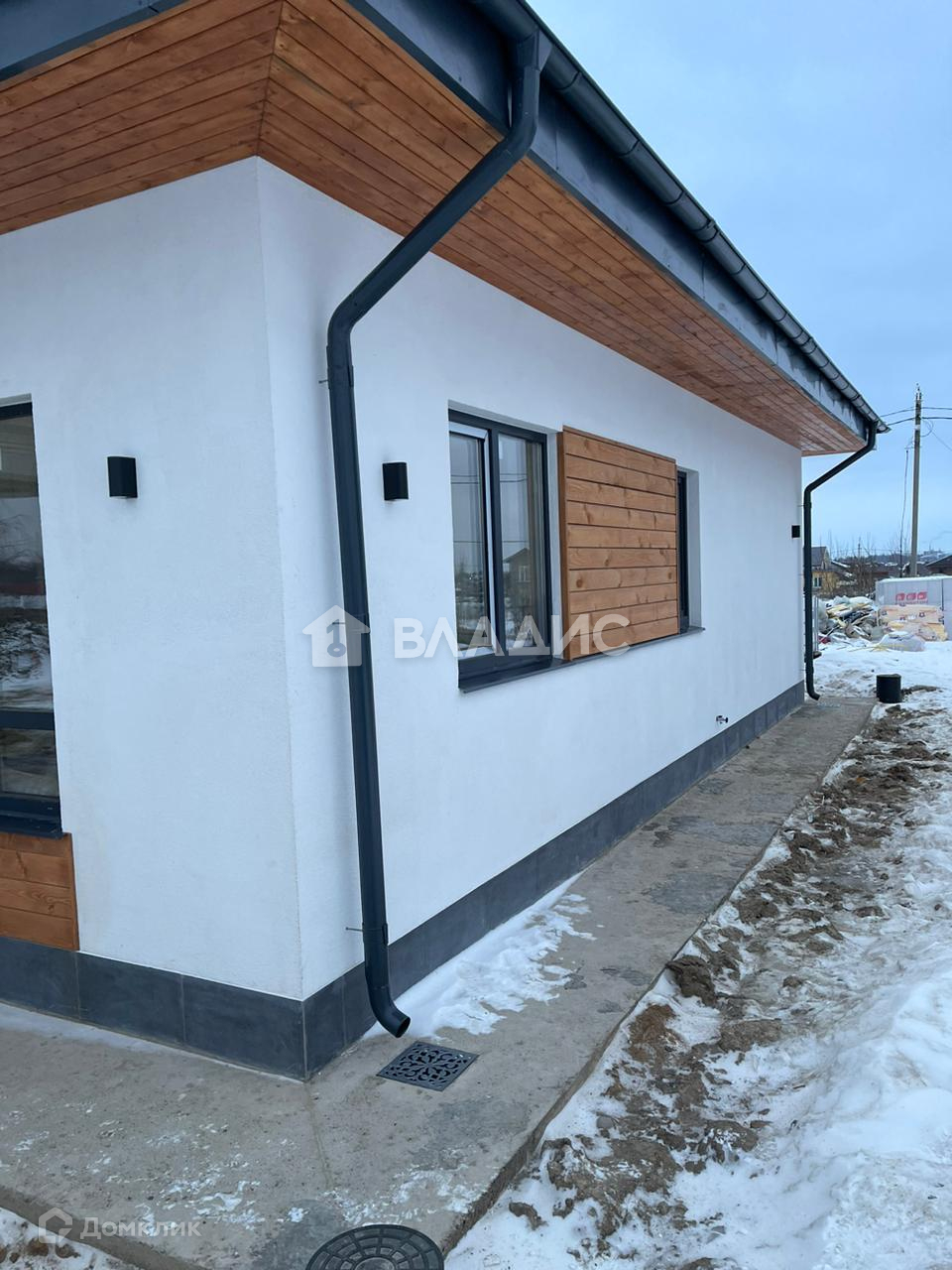 ▸ Фасад. Фасадная штукатурка + планкен + керамогранит. Декоративная подсветка. Отмостка из брусчатки. Дренажная система вокруг дома. Водосточная система.