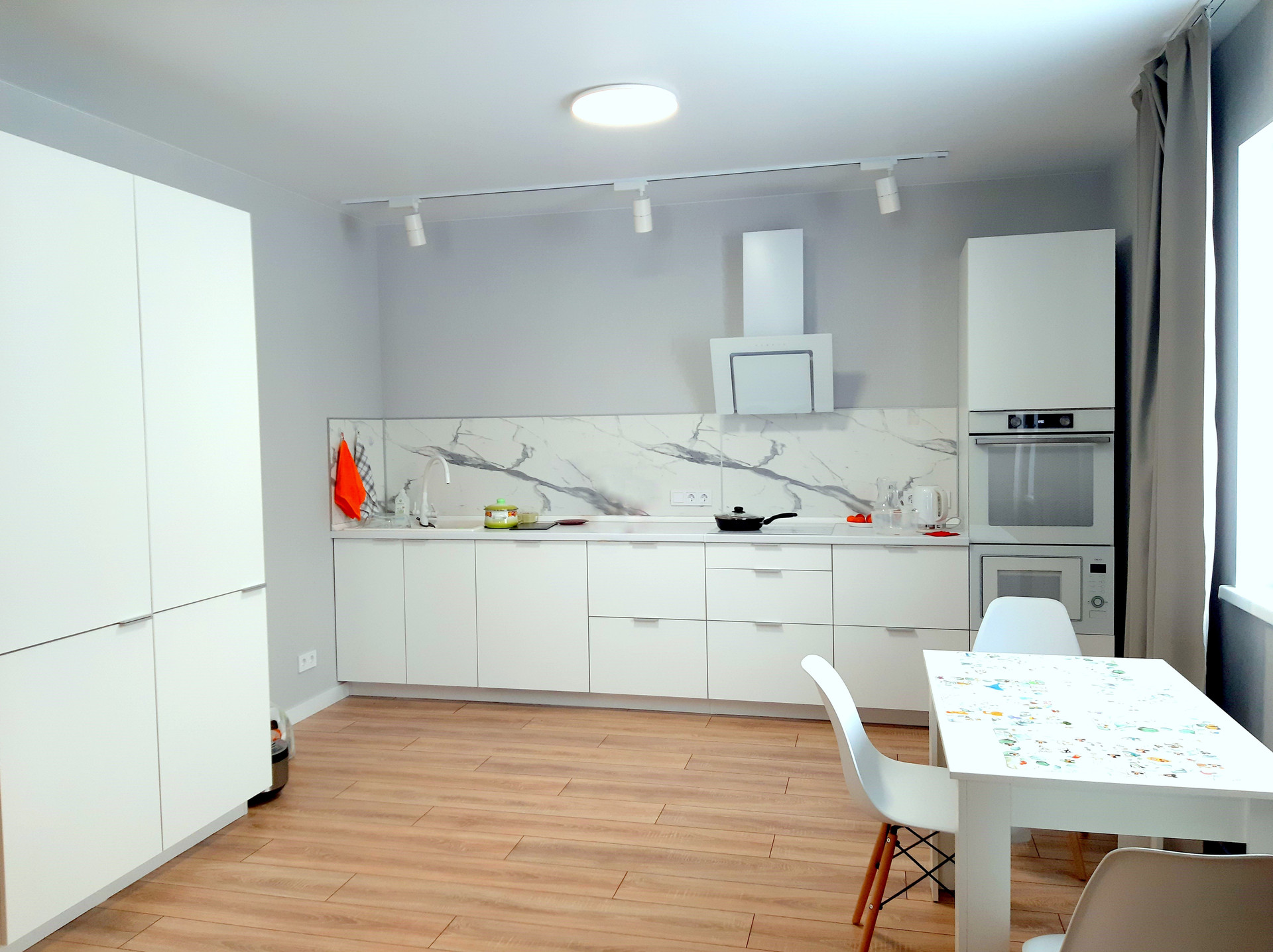 - Внутренняя отделка - ламинат, плинтуса, обои, матовый натяжной потолок, межкомнатные двери с фурнитурой, розетки, выключатели, конвекторы ballu, прихожая и с/узел (кафельная плитка с теплым полом);