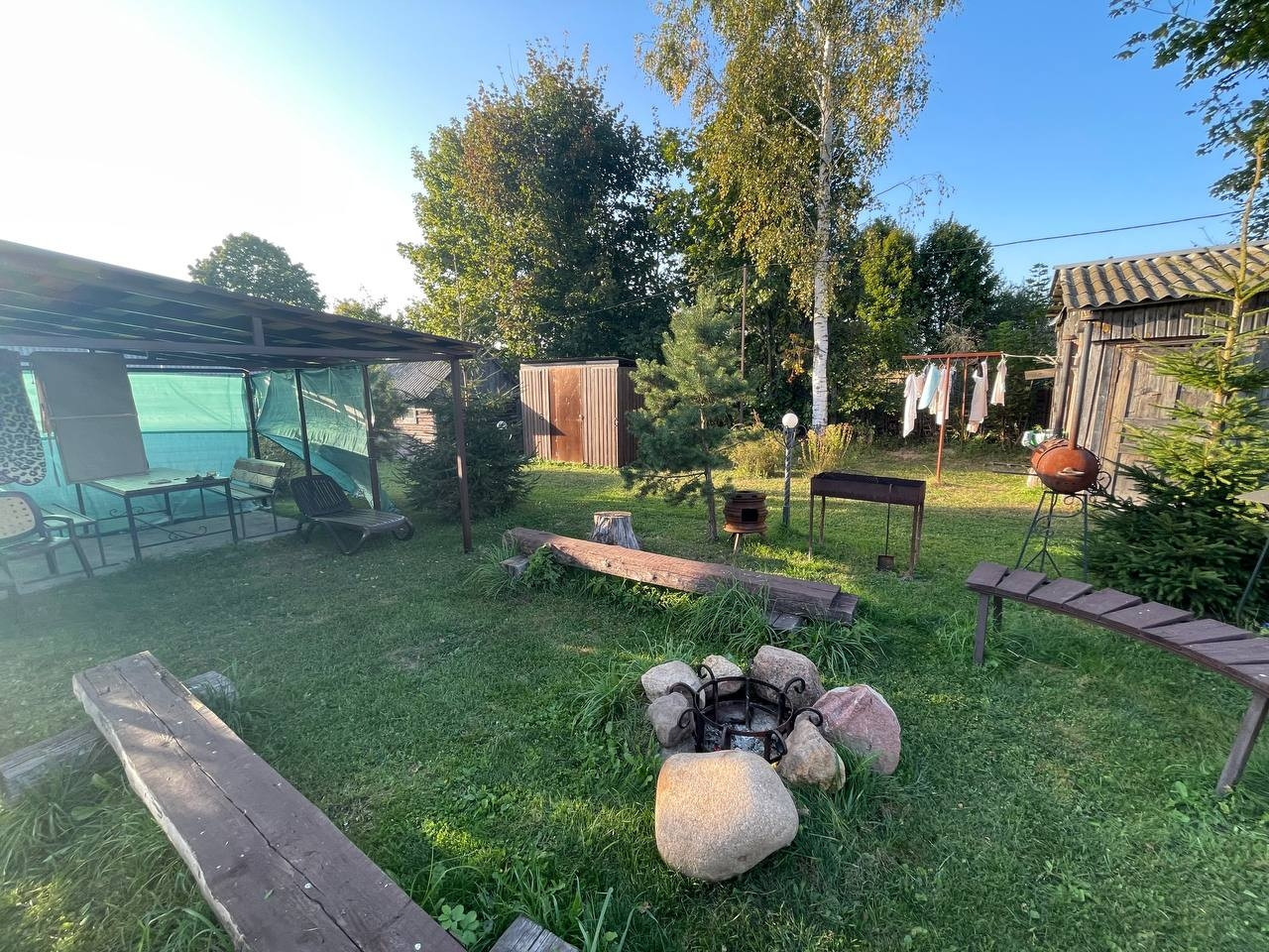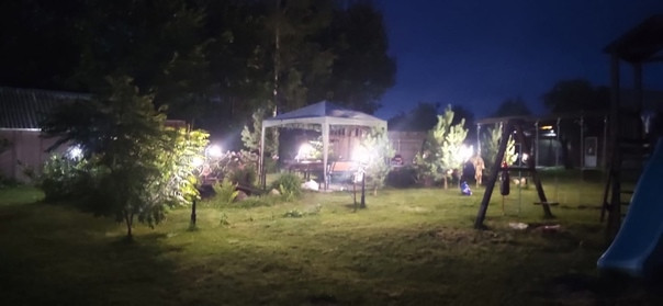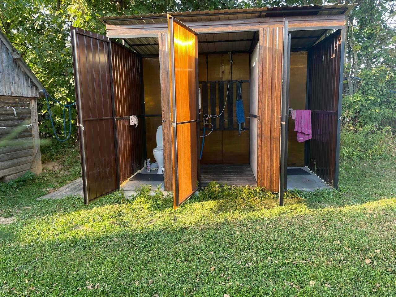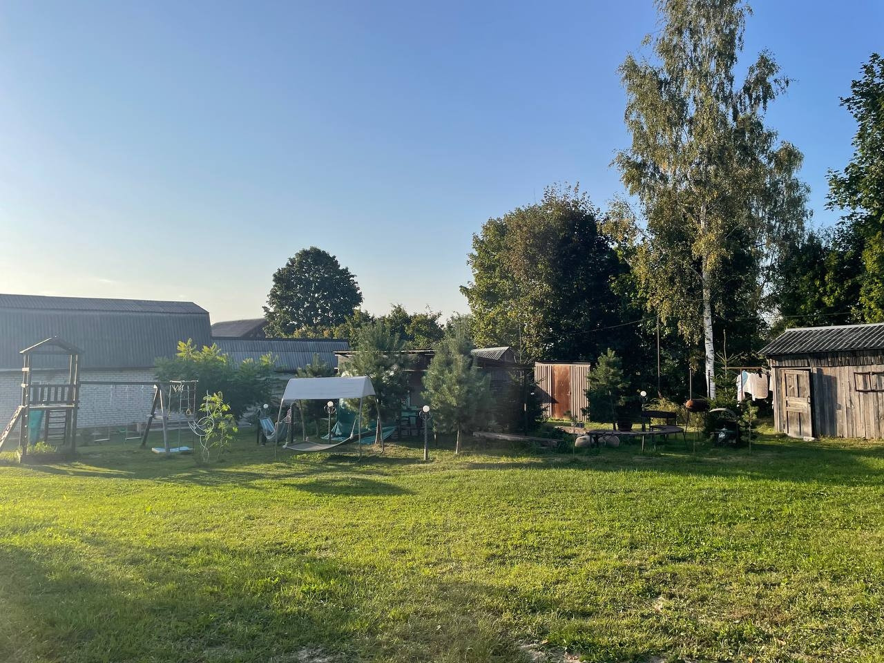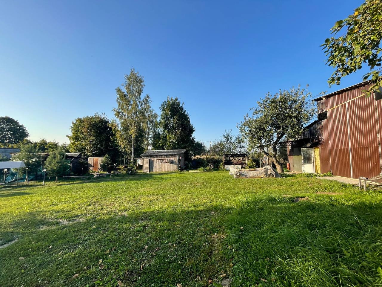 35 соток участок: на нём 2 гаража под ПРАКТИЧЕСКИ ЛЮБОЙ МУЖСКОЙ ВИД БИЗНЕСА-  380 В, 120 м. кв., две хозяйственные постройки, просторная зона отдыха для большой компании, мангалы, уличный камин, место для пляжного волейбола. 2 навеса, Детский комплекс, пруд с рыбой. Душ и туалет(унитаз),  раковина на улице, закрытые- вода выведена из дома с возможностью выставлять любую температуру воды! Моемся в нём с мая по сентябрь.+ санузел также есть в доме! На участке растут опята!