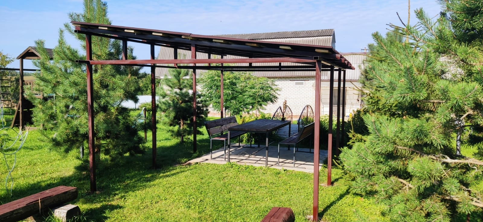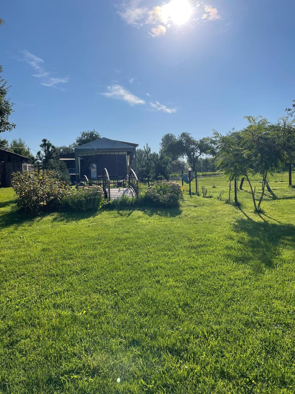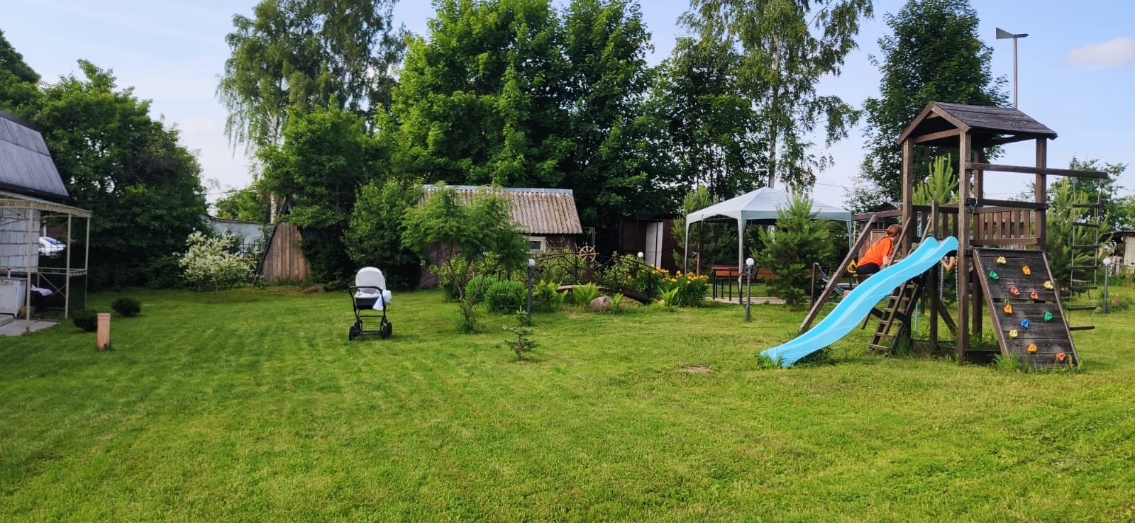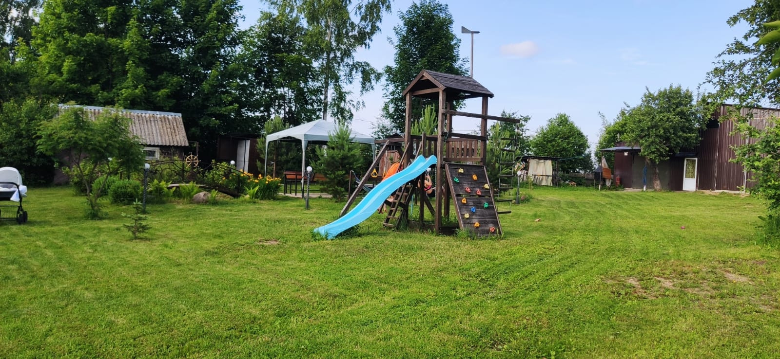 35 соток участок: на нём 2 гаража под ПРАКТИЧЕСКИ ЛЮБОЙ МУЖСКОЙ ВИД БИЗНЕСА-  380 В, 120 м. кв., две хозяйственные постройки, просторная зона отдыха для большой компании, мангалы, уличный камин, место для пляжного волейбола. 2 навеса, Детский комплекс, пруд с рыбой. Душ и туалет(унитаз),  раковина на улице, закрытые- вода выведена из дома с возможностью выставлять любую температуру воды! Моемся в нём с мая по сентябрь.+ санузел также есть в доме! На участке растут опята!