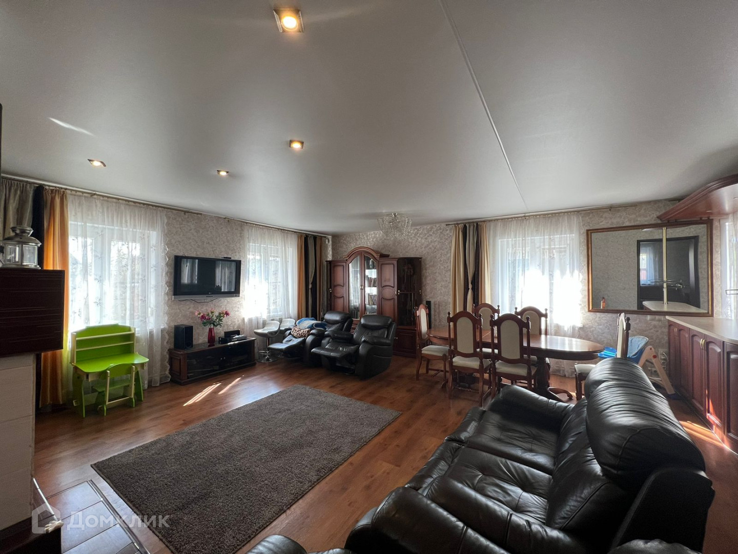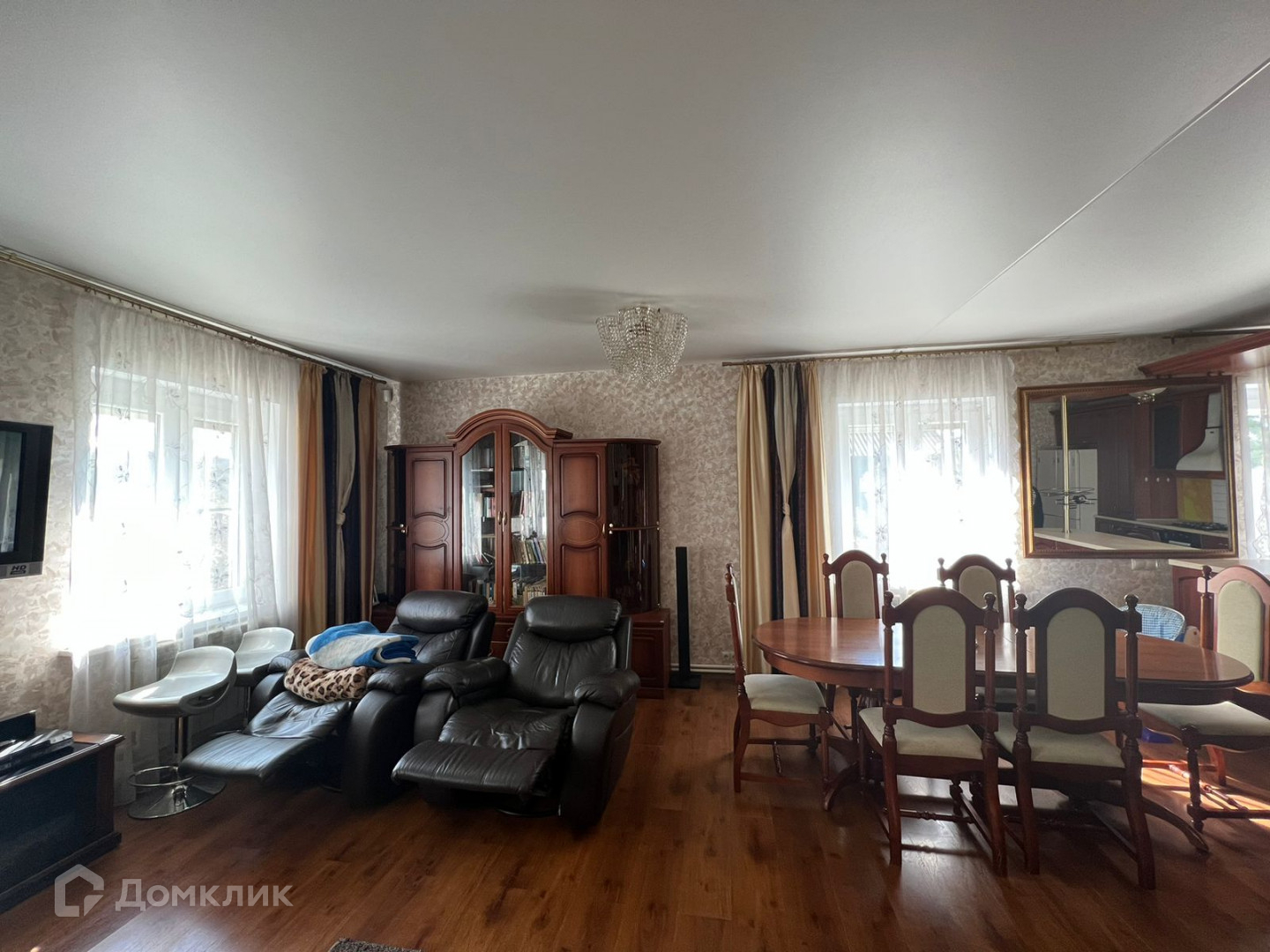 В доме 2 этажа. На первом этаже: входная группа, коридор, большая кухня гостиная 50 кв.м., где прекрасно вмещается зона приготовления еды, столовая зона и зона отдыха с камином, 3 комнаты, раздельный санузел. На втором этаже: зимний сад с панорамным остеклением, прекрасным видом на весь участок, зона отдыха с русским бильярдом и вместительными диванами. Вся МЕБЕЛЬ в доме ОСТАЕТСЯ.