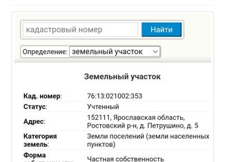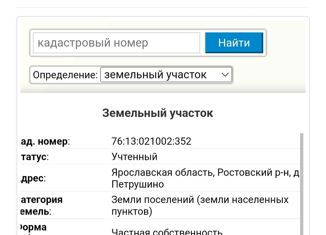 Земельный участок в д.Петрушино Ростовского района Ярославской обл, 10 км от г.Ростова, 45 км от г.Ярославль, есть электричество, колодец, ходят автобусы, планируется строительство газопровода |