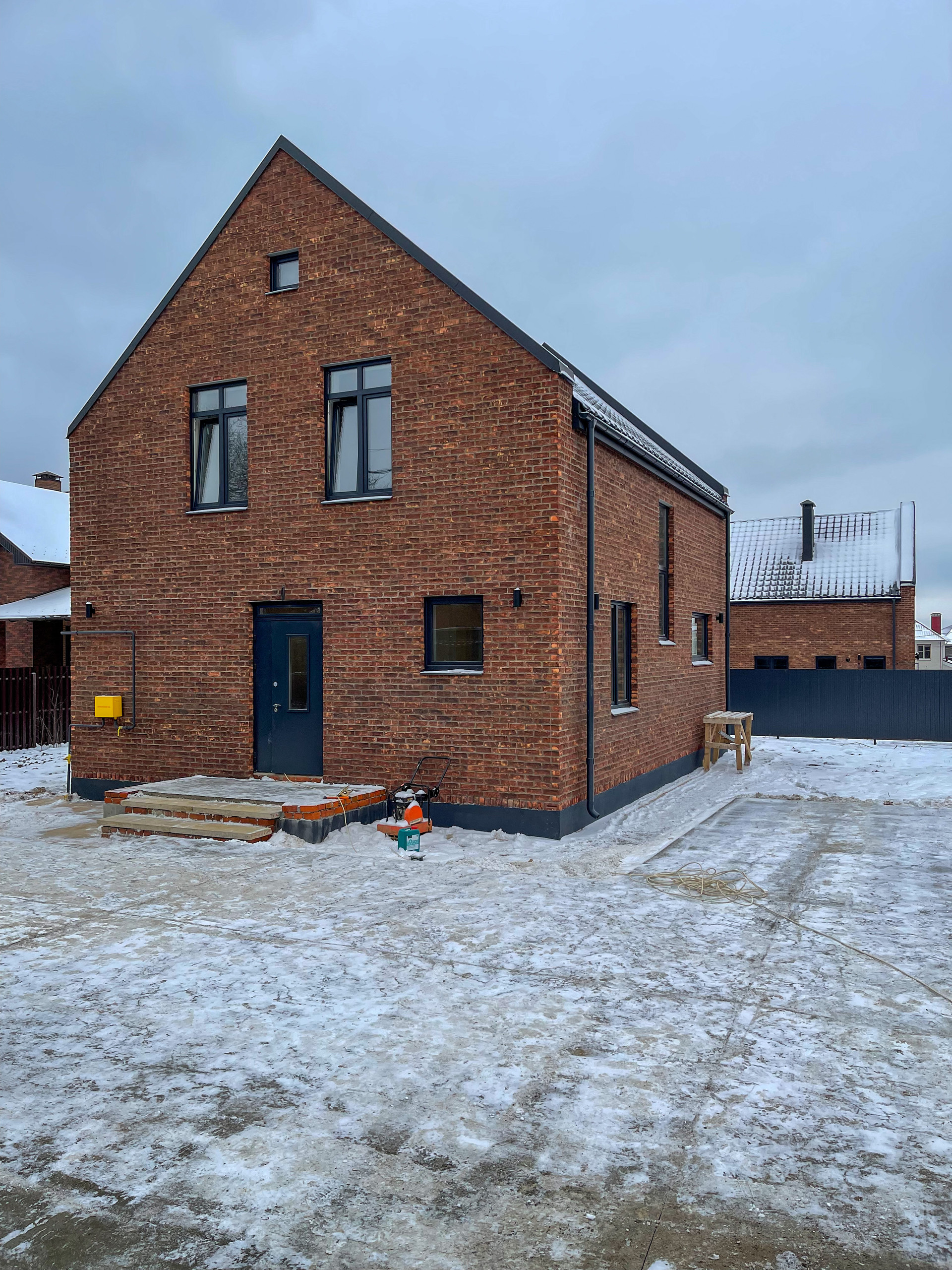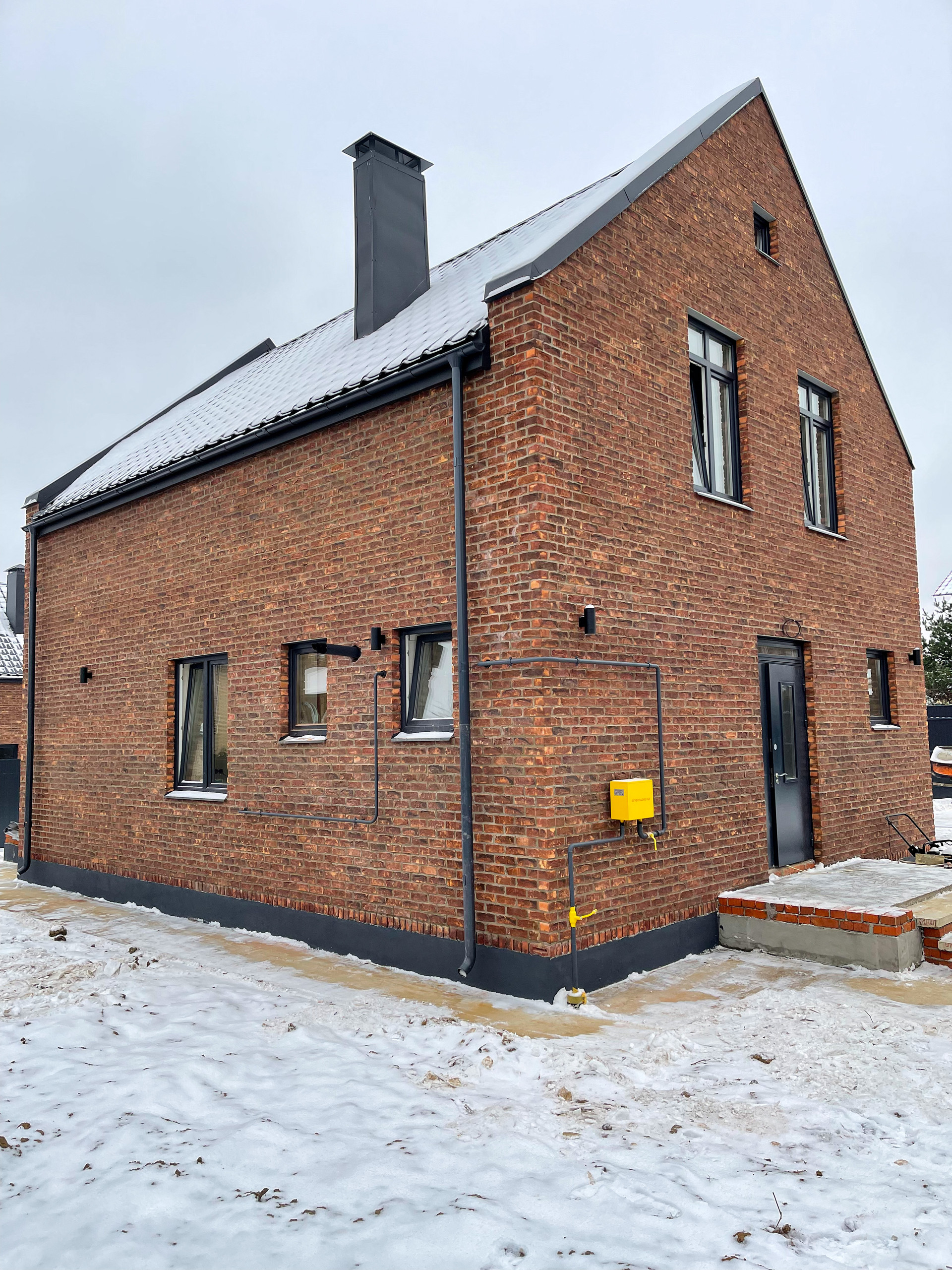 Лаконичный и современный стиль домов достигнут, благодаря фасаду из кирпича ручной формовки и кровле, покрытой металлочерепицей Венеция.