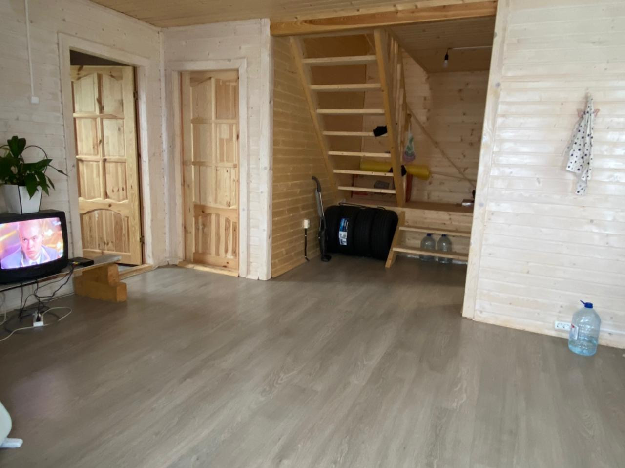 На первом этаже: просторная кухня- гостиная, комната, ванная комната, прихожая, холл.