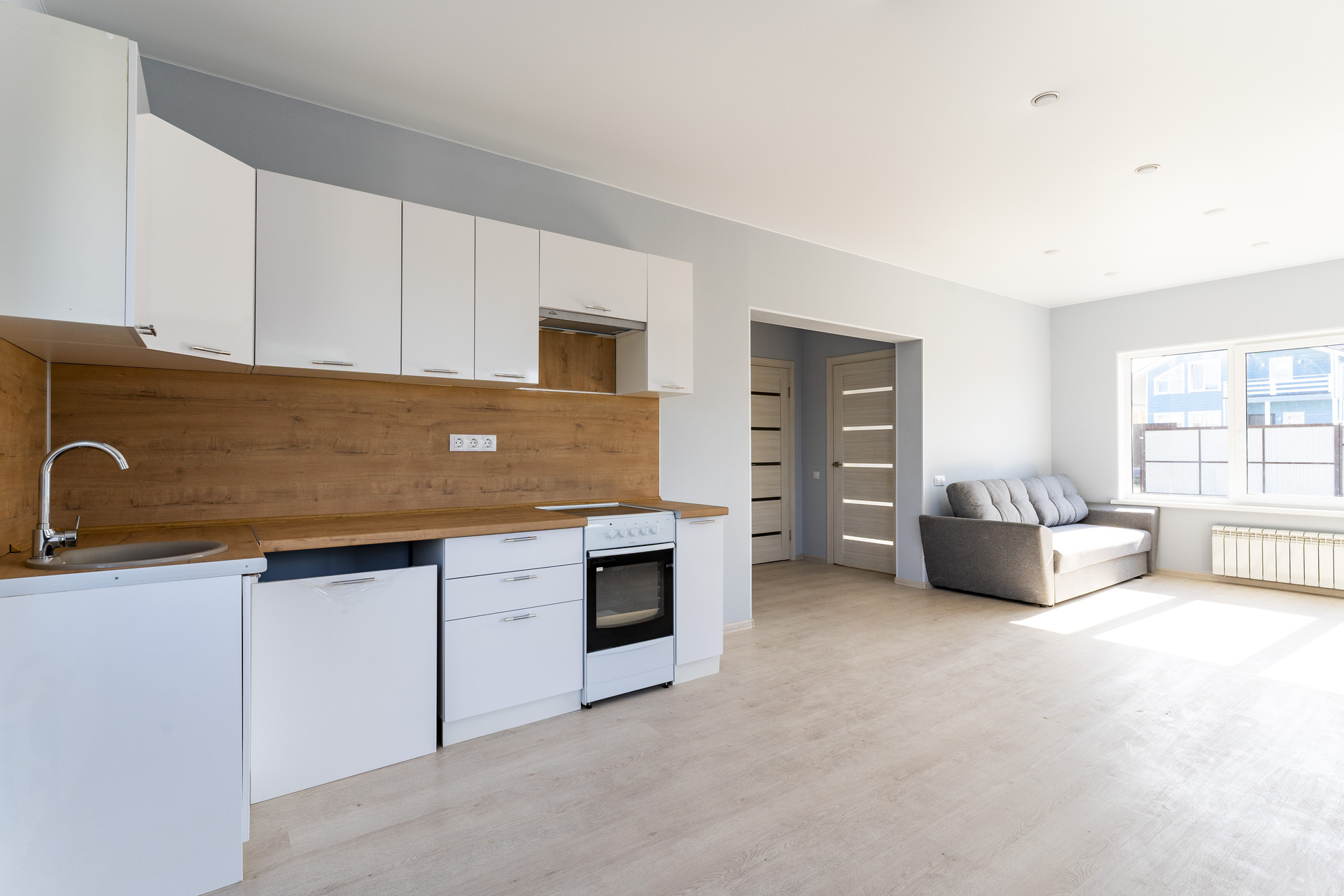 • полностью оборудованная кухня с встроенной варочной панелью и встроенным духовым шкафом