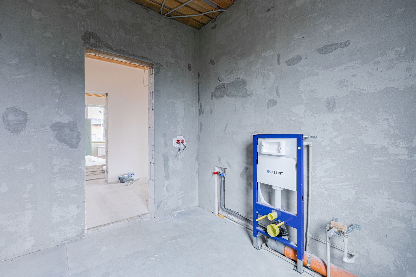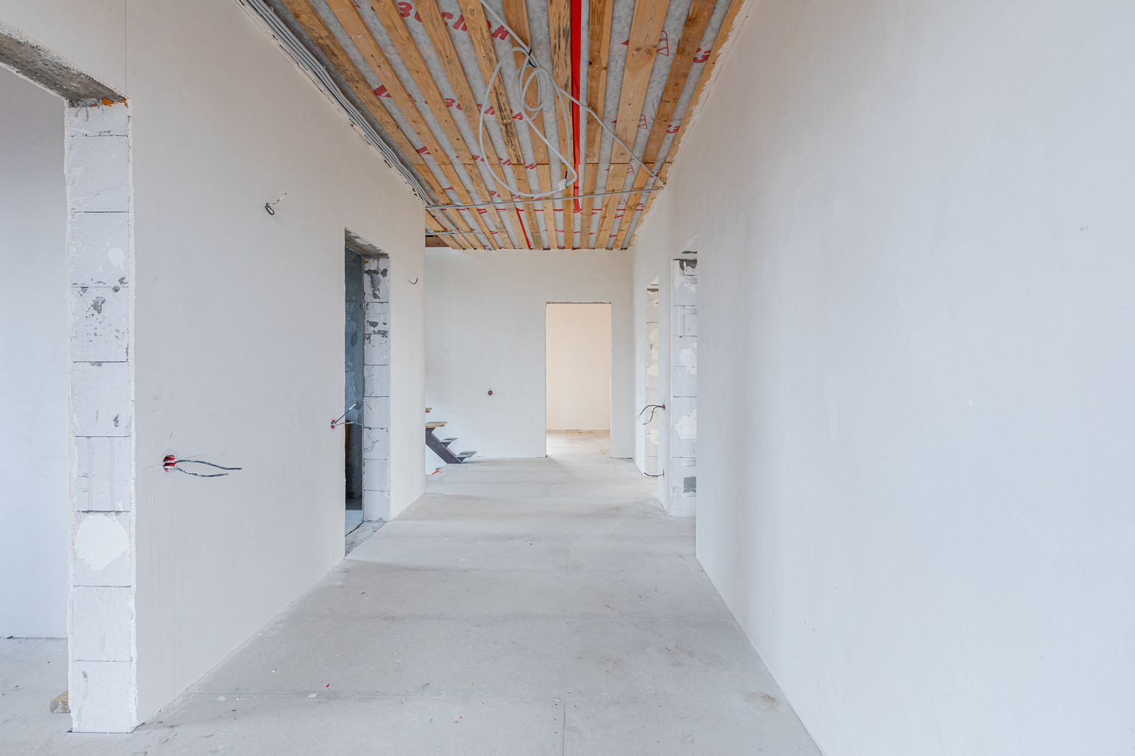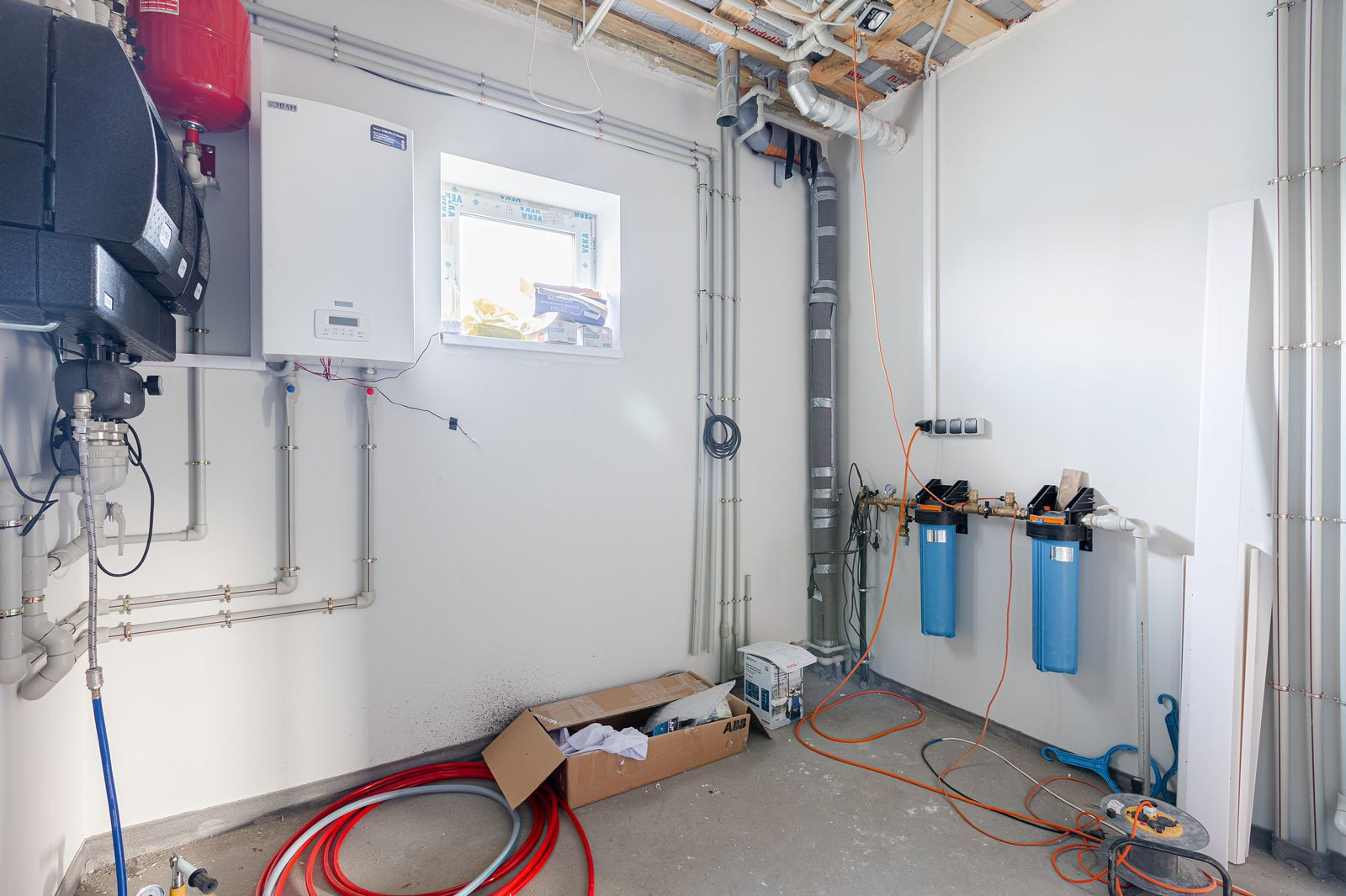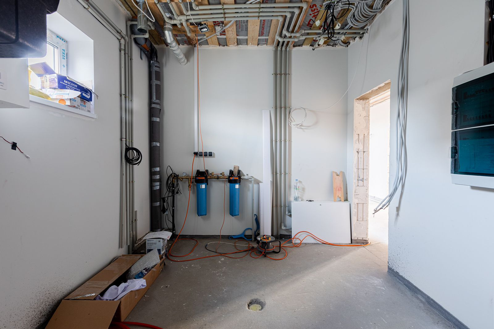Все коммуникации заведены в дом и подключены. Батареи и теплый пол подключены. Электроразводка выполнена по всему дому в соответствии с проектом.
