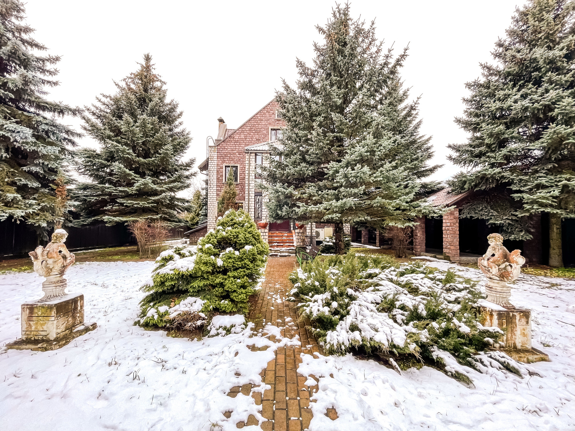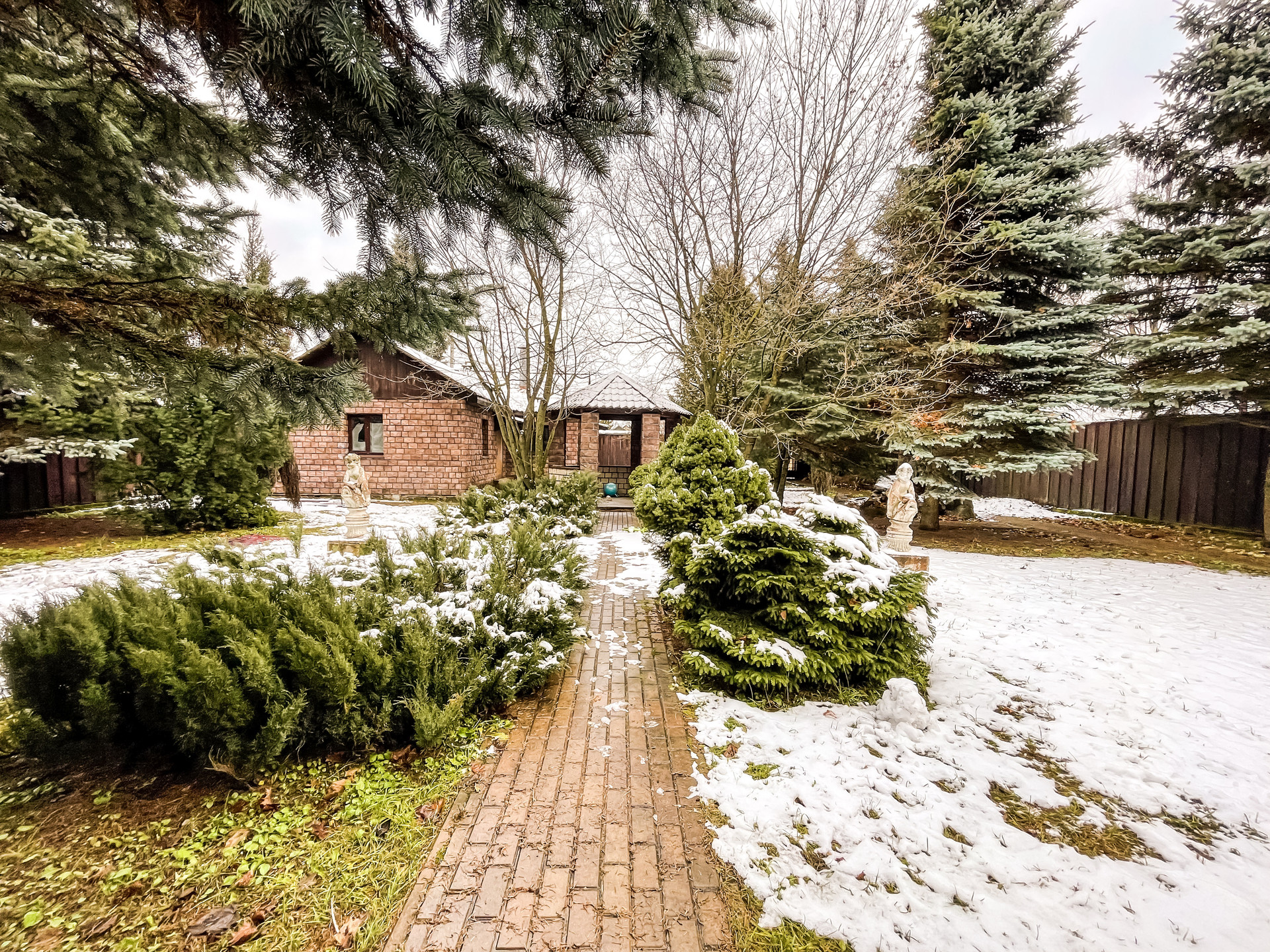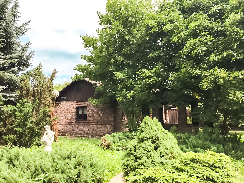 На участке в 15 соток высажены высокие круглогодично зеленые ели, сосны, выстелен газон, произведен ландшафтный дизайн, установлены декоративные статуи, выполненные специально на заказ. Установлена беседка, отдельно выстроенное здание на участке можно использовать под летнюю кухню или русскую баню.