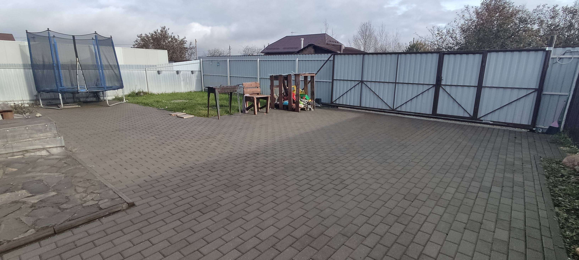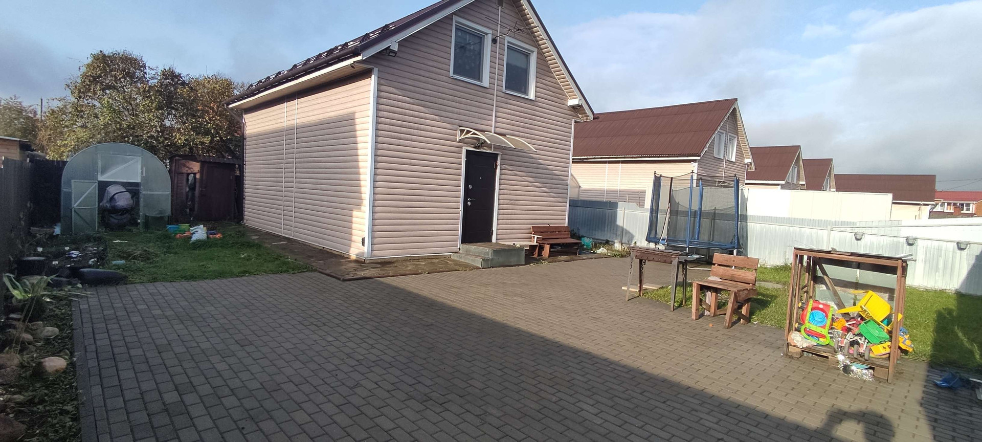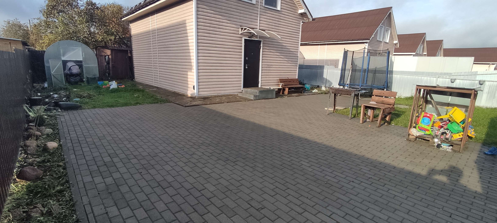 На участке сделана отмостка по периметру дома, брусчатка для авто и остального, ворота откатные с мотором, теплица 3*5, сарай 1*1.