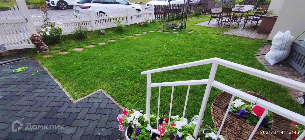Придомовая территория: огорожена забором, уложен рулонный газон, высажены цветущие растения (розы, пионы, гортензии).