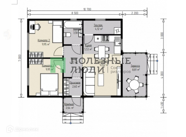 Планировка 2+: кухня-гостиная, 2 комнаты, совмещенный санузел, техническое помещение и терраса.