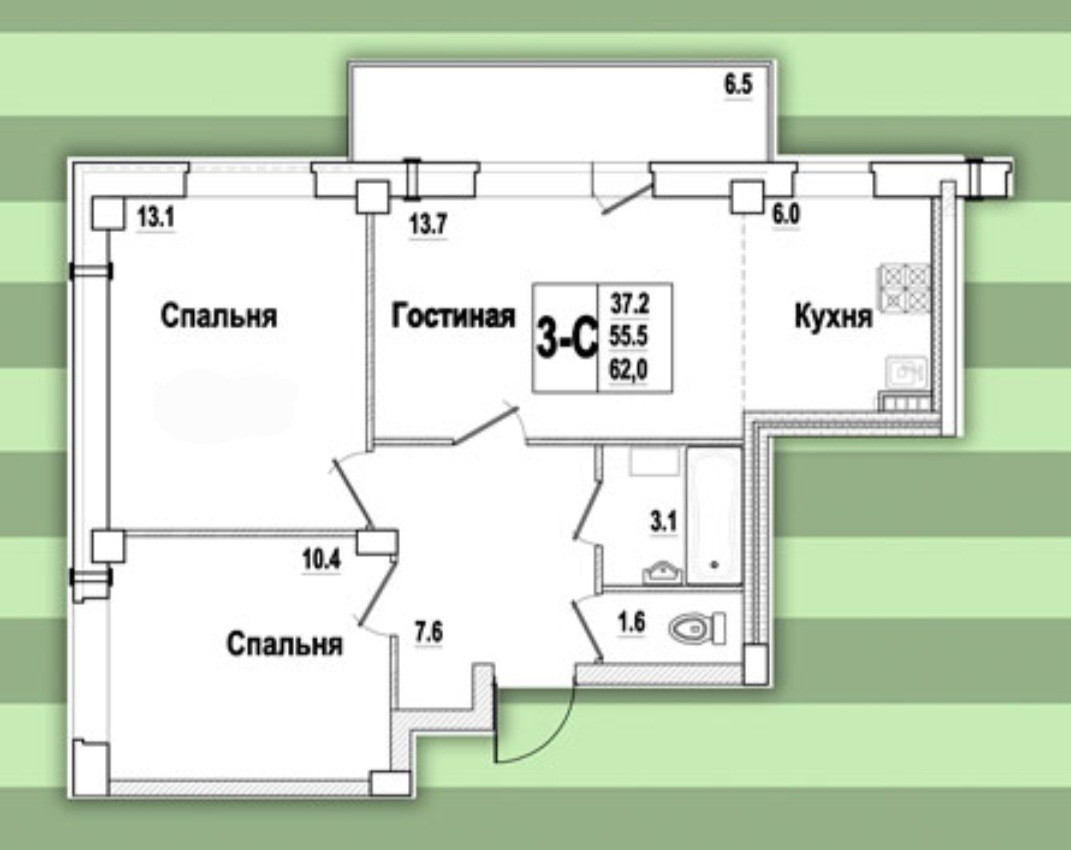 Площадь общая - 62.0 м
