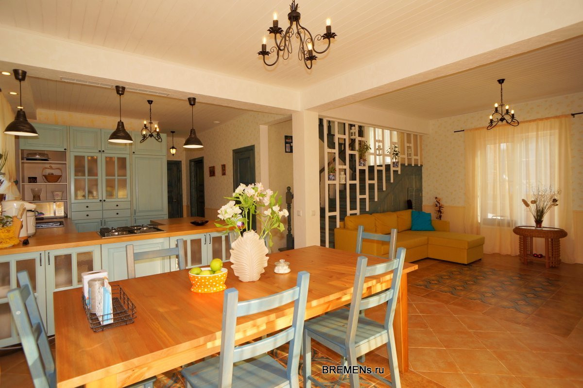 На 1 этаже – большая кухня-столовая-гостинная с выходом на солнечную крытую террасу с южной стороны дома и прямым видом на реку, гостевая спальня 10 кв.м. и санузел рядом, гардеробная комната, технические и подсобные помещения.