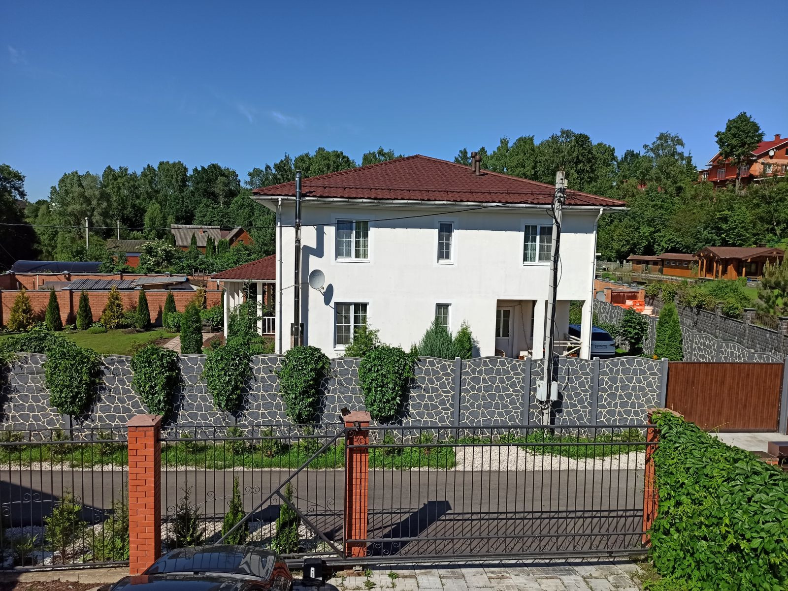 Снаружи дома установлено 5 камер видеонаблюдения, спутниковое телевидение НТВ+ или триколор, эфирное телевидение DVB-T2, также подключен интернет и устройства умного дома. Есть также сигнализация с защитой от проникновения.
