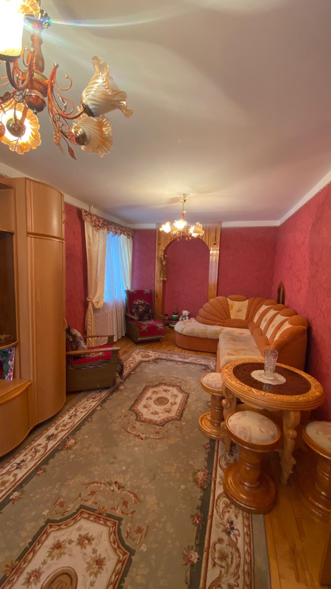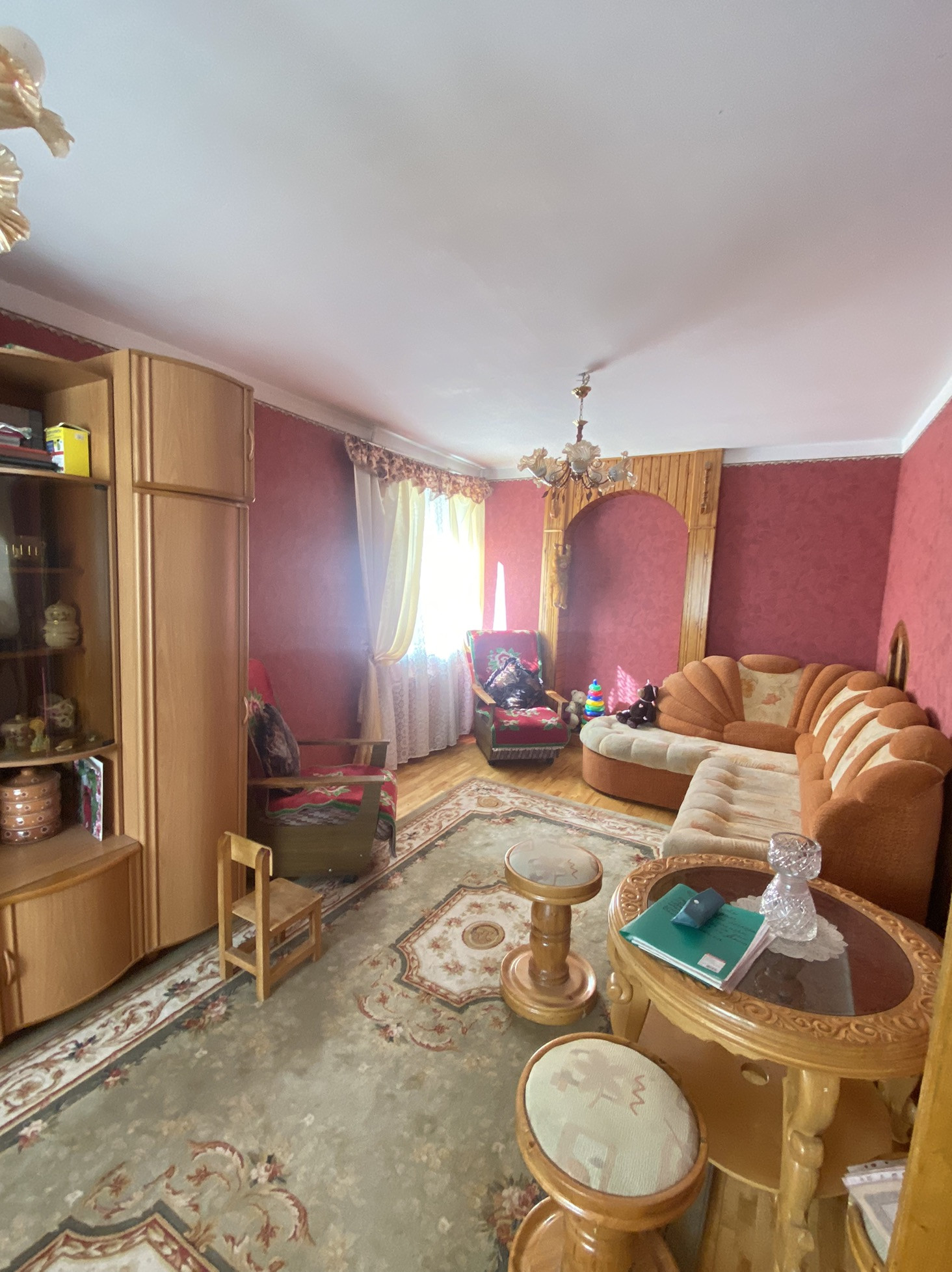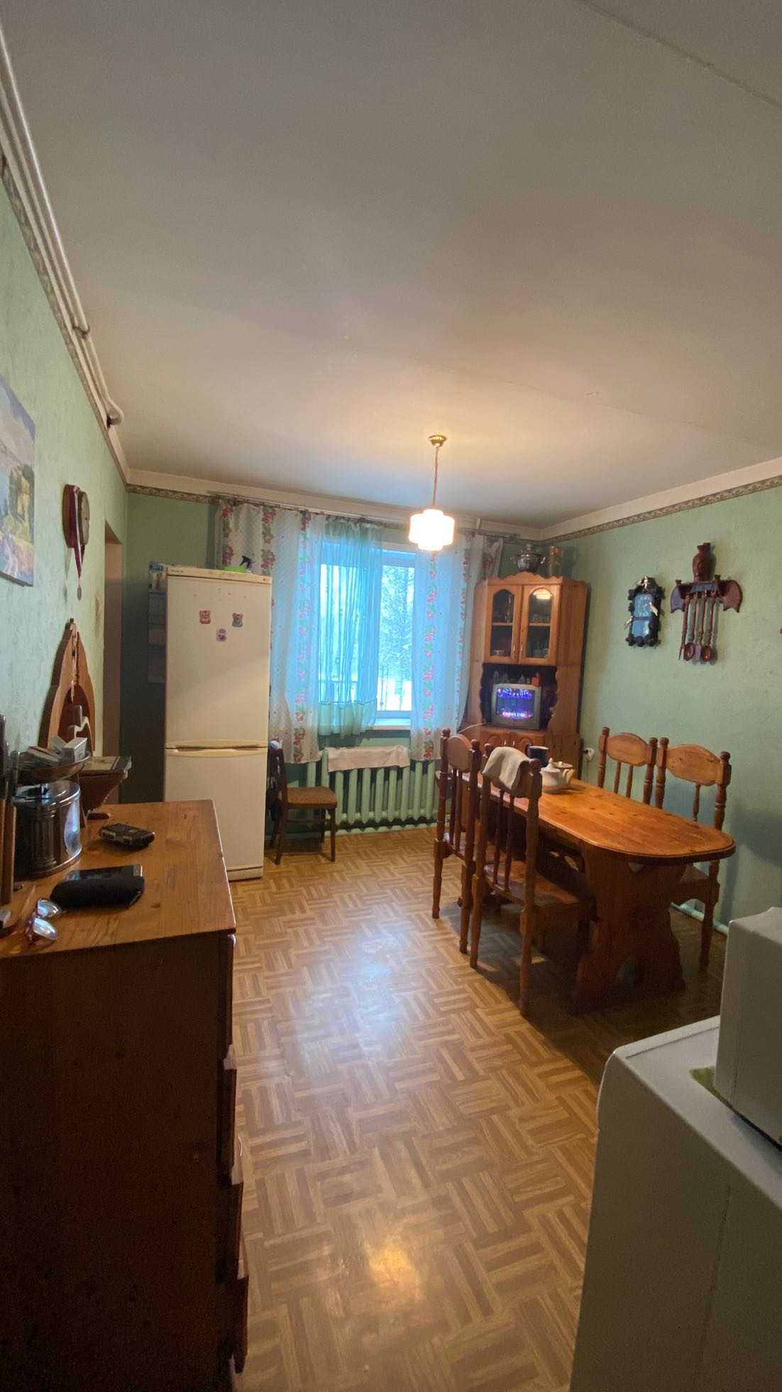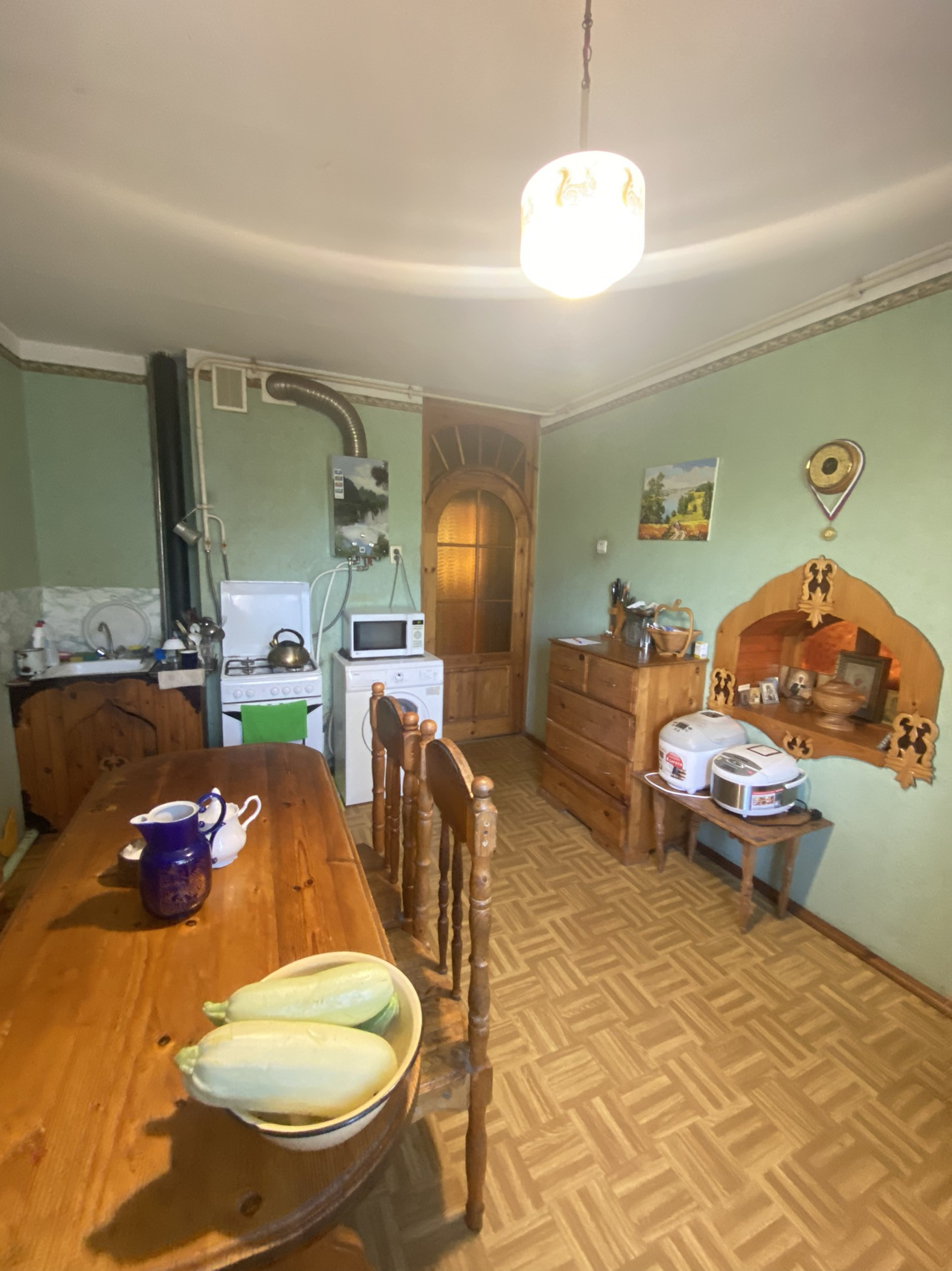 Пол в доме, гостиная-паркетная доска, коридор и комнаты: ДСП, сверху ДВП и линолеум. Двери во всех комнатах: деревянные (сосна). Остаётся вся мебель)))