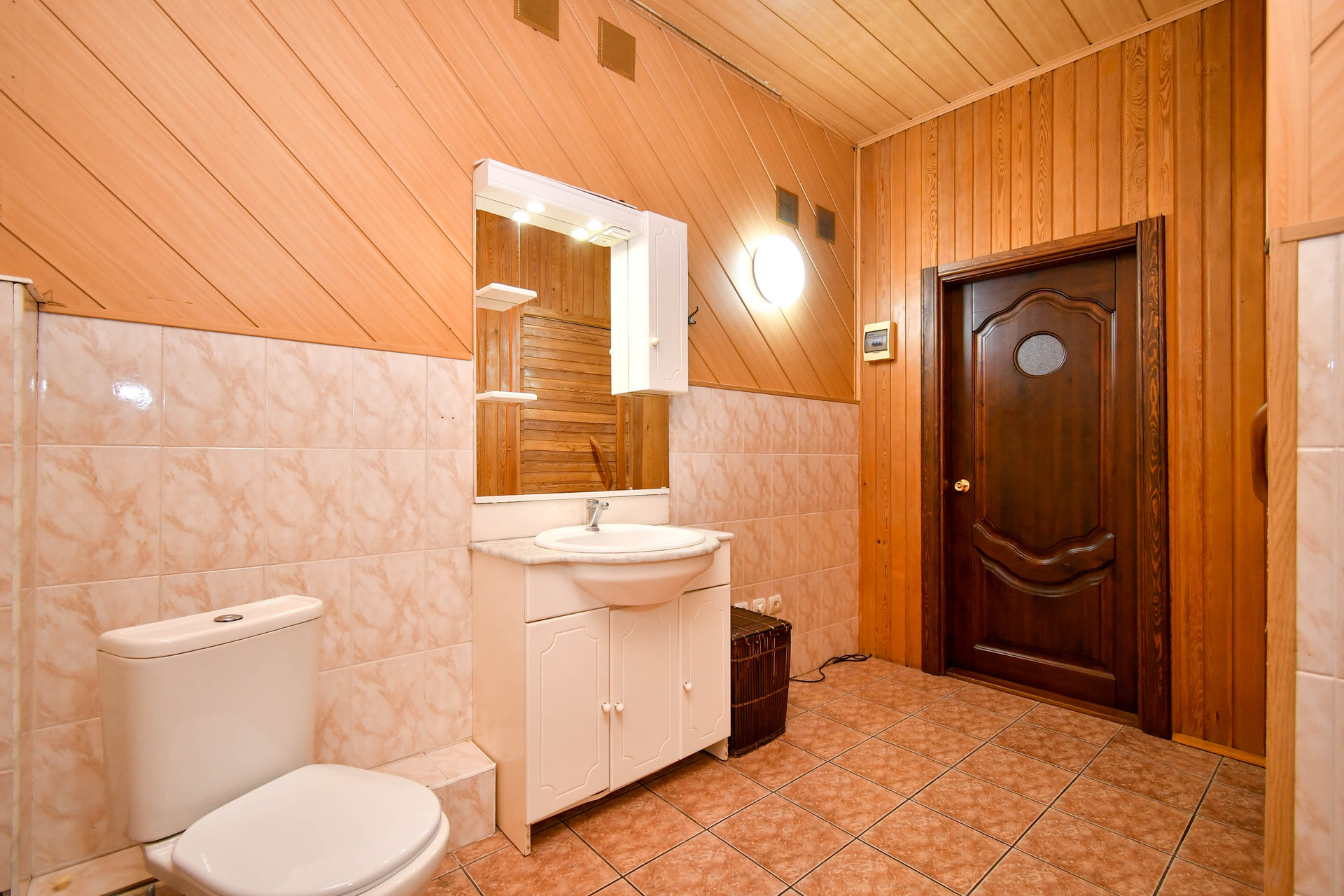 Цокольный этаж: гараж 19,8 м.кв; болейрная 7,2 м.кв; кладовая 4,8 м.кв; большая комната (раньше использовалась как тренажерный зал, сейчас библиотека) 33,3 м.кв; подсобное помещение 8,5 м.кв; (фото по запросу)