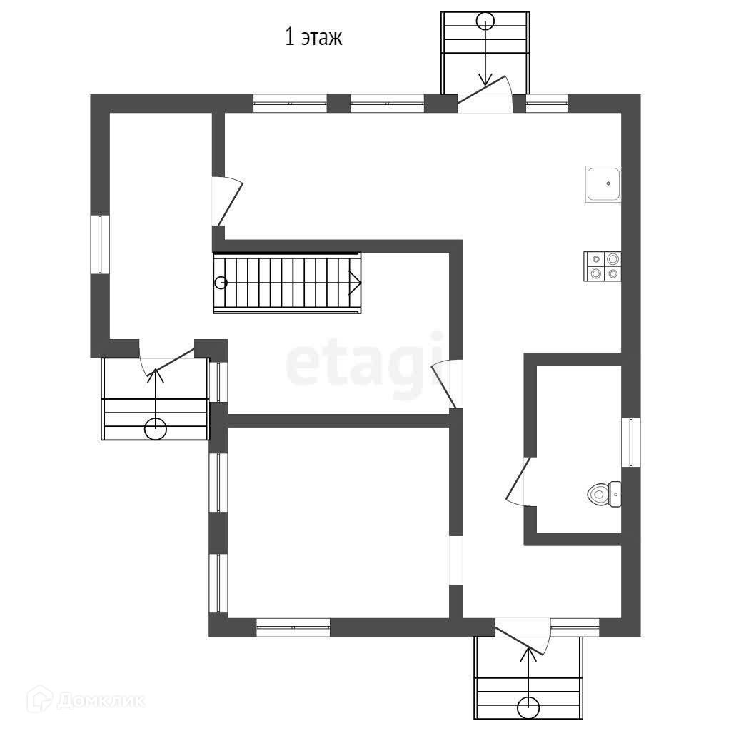На первом этаже кухня-гостиная, санузел, комната и 2 прихожих. На втором мансардном этаже 2 спальни.