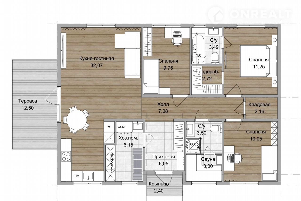 - Расположение всех помещений на одном этаже создает дополнительный комфорт и исключает необходимость перемещаться с этажа на этаж.