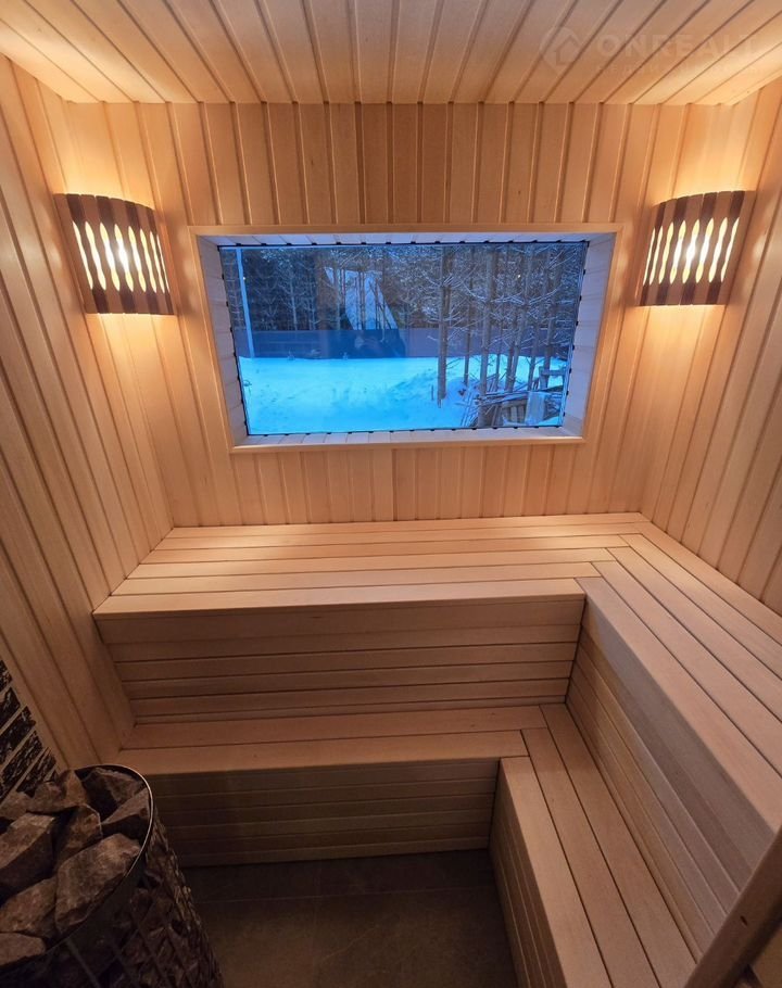 Сауна обшита вагонкой и обустроена деревянными полками из экологически чистой доски породы липа, отапливается электрокаменкой финского бренда Наrviа мощностью 9 кВт, рассчитанной на объем помещения. Управление с пульта. Повышение влажности воздуха в помещении парной достигается путем единовременной подачи воды на раскаленные камни. В сауне видовое окно с напылением, обладающее отражающей способностью.