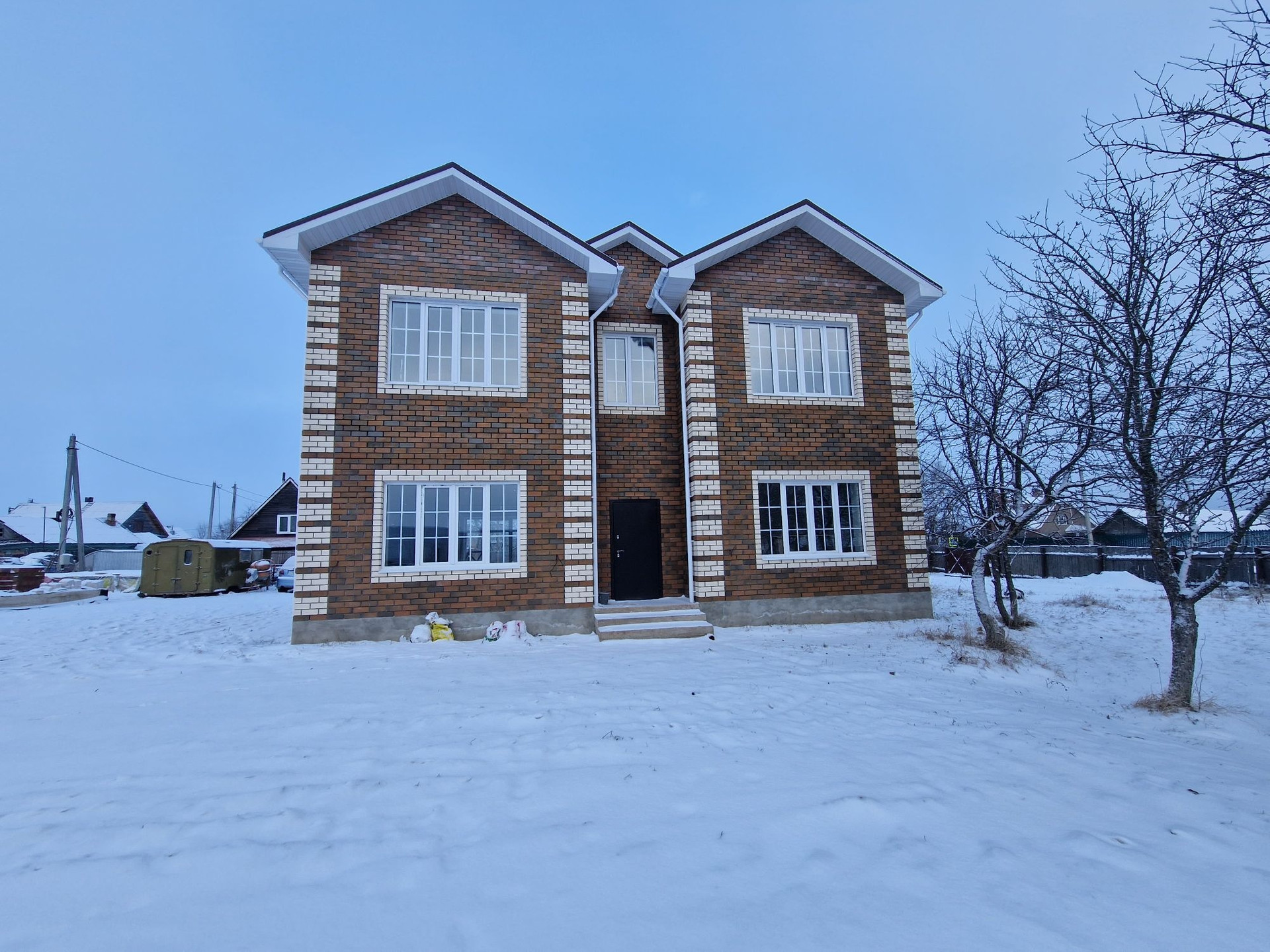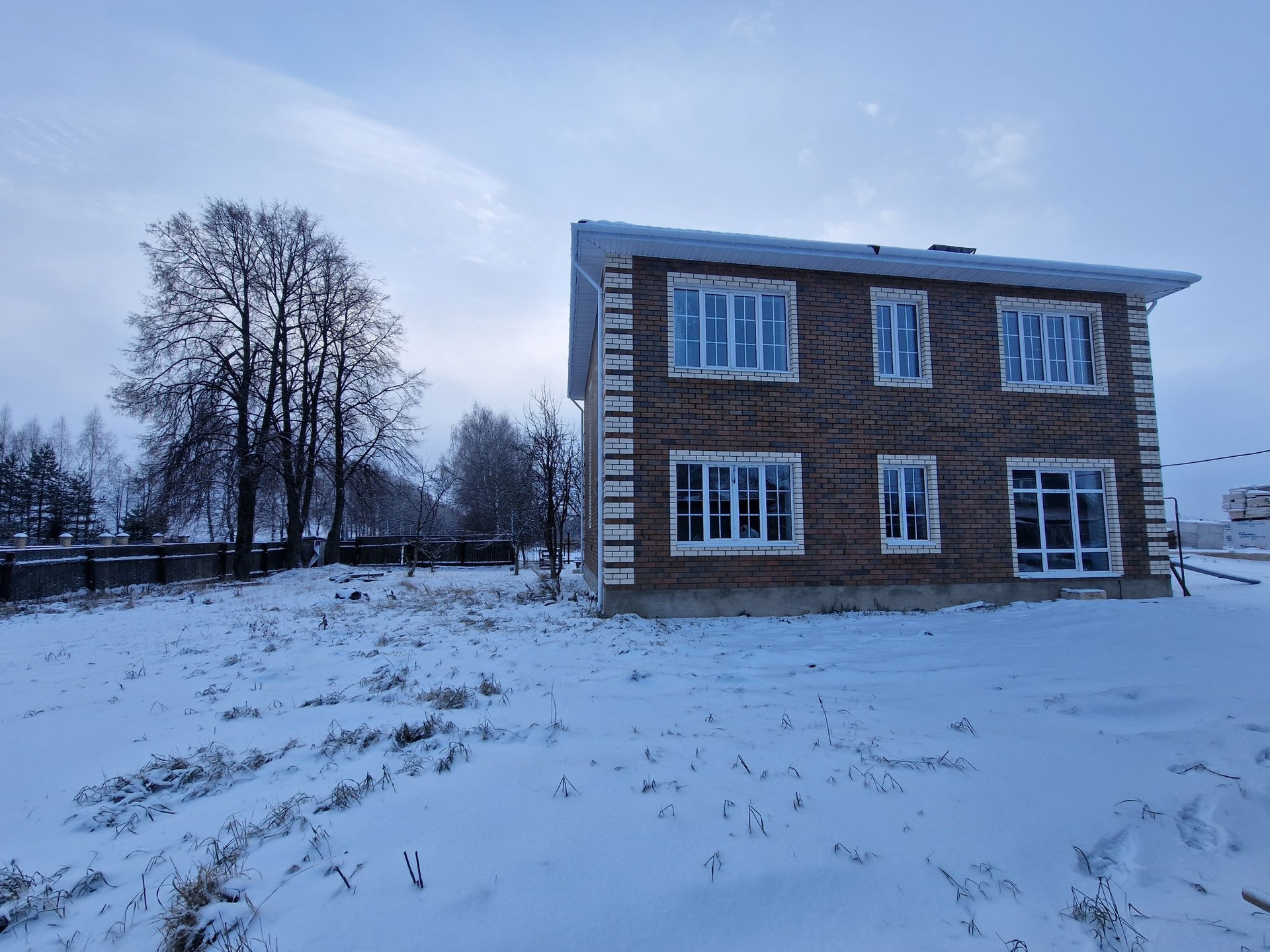 В рамках индивидуального проекта выполнено: строительство конструктива с применением качественных дорогих материалов: стены = блок+кирпич с металлическим блеском, баварской кладкой, перекрытия = плиты, Окна Пвх с раскладкой (открываются по принципу «ставней»), кровля = эксклюзивная матовая металлочерепица.