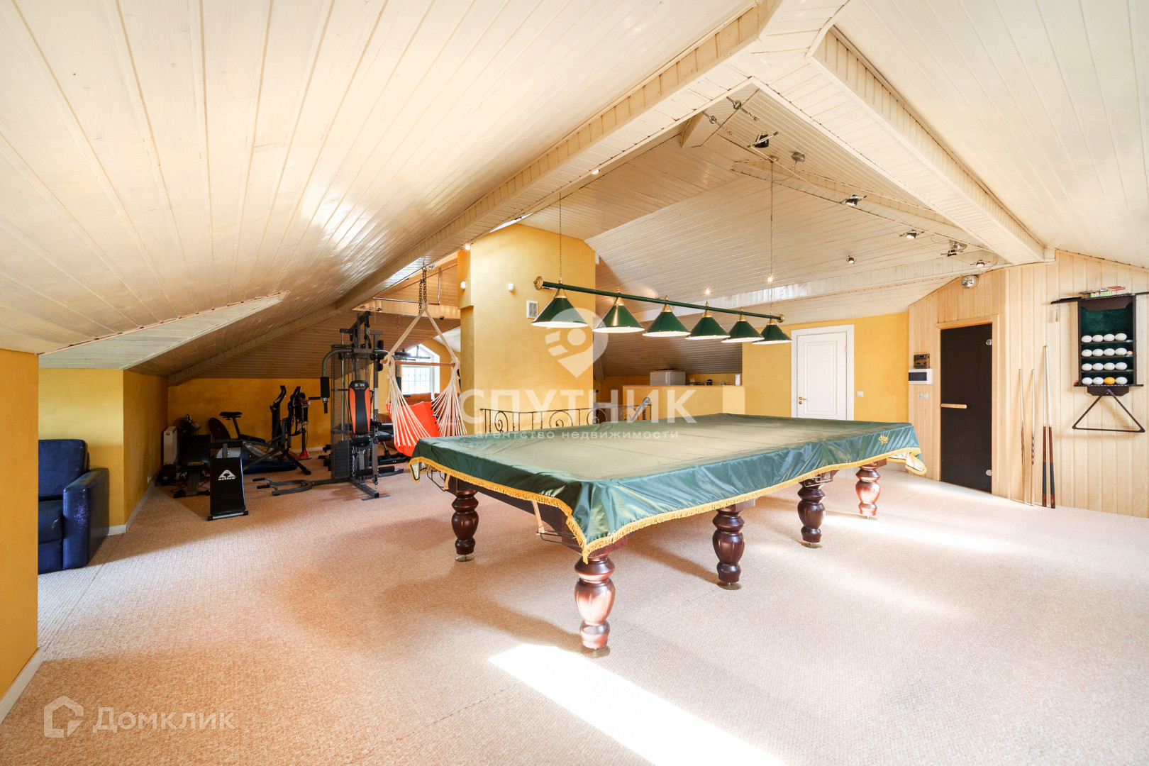 На мансардном этаже общее помещение для отдыха, включающее в себя: спортзал, бильярдную, сауну, сан.узел