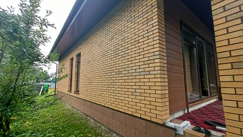 Наружные стены облицованы кирпичом РУСТИК (ЛСР) с вентиляционным зазором 20 мм.
