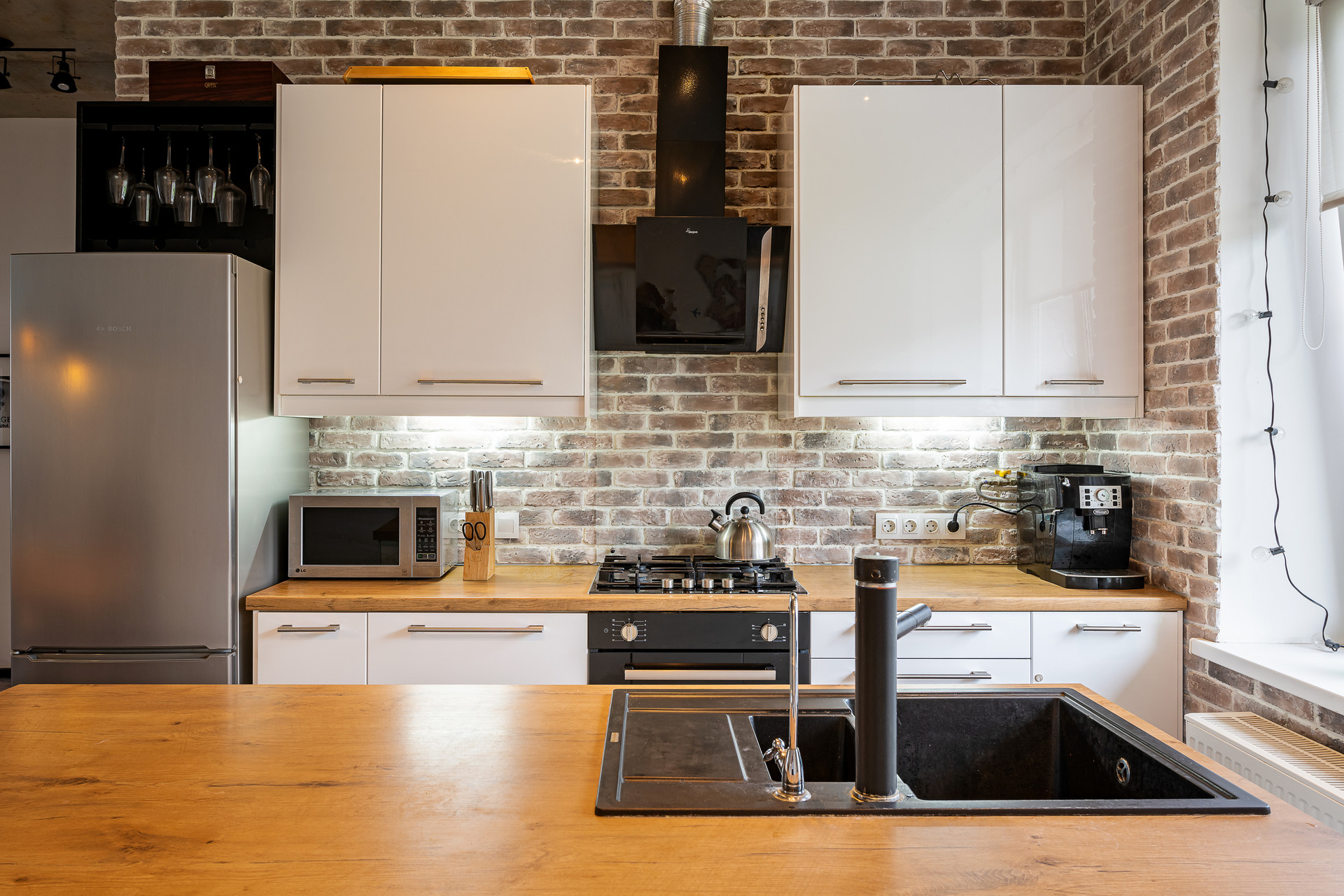 На первом этаже таунхауса расположена прихожая, кухня-гостиная, санузел. Высота (h) от пола до потолка 3,13 м. Кухня меблирована и оснащена техникой. Водяной подогрев пола в санузлах. Ремонт выполнен в стиле Лофт. Выход из кухни-гостиной позволяет оказаться на придомовой территории, где обустроена зона отдыха с шезлонгами и барбекю.