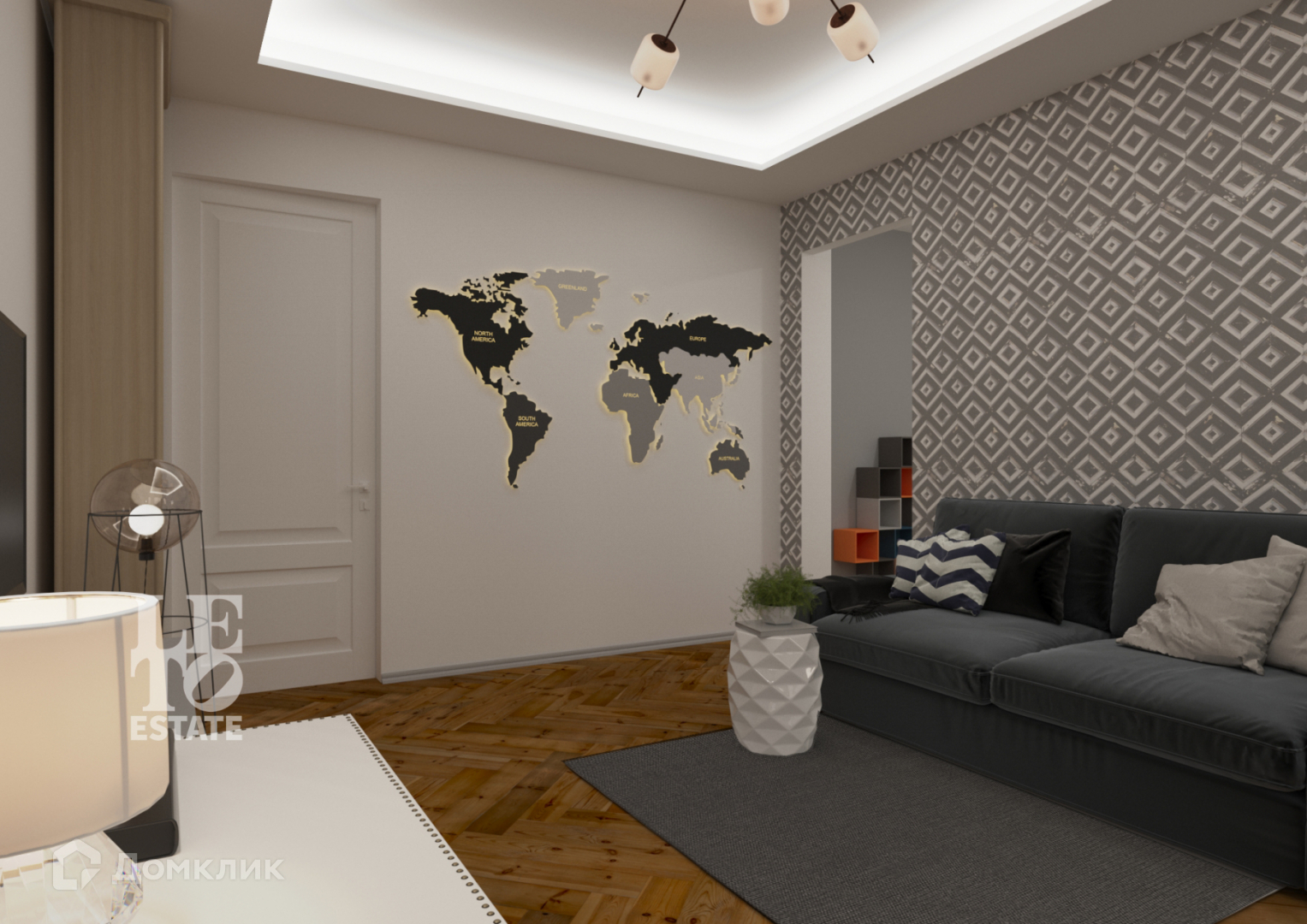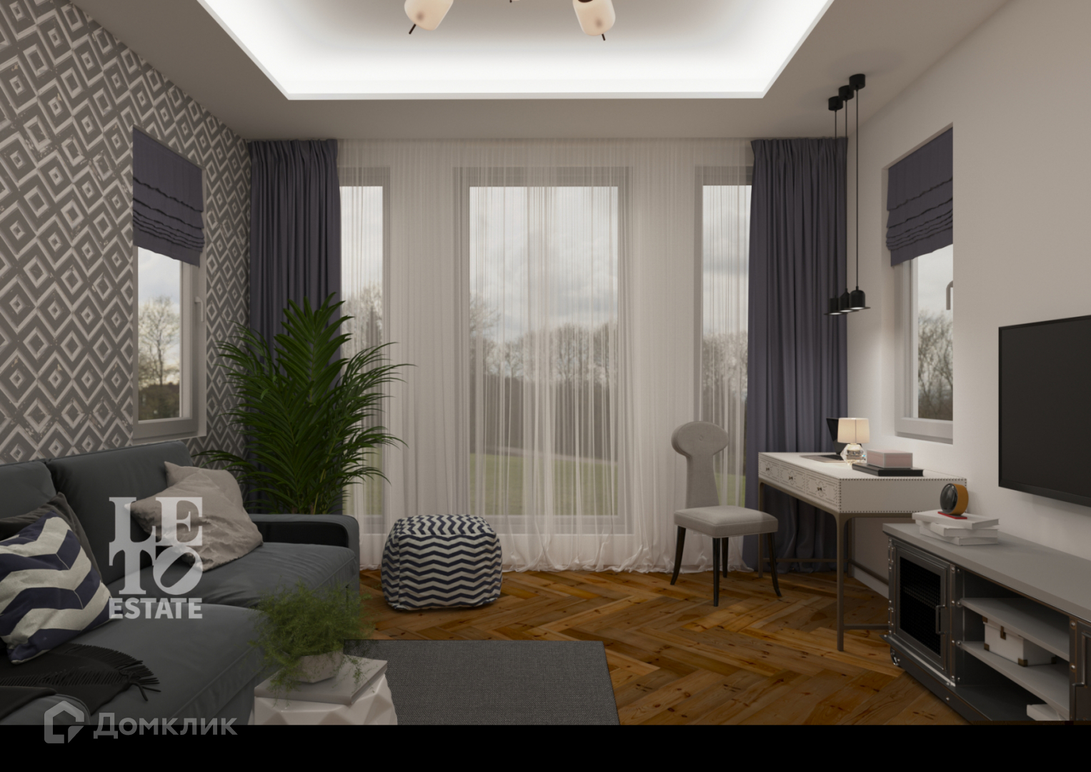 Первый этаж - прихожая, гардеробная, гостевой с/у, кухня-гостиная-столовая с выходом на террасу, гостевая спальня, кабинет, гараж на 2 м/м.