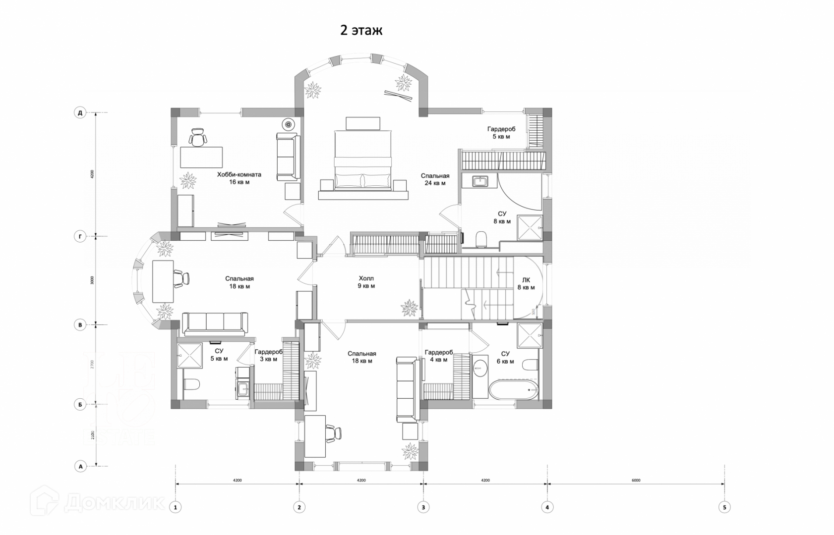 Второй этаж - мастер спальня со своей гардеробной, с/у, кабинетом, две спальни со своим с/у и гардеробной.
